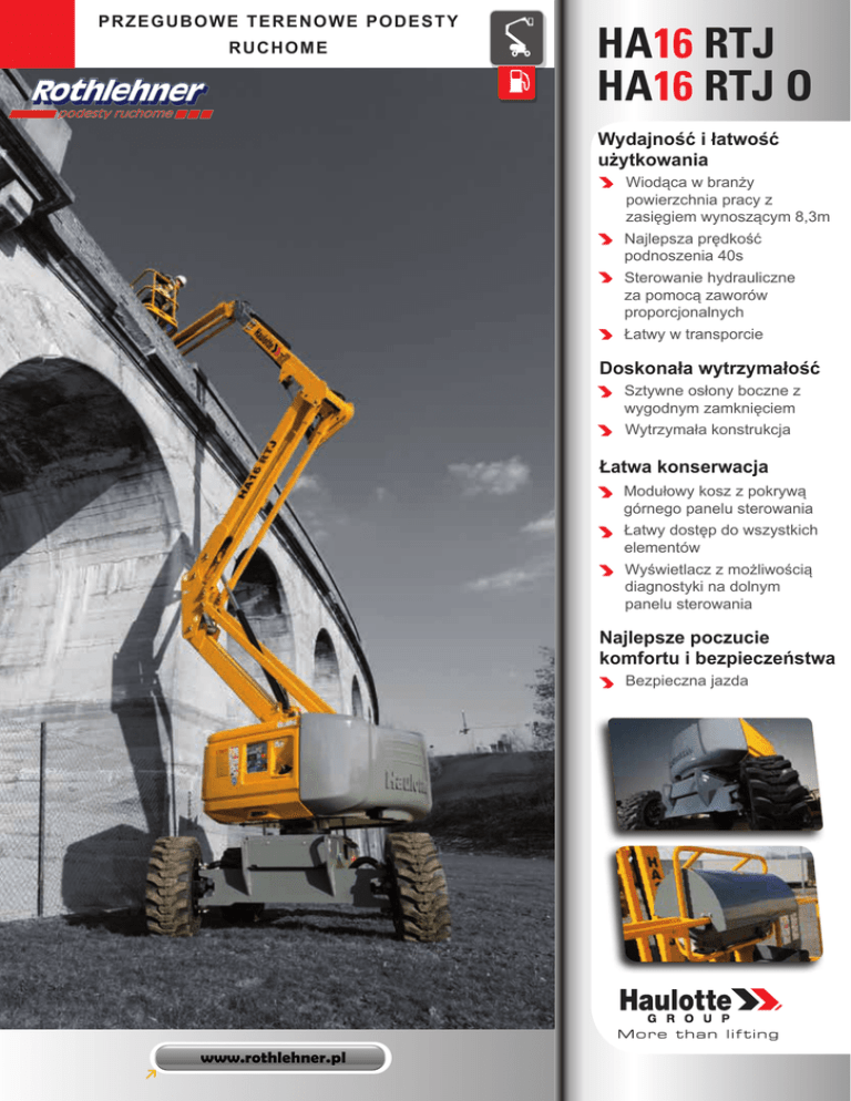 PRZEGUBOWE TERENOWE PODESTY RUCHOME HA16 RTJ HA16 RTJ O Wydajność i łatwość użytkowania Wiodąca w branży powierzchnia pracy z zasięgiem wynoszącym 8,3m Najlepsza prędkość podnoszenia 40s Sterowanie hydrauliczne za pomocą zaworów proporcjonalnych Łatwy w transporcie Doskonała wytrzymałość Sztywne osłony boczne z wygodnym zamknięciem Wytrzymała konstrukcja Łatwa konserwacja Modułowy kosz z pokrywą górnego panelu sterowania Łatwy dostęp do wszystkich elementów Wyświetlacz z możliwością diagnostyki na dolnym panelu sterowania Najlepsze poczucie komfortu i bezpieczeństwa Bezpieczna jazda Mo re t h a n l ifting www.rothlehner.pl HA16 RTJ / HA16 RTJ 0 -6ft 56in P RZ E G U BO WE TE REN O W E PO D E STY RU CH O M E HA16 RTJ 4WD / 2WS HA16 RTJ O 4WD / 2WS Tylna oś wahliwa 16 m 14 m 8.3 m 7.65 m 230 kg (2 osoby) 1.83 x 0.80 m 6.75 m Wysokość robocza Wysokość platformy Maksymalny zasięg Maksymalna wysokość przegubu Maksymalny udźwig F x G Wymiary platformy A Długość Długość w stanie spoczynku H (złożony JIB) B Szerokość C Wysokość I Wysokość w stanie spoczynku Długość przedłużenia ramienia (JIB) 6ft 56in 13ft 10in 19ft 8in 26ft 2in 55ft 9in 16 m 52ft 5in 15 m 49ft 2in 14 m 45ft 11in 13 m 42ft 7in 12 m 39ft 4in 11 m 36ft 1in 10 m 32ft 9in 9 m 29ft 6in 8 m 26ft 2in 7 m 22ft 11in 6 m 19ft 8in 5 m 16ft 4in 4 m 13ft 10in 3 m 9ft 10in 2 m 6ft 6in 1 m 5.05 m 0 m 2 m 4 m 6 m 8 m m STANDARDOWE WYPOSAŻENIE Kąt pionowego obrotu kosza 140° (-80°/+60°) Kąt obrotu platformy Kąt obrotu podwozia D Rozstaw E Prześwit Dopuszczalny kąt przechyłu Prędkość jazdy Maksymalny kąt nachylenia Zewnętrzny promień skrętu duże opony terenowe Silnik 165° (-75°/+90°) 355° non continuous 2.1 m 38 cm 5° aż do 5.6 km/h 40 % 4.5 m 14x17.5 Kubota 26 kW - 35 hp 76 l 62 l 6 600 kg 6 200 kg Pojemność zbiornika paliwa Ciężar całkowity 0 -2 m 2.3 m 2.3 m 2.4 m 1.2 m Pojemność zbiornika oleju hydraulicznego 3ft 3in 0 A Napęd na cztery koła Skręt na dwa koła Przednia oś wahliwa (RTJ O) zapewnia stabilność na nierównym terenie Stała blokada dyferencjału Udźwig 230kg (2 osoby) 4 jednoczesne ruchy dla maksymalnej wydajności Możliwośc pracy na zewnątrz do maksymalnej prędkości wiatru do 60km/h Obrotowy sygnał świetlny Standardowy kosz modułowy 1,83mx 0,80m; łatwy i szybki do naprawy Samoopadająca poprzeczka zabezpieczająca wejście do kosza roboczego Pokrywa górnego panelu sterowania Taca na narzędzia Gniazdko elektryczne w koszu (110/230V) Wyświetlacz z możliwością diagnostyki na dolnym panelu sterowania Obrotowa podstawa silnika, ułatwiająca naprawy Licznik godzin Wskaźnik niskiego poziomu paliwa (górny i dolny panel sterowania) Wstępny podgrzewacz silnika z lampką sygnalizacyjną Sygnał dźwiękowy i świetlny w razie przeciążenia lub przechyłu Akumulatory rozruchowe 12V Elektryczna pompa awaryjnego opuszczania Sygnał dźwiękowy w trakcie jazdy OPCJE / AKCESORIA I C E D H G B Rothlehner - podesty ruchome Sp. z o.o. F Szeroki kosz modułowy 2,44m x0,91m; szybki i łatwy do naprawy Boczne wejście skrzydłowe Generator hydrauliczny Dynaset 3,5Kw Końcówka przewodu ze sprężonym powietrzem w koszu (średnica wewnętrzna 6,5mm) Dodatkowa lampa punktowa 70W Gniazdko w koszu (z głównym wyłącznikiem prądowym lub bez) Światło ostrzegawcze Zestaw dla "zimnych krajów": -10°C /-25°C Zestaw dla "ciepłych krajów": chłodnica oleju hydraulicznego + olej hydrauliczny Biopaliwo Duże opony terenowe 385/65 Ogumienie "białe" 14x17,5 Haulotte Activ'Shield© Bar dodatkowe urządzenie ochronne Katalizator spalin dla silnika diesla Iskrochwyt i zawór przepustnicy Wyłącznik akumulatora www.rothlehner.pl 4000274210 - Zastrzegamy sobie prawo do zmian opisów technicznych zawartych w publikacji bez uprzedzenia - 04/2014 DANE TECHNICZNE 0 17 m