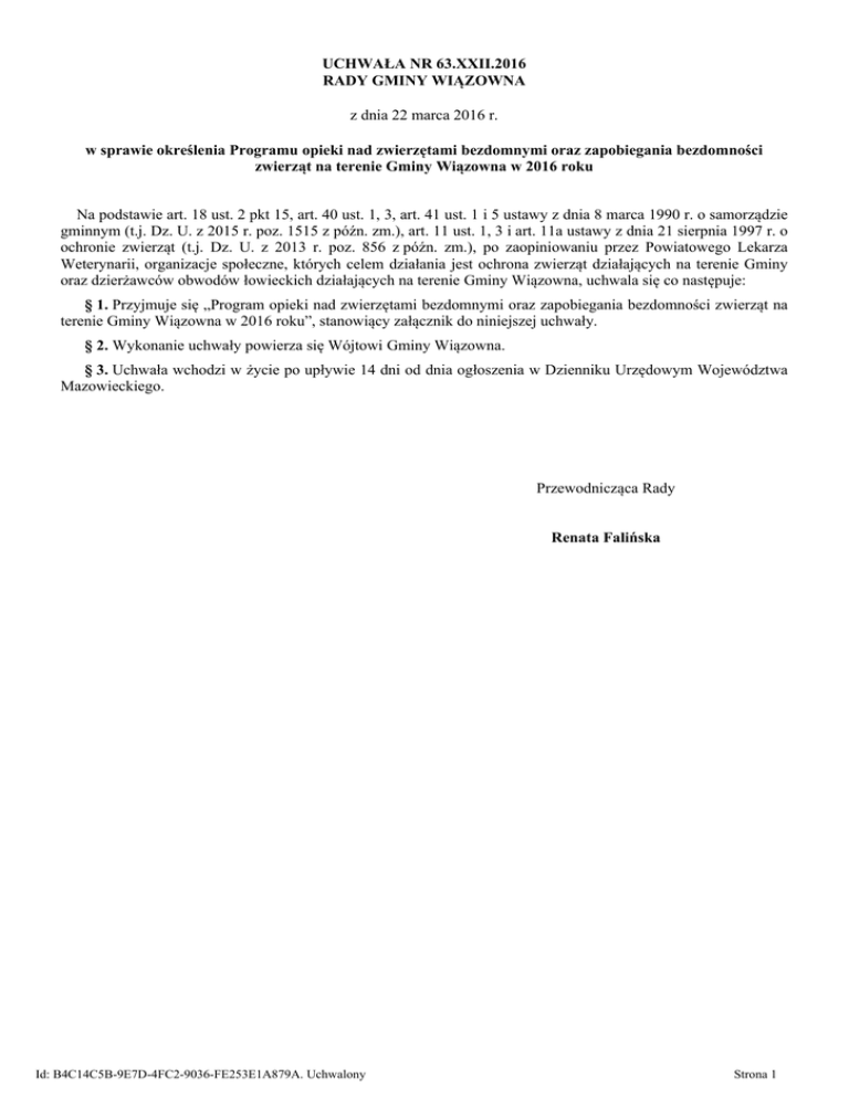 UCHWAŁA NR 63.XXII.2016 RADY GMINY WIĄZOWNA z dnia 22 marca 2016 r. w sprawie określenia Programu opieki nad zwierzętami bezdomnymi oraz zapobiegania bezdomności zwierząt na terenie Gminy Wiązowna w 2016 roku Na podstawie art. 18 ust. 2 pkt 15, art. 40 ust. 1, 3, art. 41 ust. 1 i 5 ustawy z dnia 8 marca 1990 r. o samorządzie gminnym (t.j. Dz. U. z 2015 r. poz. 1515 z późn. zm.), art. 11 ust. 1, 3 i art. 11a ustawy z dnia 21 sierpnia 1997 r. o ochronie zwierząt (t.j. Dz. U. z 2013 r. poz. 856 z późn. zm.), po zaopiniowaniu przez Powiatowego Lekarza Weterynarii, organizacje społeczne, których celem działania jest ochrona zwierząt działających na terenie Gminy oraz dzierżawców obwodów łowieckich działających na terenie Gminy Wiązowna, uchwala się co następuje: § 1. Przyjmuje się „Program opieki nad zwierzętami bezdomnymi oraz zapobiegania bezdomności zwierząt na terenie Gminy Wiązowna w 2016 roku”, stanowiący załącznik do niniejszej uchwały. § 2. Wykonanie uchwały powierza się Wójtowi Gminy Wiązowna. § 3. Uchwała wchodzi w życie po upływie 14 dni od dnia ogłoszenia w Dzienniku Urzędowym Województwa Mazowieckiego. Przewodnicząca Rady Renata Falińska Id: B4C14C5B-9E7D-4FC2-9036-FE253E1A879A. Uchwalony Strona 1 Załącznik Nr 1 do Uchwały Nr 63.XXII.2016 Rady Gminy Wiązowna z dnia 22 marca 2016 r. Program opieki nad zwierzętami bezdomnymi oraz zapobiegania bezdomności zwierząt na terenie Gminy Wiązowna w 2016 roku. §1 Postanowienia ogólne: 1. Ilekroć w programie jest mowa o: 1) programie, należy przez to rozumieć Program opieki nad zwierzętami bezdomnymi oraz zapobiegania bezdomności zwierząt na terenie Gminy Wiązowna w 2016 roku; 2) schronisku, należy przez to rozumieć schronisko dla zwierząt bezdomnych zajmującym się organizowaniem adopcji zwierząt bezdomnych, z którym Gmina Wiązowna podpisała umowę; 3) zwierzętach bezdomnych, należy przez to rozumieć zwierzęta domowe lub gospodarskie, które uciekły, zabłąkały się lub zostały porzucone przez człowieka, a nie ma możliwości ustalenia ich właściciela lub innej osoby, pod której opieką trwale dotąd pozostawały; 4) zwierzętach domowych, należy przez to rozumieć zwierzęta tradycyjnie przebywające wraz z człowiekiem w jego domu lub innym odpowiednim pomieszczeniu, utrzymywane przez człowieka w charakterze jego towarzysza; 5) zwierzętach gospodarskich, należy przez to rozumieć zwierzęta gospodarskie w rozumieniu przepisów ustawy z dnia 29 czerwca 2007 r. o organizacji hodowli i rozrodzie zwierząt gospodarskich. §2 Cele oraz wykonawcy programu: 1. Celami programu są: 1) zapewnienie opieki nad zwierzętami z terenu Gminy Wiązowna; 2) zmniejszenie populacji bezdomnych zwierząt; 3) zapewnienie bezpieczeństwa mieszkańcom Gminy Wiązowna; 4) poprawa porządku publicznego na terenie Gminy Wiązowna; 5) edukacja mieszkańców Gminy w zakresie humanitarnego traktowania zwierząt. 2. Koordynatorem Programu jest Wójt Gminy Wiązowna. 3. Wykonawcami programu są: 1) przedstawiciele Wydziału Ochrony Środowiska Urzędu Gminy Wiązowna; 2) Ochotnicza Straż Pożarna oraz Organizacje Pożytku Publicznego; 3) społeczni opiekunowie kotów; 4) dzierżawcy obwodów łowieckich na terenie Gminy Wiązowna; 5) przedszkola, szkoły i instytucje kultury poprzez edukację dzieci, młodzieży i dorosłych w zakresie humanitarnego traktowania zwierząt i sposobów zapobiegania ich bezdomności. §3 1. Bezdomne zwierzęta domowe odłowione z terenu Gminy Wiązowna umieszczane będą w schronisku Fundacji „Schronisko dla bezdomnych zwierząt w Józefowie”, z/s w Józefowie, ul. Stróżańska 15, 05-119 Legionowo, znajdującym się pod nadzorem Inspekcji Weterynaryjnej, w oparciu o umowę zawartą przez Gminę Wiązowna z wyspecjalizowanymi uprawnionym przedsiębiorcą. 2. W umowie określone zostaną: Id: B4C14C5B-9E7D-4FC2-9036-FE253E1A879A. Uchwalony Strona 2 1. 2. 3. 4. 5. 6. 1) zasady umieszczania bezdomnych zwierząt w schronisku; 2) kwoty i formy płatności za przyjęcie bezdomnego zwierzęcia z terenu Gminy Wiązowna; 3) zapis o wypełnieniu obowiązku poszukiwania właścicieli dla bezdomnych zwierząt, 4) zasady zgodnie, z którymi odbywać się będzie usypianie ślepych miotów bezdomnych zwierząt; 5) zasady kastracji i sterylizacji bezdomnych zwierząt umieszczonych w schronisku dla bezdomnych zwierząt. §4 Wprowadza się odławianie bezdomnych zwierząt z terenu Gminy Wiązowna. Odławianie bezdomnych zwierząt ma charakter stały i odbywa się na podstawie zgłoszenia interwencyjnego bądź też z urzędu, w zależności od potrzeby. Odławianiem obejmuje się wszystkie bezdomne zwierzęta, jednakże priorytet stanowią zwierzęta chore lub zagrażające życiu lub zdrowiu i bezpieczeństwu ludzi. Odławianie bezdomnych zwierząt będzie prowadzone za pomocą specjalistycznego sprzętu, który nie będzie stwarzał zagrożenia dla życia i zdrowia zwierząt oraz nie będzie zadawał im cierpienia. Transport bezdomnych zwierząt będzie odbywał się środkiem transportu przystosowanym do bezpiecznego i humanitarnego przewozu zwierząt, przez podmiot będący pod nadzorem Inspekcji Weterynaryjnej. Odławianie, transport oraz sprawowanie dalszej opieki nad bezdomnymi zwierzętami do czasu umieszczenia ich w schronisku realizowane będzie w oparciu o umowę zawartą przez Gminę Wiązowna z wyspecjalizowanym i uprawnionym przedsiębiorcą. §5 1. Zakłada się możliwość przekazania pod tymczasową opiekę Gminy Wiązowna zwierząt, których właściciele, w wyniku wypadków losowych, utracili możliwość pełnienia nad zwierzętami należytej opieki (np. długotrwały pobyt w szpitalu osoby samotnej). 2. Koszty utrzymania zwierząt poddanych tymczasowej opiece Gminy Wiązowna pokrywają właściciele zwierząt. 3. Zwierzęta kwalifikują się do objęcia tymczasową opieką na skutek pozytywnie rozpatrzonych podań, skierowanych do Urz