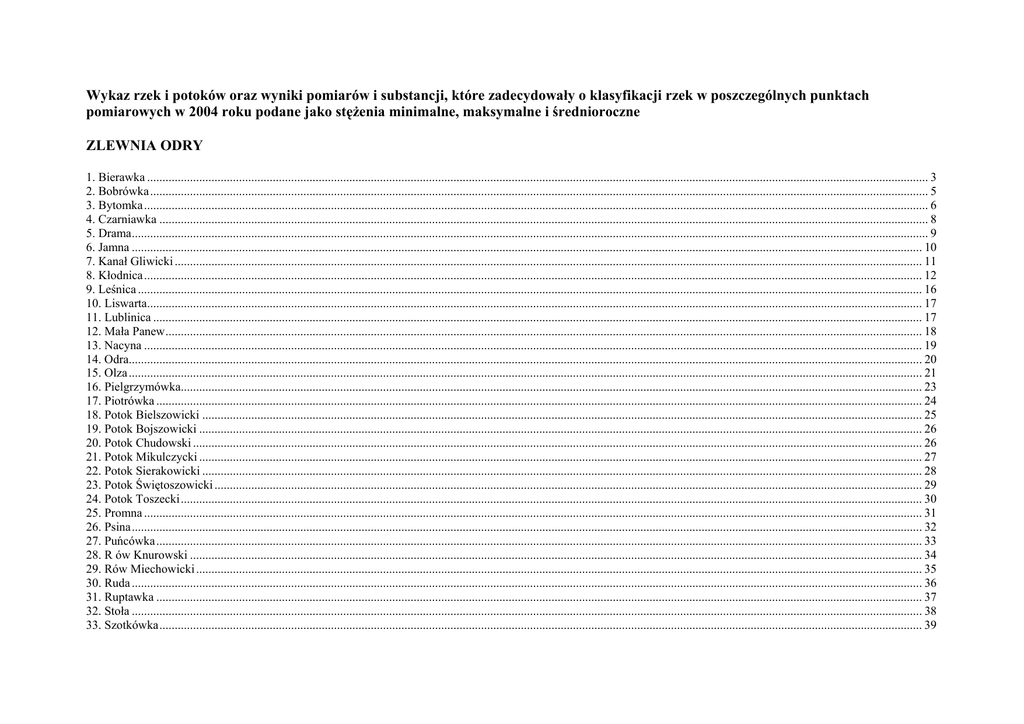 Wykaz rzek i potoków oraz wyniki pomiarów i substancji, które zadecydowały o klasyfikacji rzek w poszczególnych punktach pomiarowych w 2004 roku podane jako stężenia minimalne, maksymalne i średnioroczne ZLEWNIA ODRY 1. Bierawka ............................................................................................................................................................................................................................................................... 3 2. Bobrówka.............................................................................................................................................................................................................................................................. 5 3. Bytomka................................................................................................................................................................................................................................................................ 6 4. Czarniawka ........................................................................................................................................................................................................................................................... 8 5. Drama.................................................................................................................................................................................................................................................................... 9 6. Jamna .................................................................................................................................................................................................................................................................. 10 7. Kanał Gliwicki .................................................................................................................................................................................................................................................... 11 8. Kłodnica.............................................................................................................................................................................................................................................................. 12 9. Leśnica ................................................................................................................................................................................................................................................................ 16 10. Liswarta............................................................................................................................................................................................................................................................. 17 11. Lublinica ........................................................................................................................................................................................................................................................... 17 12. Mała Panew....................................................................................................................................................................................................................................................... 18 13. Nacyna .............................................................................................................................................................................................................................................................. 19 14. Odra................................................................................................................................................................................................................................................................... 20 15. Olza ................................................................................................................................................................................................................................................................... 21 16. Pielgrzymówka.................................................................................................................................................................................................................................................. 23 17. Piotrówka .......................................................................................................................................................................................................................................................... 24 18. Potok Bielszowicki ........................................................................................................................................................................................................................................... 25 19. Potok Bojszowicki ............................................................................................................................................................................................................................................ 26 20. Potok Chudowski .............................................................................................................................................................................................................................................. 26 21. Potok Mikulczycki ............................................................................................................................................................................................................................................ 27 22. Potok Sierakowicki ................................................................................................................................