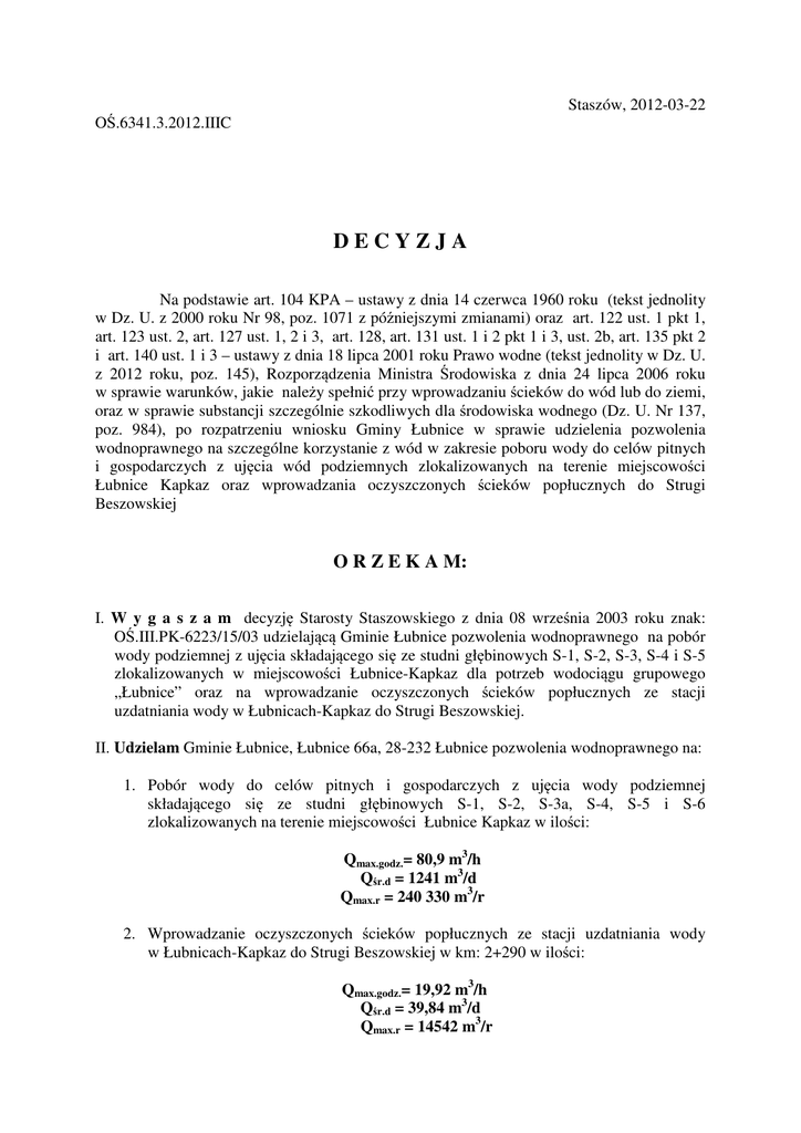 Staszów, 2012-03-22 OŚ.6341.3.2012.IIIC DECYZJA Na podstawie art. 104 KPA – ustawy z dnia 14 czerwca 1960 roku (tekst jednolity w Dz. U. z 2000 roku Nr 98, poz. 1071 z późniejszymi zmianami) oraz art. 122 ust. 1 pkt 1, art. 123 ust. 2, art. 127 ust. 1, 2 i 3, art. 128, art. 131 ust. 1 i 2 pkt 1 i 3, ust. 2b, art. 135 pkt 2 i art. 140 ust. 1 i 3 – ustawy z dnia 18 lipca 2001 roku Prawo wodne (tekst jednolity w Dz. U. z 2012 roku, poz. 145), Rozporządzenia Ministra Środowiska z dnia 24 lipca 2006 roku w sprawie warunków, jakie należy spełnić przy wprowadzaniu ścieków do wód lub do ziemi, oraz w sprawie substancji szczególnie szkodliwych dla środowiska wodnego (Dz. U. Nr 137, poz. 984), po rozpatrzeniu wniosku Gminy Łubnice w sprawie udzielenia pozwolenia wodnoprawnego na szczególne korzystanie z wód w zakresie poboru wody do celów pitnych i gospodarczych z ujęcia wód podziemnych zlokalizowanych na terenie miejscowości Łubnice Kapkaz oraz wprowadzania oczyszczonych ścieków popłucznych do Strugi Beszowskiej O R Z E K A M: I. W y g a s z a m decyzję Starosty Staszowskiego z dnia 08 września 2003 roku znak: OŚ.III.PK-6223/15/03 udzielającą Gminie Łubnice pozwolenia wodnoprawnego na pobór wody podziemnej z ujęcia składającego się ze studni głębinowych S-1, S-2, S-3, S-4 i S-5 zlokalizowanych w miejscowości Łubnice-Kapkaz dla potrzeb wodociągu grupowego „Łubnice” oraz na wprowadzanie oczyszczonych ścieków popłucznych ze stacji uzdatniania wody w Łubnicach-Kapkaz do Strugi Beszowskiej. II. Udzielam Gminie Łubnice, Łubnice 66a, 28-232 Łubnice pozwolenia wodnoprawnego na: 1. Pobór wody do celów pitnych i gospodarczych z ujęcia wody podziemnej składającego się ze studni głębinowych S-1, S-2, S-3a, S-4, S-5 i S-6 zlokalizowanych na terenie miejscowości Łubnice Kapkaz w ilości: Qmax.godz.= 80,9 m3/h Qśr.d = 1241 m3/d Qmax.r = 240 330 m3/r 2. Wprowadzanie oczyszczonych ścieków popłucznych ze stacji uzdatniania wody w Łubnicach-Kapkaz do Strugi Beszowskiej w km: 2+290 w ilości: Qmax.godz.= 19,92 m3/h Qśr.d = 39,84 m3/d Qmax.r = 14542 m3/r o następujących najwyższych dopuszczalnych wartościach wskaźników zanieczyszczeń w ilości: zawiesina ogólna – 35 mg/dm3 żelazo ogólne – 10 mg/dm3 3. Ustalam następujące punkty kontroli: − do pomiaru ilości wody w studniach: S-1, S-2, S-3a, S-4, S-5 i S-6 służą wodomierze o wydajności max Q=40 m3/h; − do pomiaru ilości wody uzdatnionej w stacji uzdatniania wody służy wodomierz sieciowy o wydajności Q=150 m3/h; − do poboru oczyszczonych wód popłucznych służy pierwsza studzienka za urządzeniami oczyszczającymi. III. Pozwolenia wodnoprawnego wymienionego: 1. W pkt II.1. udziela się pod następującymi warunkami: a. Pobór wody z ujęcia nie przekroczy ilości wyszczególnionych w pkt II.1. niniejszej decyzji oraz wydajności eksploatacyjnych poszczególnych studni. b. Prowadzenia pomiarów wydajności i poziomu zwierciadła wody w studniach z częstotliwością 2 x rok oraz rejestrowania wyników tych pomiarów w książce eksploatacji studni. c. Prowadzenia pomiarów ilości pobieranej wody ze studni z częstotliwością 1 x na miesiąc. d. Prowadzenia pomiarów ilości wody tłoczonej do sieci zewnętrznej – z częstotliwością 1 x na dobę. e. Prowadzenia okresowych badań jakości wody pobieranej ze studni i na końcówkach sieci wodociągów zgodnie z zał. Nr 6 do Rozporządzeniu Ministra Zdrowia z dnia 29 marca 2007 r. w sprawie jakości wody przeznaczonej do spożycia przez ludzi (Dz. U. z 2007 r. Nr 61 poz. 417 z późniejszymi zmianami) – po uzgodnieniu z Państowym Powiatowym Inspektorem Sanitarnym. f. Utrzymywania we właściwym stanie technicznym studni, urządzeń służących do poboru wody oraz dokonywania na bieżąco ich konserwacji. g. Utrzymywania stref ochrony bezpośredniej ujęć zgodnie z obowiązującymi przepisami. 2. W pkt II.2. udziela się pod następującymi warunkami: a. Ilość i jakość odprowadzanych do wód ścieków nie przekroczy wartości określonych w pkt II.2. decyzji. b. Prowadzenia pomiaru ilości oczyszczonych wód popłucznych z częstotliwością 1 x na miesiąc c. Prowadzenia badań jakości oczyszczonych wód popłucznych z częstotliwością nie mniejszą niż raz na dwa miesiące w zakresie: zawiesina ogólna, żelazo ogólne. d. Utrzymywania w dobrym stanie technicznym i technologicznym urządzeń służących do oczyszczania i odprowadzania ścieków. e. Bieżącej konserwacji odbiornika ścieków tj. Struga Beszowska na odcinkach o długościach : 15 m powyżej i 100 m poniżej zrzutu ścieków. IV. Sposób postępowania w przypadku zatrzymania działalności bądź wystąpienia awarii. W przypadku zaniku prądu w sieci przerwać produkcję poprzez zatrzymanie ciągów technologicznych. W przypadku uszkodzenia jednej z pomp głębinowych w pracujących studniach, prace podejmie studnia S–4, która pełni funkcję studni awaryjnej. Awarie na sieci usuwane będą na bieżąco przez służby zakładowe. O przypadkach wystąpienia awarii urządzeń grożących wprowadzeniem do środowiska ścieków niedostatecznie oczyszczonych należy powiadomić Inspekcję Ochrony Środowiska. V. Zastrzega się prawo nałożenia dodatkowych obowiązków niezbędnych ze względu na ochronę interesów ludności, gospodarki wodnej i ochronę środowiska. VI. W przypadku nie dotrzymania warunków niniejszej decyzji, pozwolenie zostanie cofnięte bez odszkodowania. VII. Wszelkie szkody powstałe w związku z korzystaniem z przydzielonych uprawnień obciążają uprawnionego. VIII. Pozwolenie wodnoprawne nie rodzi praw do nieruchomości i urządzeń wodnych koniecznych do jego realizacji oraz nie narusza prawa własności i uprawnień osób trzecich przysługujących wobec tych nieruchomości i urządzeń. IX. Pozwolenia wodnoprawnego udziela się na okres: 1. w pkt II.1. do dnia 20 marca 2032 roku 2. w pkt II.2. do dnia 20