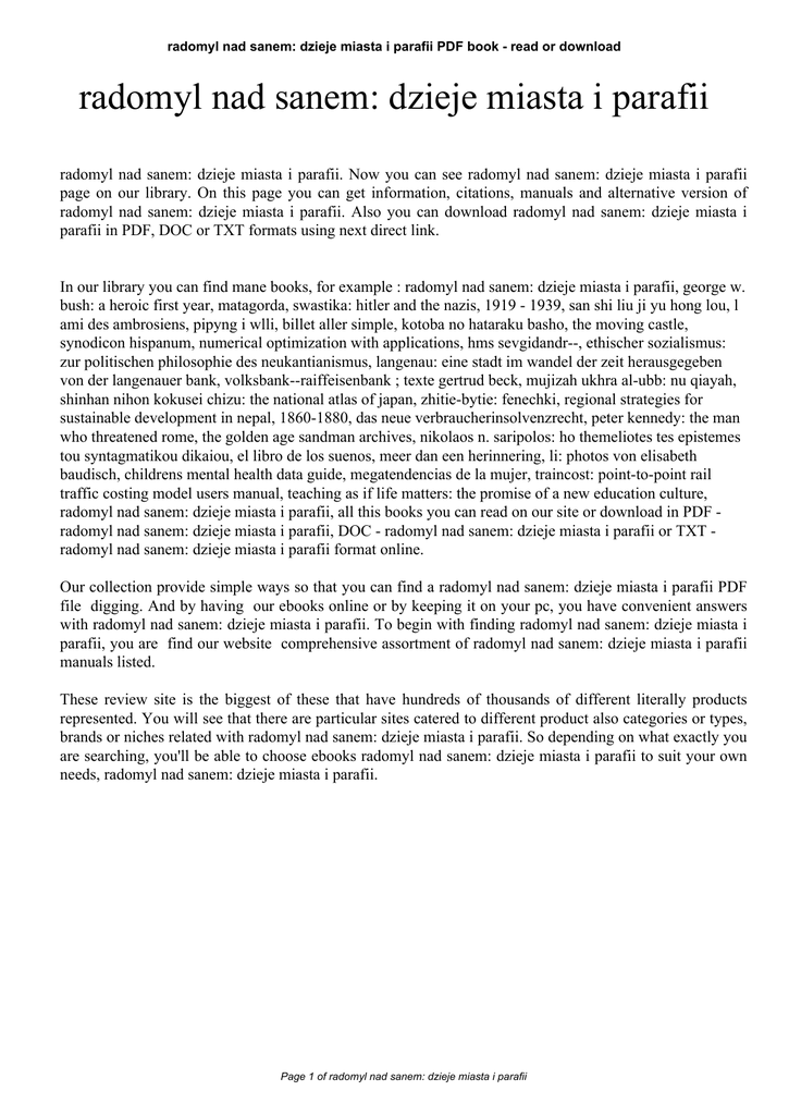 radomyl nad sanem: dzieje miasta i parafii PDF book - read or download radomyl nad sanem: dzieje miasta i parafii radomyl nad sanem: dzieje miasta i parafii. Now you can see radomyl nad sanem: dzieje miasta i parafii page on our library. On this page you can get information, citations, manuals and alternative version of radomyl nad sanem: dzieje miasta i parafii. Also you can download radomyl nad sanem: dzieje miasta i parafii in PDF, DOC or TXT formats using next direct link. In our library you can find mane books, for example : radomyl nad sanem: dzieje miasta i parafii, george w. bush: a heroic first year, matagorda, swastika: hitler and the nazis, 1919 - 1939, san shi liu ji yu hong lou, l ami des ambrosiens, pipyng i wlli, billet aller simple, kotoba no hataraku basho, the moving castle, synodicon hispanum, numerical optimization with applications, hms sevgidandr--, ethischer sozialismus: zur politischen philosophie des neukantianismus, langenau: eine stadt im wandel der zeit herausgegeben von der langenauer bank, volksbank--raiffeisenbank ; texte gertrud beck, mujizah ukhra al-ubb: nu qiayah, shinhan nihon kokusei chizu: the national atlas of japan, zhitie-bytie: fenechki, regional strategies for sustainable development in nepal, 1860-1880, das neue verbraucherinsolvenzrecht, peter kennedy: the man who threatened rome, the golden age sandman archives, nikolaos n. saripolos: ho themeliotes tes epistemes tou syntagmatikou dikaiou, el libro de los suenos, meer dan een herinnering, li: photos von elisabeth baudisch, childrens mental health data guide, megatendencias de la mujer, traincost: point-to-point rail traffic costing model users manual, teaching as if life matters: the promise of a new education culture, radomyl nad sanem: dzieje miasta i parafii, all this books you can read on our site or download in PDF radomyl nad sanem: dzieje miasta i parafii, DOC - radomyl nad sanem: dzieje miasta i parafii or TXT radomyl nad sanem: dzieje miasta i parafii format online. Our collection provide simple ways so that you can find a radomyl nad sanem: dzieje miasta i parafii PDF file digging. And by having our ebooks online or by keeping it on your pc, you have convenient answers with radomyl nad sanem: dzieje miasta i parafii. To begin with finding radomyl nad sanem: dzieje miasta i parafii, you are find our website comprehensive assortment of radomyl nad sanem: dzieje miasta i parafii manuals listed. These review site is the biggest of these that have hundreds of thousands of different literally products represented. You will see that there are particular sites catered to different product also categories or types, brands or niches related with radomyl nad sanem: dzieje miasta i parafii. So depending on what exactly you are searching, you'll be able to choose ebooks radomyl nad sanem: dzieje miasta i parafii to suit your own needs, radomyl nad sanem: dzieje miasta i parafii. Page 1 of radomyl nad sanem: dzieje miasta i parafii