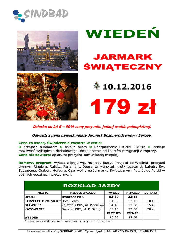 WIEDEŃ JARMARK ŚWIĄTECZNY 10.12.2016 179 zł Dziecko do lat 6 – 50% ceny przy min. jednej osobie pełnopłatnej. Odwiedź z nami najpiękniejszy Jarmark Bożonarodzeniowy Europy. Cena za osobę. Świadczenia zawarte w cenie: przejazd autokarem opieka pilota ubezpieczenie SIGNAL IDUNA Istnieje możliwość wykupienia dodatkowego ubezpieczenie od kosztów rezygnacji z imprezy. Cena nie zawiera: opłaty za przejazd komunikacją miejską. Ramowy program: wyjazd z kraju wg. rozkładu jazdy. Przyjazd do Wiednia: przejazd słynnym Ringiem: Ratusz, Parlament, Opera, Uniwersytet, krótki spacer do katedry Św. Szczepana, Graben, Hofburg. Czas wolny na Jarmarku Świątecznym. Powrót do Polski w późnych godzinach wieczornych. ROZKŁAD JAZDY MIASTO MIEJSCE WYJAZDU OPOLE Dworzec PKS STRZELCE OPOLSKIE* Hotel Leśny GLIWICE* Zajezdnia PKS, ul. Pionierów KATOWICE* Dworzec PKS, pl. P. Skargi WYJAZD PRZYJAZD DOPŁATA 03:30 04:00 04:45 05:15 23:45 23:15 22:30 22:00 10 zł 15 zł 20 zł PRZYJAZD WYJAZD 10.30 WIEDEŃ * połączenie mikrobusem realizowane przy min. 8 osobach 17.00 Prywatne Biuro Podróży SINDBAD, 45-015 Opole, Rynek 8, tel.: +48 (77) 4021303, (77) 4021302
