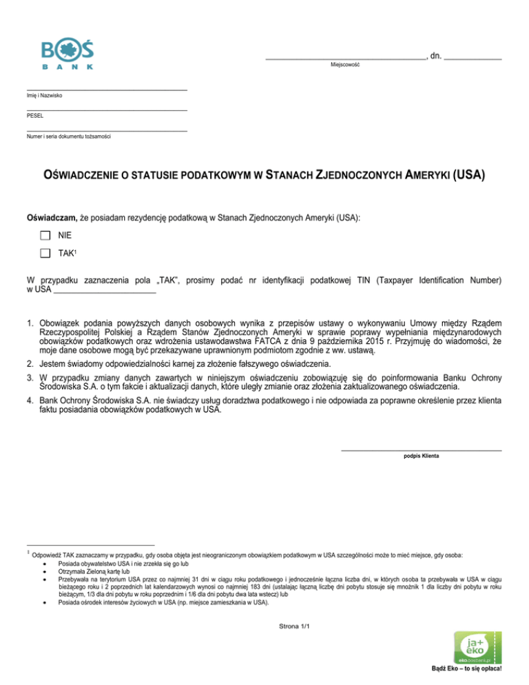 ____________________________________, dn. _____________ Miejscowość ____________________________________ Imię i Nazwisko ____________________________________ PESEL ____________________________________ Numer i seria dokumentu tożsamości OŚWIADCZENIE O STATUSIE PODATKOWYM W STANACH ZJEDNOCZONYCH AMERYKI (USA) Oświadczam, że posiadam rezydencję podatkową w Stanach Zjednoczonych Ameryki (USA): NIE TAK1 W przypadku zaznaczenia pola „TAK”, prosimy podać nr identyfikacji podatkowej TIN (Taxpayer Identification Number) w USA _______________________ 1. Obowiązek podania powyższych danych osobowych wynika z przepisów ustawy o wykonywaniu Umowy między Rządem Rzeczypospolitej Polskiej a Rządem Stanów Zjednoczonych Ameryki w sprawie poprawy wypełniania międzynarodowych obowiązków podatkowych oraz wdrożenia ustawodawstwa FATCA z dnia 9 października 2015 r. Przyjmuję do wiadomości, że moje dane osobowe mogą być przekazywane uprawnionym podmiotom zgodnie z ww. ustawą. 2. Jestem świadomy odpowiedzialności karnej za złożenie fałszywego oświadczenia. 3. W przypadku zmiany danych zawartych w niniejszym oświadczeniu zobowiązuję się do poinformowania Banku Ochrony Środowiska S.A. o tym fakcie i aktualizacji danych, które uległy zmianie oraz złożenia zaktualizowanego oświadczenia. 4. Bank Ochrony Środowiska S.A. nie świadczy usług doradztwa podatkowego i nie odpowiada za poprawne określenie przez klienta faktu posiadania obowiązków podatkowych w USA. ____________________________________ podpis Klienta 1 Odpowiedź TAK zaznaczamy w przypadku, gdy osoba objęta jest nieograniczonym obowiązkiem podatkowym w USA szczególności może to mieć miejsce, gdy osoba: Posiada obywatelstwo USA i nie zrzekła się go lub Otrzymała Zieloną kartę lub Przebywała na terytorium USA przez co najmniej 31 dni w ciągu roku podatkowego i jednocześnie łączna liczba dni, w których osoba ta przebywała w USA w ciągu bieżącego roku i 2 poprzednich lat kalendarzowych wynosi co najmniej 183 dni (ustalając łączną liczbę dni pobytu stosuje się mnożnik 1 dla liczby dni pobytu w roku bieżącym, 1/3 dla dni pobytu w roku poprzednim i 1/6 dla dni pobytu dwa lata wstecz) lub Posiada ośrodek interesów życiowych w USA (np. miejsce zamieszkania w USA). Strona 1/1 Bądź Eko – to się opłaca!