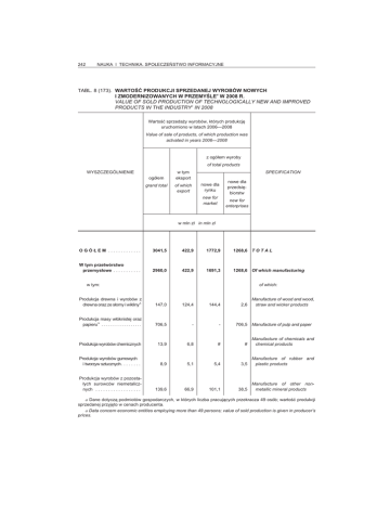 242 NAUKA I TECHNIKA. SPO£ECZEÑSTWO INFORMACYJNE TABL. 8 (173). WARTOŒÆ PRODUKCJI SPRZEDANEJ WYROBÓW NOWYCH I ZMODERNIZOWANYCH W PRZEMYŒLEa W 2008 R. VALUE OF SOLD PRODUCTION OF TECHNOLOGICALLY NEW AND IMPROVED PRODUCTS IN THE INDUSTRYa IN 2008 Wartoœæ sprzeda¿y wyrobów, których produkcjê uruchomiono w latach 2006—2008 Value of sale of products, of which production was actvated in years 2006—2008 z ogó³em wyroby of total products WYSZCZEGÓLNIENIE ogó³em grand total w tym eksport SPECIFICATION nowe dla rynku of which export new for market nowe dla przedsiêbiorstw new for enterprises w mln z³ in mln zl OGÓ£EM ............. 3041,5 422,9 1772,9 1268,6 T O T A L W tym przetwórstwo przemys³owe . . . . . . . . . . . 2960,0 422,9 1691,3 1268,6 Of which manufacturing w tym: of which: Manufacture of wood and wood, straw and wicker products Produkcja drewna i wyrobów z drewna oraz ze s³omy i wikliny∆ 147,0 124,4 144,4 Produkcja masy w³óknistej oraz papieru∆ . . . . . . . . . . . . . . . . . . . 706,5 - - Produkcja wyrobów chemicznych 13,9 6,8 # # Manufacture of chemicals and chemical products Produkcja wyrobów gumowych i tworzyw sztucznych. . . . . . . . 8,9 5,1 5,4 3,5 Manufacture of rubber and plastic products Produkcja wyrobów z pozosta³ych surowców niemetalicznych . . . . . . . . . . . . . . . . . . 139,6 66,9 101,1 38,5 Manufacture of other nonmetallic mineral products 2,6 706,5 Manufacture of pulp and paper a Dane dotycz¹ podmiotów gospodarczych, w których liczba pracuj¹cych przekracza 49 osób; wartoœæ produkcji sprzedanej przyjêto w cenach producenta. a Data concern economic entities employing more than 49 persons; value of sold production is given in producer’s prices. SCIENCE AND TECHNOLOGY. INFORMATION SOCIETY 243 TABL. 8 (173). WARTOŒÆ PRODUKCJI SPRZEDANEJ WYROBÓW NOWYCH I ZMODERNIZOWANYCH W PRZEMYŒLEa W 2007 R. (dok.) VALUE OF SOLD PRODUCTION OF TECHNOLOGICALLY NEW AND IMPROVED PRODUCTS IN THE INDUSTRYa IN 2007 (cont.) Wartoœæ sprzeda¿y wyrobów, których produkcjê uruchomiono w latach 2006—2008 Value of sale of products, of which production was actvated in years 2006—2008 z ogó³em wyroby of total products WYSZCZEGÓLNIENIE w tym eksport ogó³em grand total SPECIFICATION of which export nowe dla rynku new for market nowe dla przedsiêbiorstw new for enterprises w mln z³ in mln zl Przetwórstwo przemys³owe (dok.) ∆ Manufacturing (cont.) Produkcja wyrobów z metali . . 112,8 85,0 35,9 76,9 Manufacture of metal products Produkcja maszyn i urz¹dzeñ∆ 97,3 60,2 39,0 58,3 Manufacture of machinery and equipment n.e.c. Produkcja pojazdów samochodowych, przyczep i naczep . . . 12,5 12,2 0,3 12,2 Manufacture of motor vehicles, trailers and semi-trailers Produkcja pozosta³ego sprzêtu transportowego. . . . . . . . . . . 1,9 1,9 # # Manufacture of other transport equipment a Dane dotycz¹ podmiotów gospodarczych, w których liczba pracuj¹cych przekracza 49 osób; wartoœæ produkcji sprzedanej przyjêto w cenach producenta. a Data concern economic entities employing more than 49 persons; value of sold production is given in producer’s prices. TABL. 9 (174). WYNALAZKI I WZORY U¯YTKOWE KRAJOWE DOMESTIC INVENTIONS AND UTILITY MODELS WYSZCZEGÓLNIENIE 2000 2005 2007 2008 Wynalazki: SPECIFICATION Inventions: zg³oszone . . . . . . . . . . . . . . . . . . . . . . 33 33 14 28 patent applications udzielone patenty . . . . . . . . . . . . . . . . 10 10 12 10 patents granted Wzory u¿ytkowe: Utility models: zg³oszone . . . . . . . . . . . . . . . . . . . . . . . 9 8 10 utility model application udzielone prawa ochronne . . . . . . . . . . 12 7 13 rights of protection granted r ó d ³ o: dane Urzêdu Patentowego Rzeczpospolitej Polskiej. S o u r c e: data of the Patent Office of the Republic of Poland.
