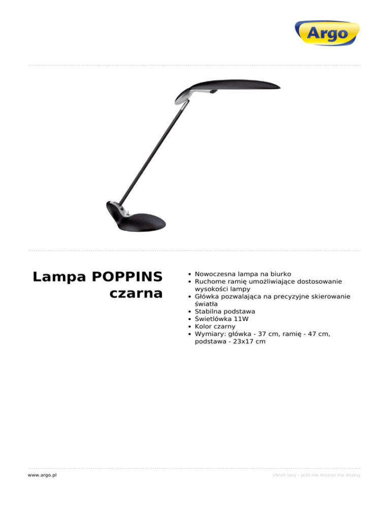 Lampa POPPINS czarna www.argo.pl Powered by TCPDF (www.tcpdf.org) Nowoczesna lampa na biurko Ruchome ramię umożliwiające dostosowanie wysokości lampy Główka pozwalająca na precyzyjne skierowanie światła Stabilna podstawa Świetlówka 11W Kolor czarny Wymiary: główka - 37 cm, ramię - 47 cm, podstawa - 23x17 cm chroń lasy - jeśli nie musisz nie drukuj