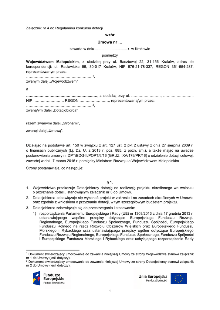 Załącznik nr 4 do Regulaminu konkursu dotacji wzór Umowa nr … zawarta w dniu ............................... r. w Krakowie pomiędzy Województwem Małopolskim, z siedzibą przy ul. Basztowej 22, 31-156 Kraków, adres do korespondencji: ul. Racławicka 56, 30-017 Kraków, NIP 676-21-78-337, REGON 351-554-287, reprezentowanym przez: ………………………………………………1, zwanym dalej „Województwem” a …………………………………………….……, z siedzibą przy ul. ……………………, ……………………, NIP ……………………, REGON ……………………, reprezentowaną/ym przez: ………………………………………………2, zwaną/ym dalej „Dotacjobiorcą” razem zwanymi dalej „Stronami”, zwanej dalej „Umową”. Działając na podstawie art. 150 w związku z art. 127 ust. 2 pkt 2 ustawy z dnia 27 sierpnia 2009 r. o finansach publicznych (t.j. Dz. U. z 2013 r. poz. 885, z późn. zm.), a także mając na uwadze postanowienia umowy nr DPT/BDG-II/POPT/6/16 (GRUZ: IXA/179/PR/16) o udzielenie dotacji celowej, zawartej w dniu 7 marca 2016 r. pomiędzy Ministrem Rozwoju a Województwem Małopolskim Strony postanawiają, co następuje: § 1. 1. Województwo przekazuje Dotacjobiorcy dotację na realizację projektu określonego we wniosku o przyznanie dotacji, stanowiącym załącznik nr 3 do Umowy. 2. Dotacjobiorca zobowiązuje się wykonać projekt w zakresie i na zasadach określonych w Umowie oraz zgodnie z wnioskiem o przyznanie dotacji, w tym szczegółowym budżetem projektu. 3. Dotacjobiorca zobowiązuje się do przestrzegania i stosowania: 1) rozporządzenia Parlamentu Europejskiego i Rady (UE) nr 1303/2013 z dnia 17 grudnia 2013 r. ustanawiającego wspólne przepisy dotyczące Europejskiego Funduszu Rozwoju Regionalnego, Europejskiego Funduszu Społecznego, Funduszu Spójności, Europejskiego Funduszu Rolnego na rzecz Rozwoju Obszarów Wiejskich oraz Europejskiego Funduszu Morskiego i Rybackiego oraz ustanawiającego przepisy ogólne dotyczące Europejskiego Funduszu Rozwoju Regionalnego, Europejskiego Funduszu Społecznego, Funduszu Spójności i Europejskiego Funduszu Morskiego i Rybackiego oraz uchylającego rozporządzenie Rady Dokument stwierdzający umocowanie do zawarcia niniejszej Umowy ze strony Województwa stanowi załącznik nr 1 do Umowy (jeśli dotyczy). 2 Dokument stwierdzający umocowanie do zawarcia niniejszej Umowy ze strony Dotacjobiorcy stanowi załącznik nr 2 do Umowy (jeśli dotyczy). 1 1 (WE) nr 1083/2006 (Dz. Urz. UE L 347 z 20.12.2013, str. 320, z późn. zm.), zwanego dalej „rozporządzeniem nr 1303/2013”; 2) ustawy z dnia 11 lipca 2014 r. o zasadach realizacji programów w zakresie polityki spójności finansowanych w perspektywie finansowej 2014-2020 (t.j. Dz. U. z 2016 r. poz. 217), 3) ustawy z dnia 27 sierpnia 2009 r. o finansach publicznych (t.j. Dz. U. z 2013 r. poz. 885, z późn. zm.); 4) ustawy z dnia 29 stycznia 2004 r. – Prawo zamówień publicznych (t.j. Dz. U. z 2015 r. poz. 2164, z późn. zm.); 4. Dotacjobiorca oświadcza, że jest mu znana treść aktów prawnych oraz dokumentów wymienionych w ust. 3 i zobowiązuje się do ich przestrzegania i stosowania. 5. Dotacjobiorca oświadcza, że zapoznał się z treścią: 1) Wytycznych Ministra Infrastruktury i Rozwoju w zakresie wykorzystania środków pomocy technicznej na lata 2014-2020 oraz Wytycznych Ministra Infrastruktury i Rozwoju w zakresie kwalifikowalności wydatków w ramach Europejskiego Funduszu Rozwoju Regionalnego, Europejskiego Funduszu Społecznego oraz Funduszu Spójności na lata 2014-2020, z zastrzeżeniem pkt 2; 2) Procedury udzielenia zamówień przez dotacjobiorców, stanowiącej załącznik nr 6 do Umowy. Jej stosowanie wyłącza obowiązek dokonania rozeznania rynku dla wydatków pow. 20 tys. zł netto oraz stosowania zasady uczciwej konkurencji, określonych odpowiednio w podrozdziale 6.2 pkt 4 oraz sekcji 6.5.3 Wytycznych Ministra Infrastruktury i Rozwoju w zakresie kwalifikowalności wydatków w ramach Europejskiego Funduszu Rozwoju Regionalnego, Europejskiego Funduszu Społecznego oraz Funduszu Spójności na lata 2014-2020; 3) Wytycznych Ministra Infrastruktury i Rozwoju w zakresie rewitalizacji w programach operacyjnych na lata 2014-2020; 4) Szczegółowego Opisu Osi Priorytetowych Województwa Małopolskiego na lata 2014-2020 Regionalnego Programu Operacyjnego i będzie ponosił wydatki związane z realizacją projektu zgodnie z ich postanowieniami. 6. Dotacjobiorca oświadcza, że na bieżąco będzie zapoznawać się z dokumentami umieszczonymi na stronie internetowej www.popt.gov.pl, w tym w szczególności z Procedurą dotyczącą środków zwalczania nadużyć finansowanych w POPT 2014-2020 oraz będzie wykorzystywać rekomendacje i rozwiązania zawarte w tych dokumentach w zakresie związanym z realizacją Umowy. 7. Dotacjobiorca zobowiązuje się do poinformowania odbiorców, że projekt został zrealizowany przy współfinansowaniu ze środków Unii Europejskiej, w ramach Programu Operacyjnego Pomoc Techniczna 2014-2020. Dotacjobiorca oświadcza, że będzie wykorzystywać rekomendacje i rozwiązania w zakresie informacji i promocji opisane w Księdze identyfikacji wizualnej znaku marki Fundusze Europejskie i znaków programów polityki spójności na lata 2014-2020 oraz Podręczniku Beneficjenta Funduszy Europejskich w zakresie informacji i promocji na lata 2014-2020. § 2. 1. Województwo zobowiązuje się do przekazania na realizację projektu dotacji w wysokości do …….. PLN (słownie: …….. 00/100 złotych). Łączna wysokość projektu (kwota dotacji i wkład własny Dotacjobiorcy) wynosi …….. PLN. 2. Kwota dotacji nie przekroczy 90% kosztów kwalifikowalnych realizacji projektu. Dotacjobiorca zobowiązany jest do wniesienia wkładu własnego zgodnie z ust. 4. 3. Dotacja zostanie wypłacona jako refundacja poniesionych wydatków. Refundacja całości p