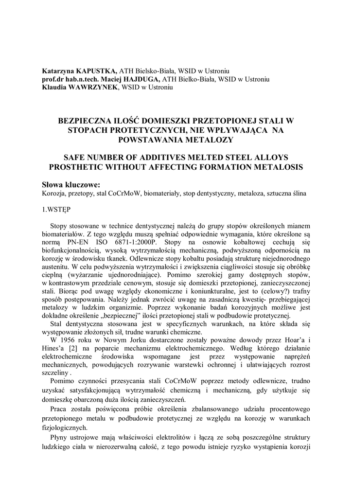 Katarzyna KAPUSTKA, ATH Bielsko-Biała, WSID w Ustroniu prof.dr hab.n.tech. Maciej HAJDUGA, ATH Bielko-Biała, WSID w Ustroniu Klaudia WAWRZYNEK, WSID w Ustroniu BEZPIECZNA ILOŚĆ DOMIESZKI PRZETOPIONEJ STALI W STOPACH PROTETYCZNYCH, NIE WPŁYWAJĄCA NA POWSTAWANIA METALOZY SAFE NUMBER OF ADDITIVES MELTED STEEL ALLOYS PROSTHETIC WITHOUT AFFECTING FORMATION METALOSIS Słowa kluczowe: Korozja, przetopy, stal CoCrMoW, biomateriały, stop dentystyczny, metaloza, sztuczna ślina 1.WSTĘP Stopy stosowane w technice dentystycznej należą do grupy stopów określonych mianem biomateriałów. Z tego względu muszą spełniać odpowiednie wymagania, które określone są normą PN-EN ISO 6871-1:2000P. Stopy na osnowie kobaltowej cechują się biofunkcjonalnością, wysoką wytrzymałością mechaniczną, podwyższoną odpornością na korozję w środowisku tkanek. Odlewnicze stopy kobaltu posiadają strukturę niejednorodnego austenitu. W celu podwyższenia wytrzymałości i zwiększenia ciągliwości stosuje się obróbkę cieplną (wyżarzanie ujednorodniające). Pomimo szerokiej gamy dostępnych stopów, w kontrastowym przedziale cenowym, stosuje się domieszki przetopionej, zanieczyszczonej stali. Biorąc pod uwagę względy ekonomiczne i koniunkturalne, jest to (celowy?) trafny sposób postępowania. Należy jednak zwrócić uwagę na zasadniczą kwestię- przebiegającej metalozy w ludzkim organizmie. Poprzez wykonanie badań korozyjnych możliwe jest dokładne określenie „bezpiecznej” ilości przetopionej stali w podbudowie protetycznej. Stal dentystyczna stosowana jest w specyficznych warunkach, na które składa się występowanie złożonych sił, trudne warunki chemiczne. W 1956 roku w Nowym Jorku dostarczone zostały poważne dowody przez Hoar’a i Hines’a [2] na poparcie mechanizmu elektrochemicznego. Według którego działanie elektrochemiczne środowiska wspomagane jest przez występowanie naprężeń mechanicznych, powodujących rozrywanie warstewki ochronnej i ułatwiających rozrost szczeliny . Pomimo czynności przesycania stali CoCrMoW poprzez metody odlewnicze, trudno uzyskać satysfakcjonującą wytrzymałość chemiczną i mechaniczną, gdy użytkuje się domieszkę obarczoną duża ilością zanieczyszczeń. Praca została poświęcona próbie określenia zbalansowanego udziału procentowego przetopionego metalu w podbudowie protetycznej ze względu na korozję w warunkach fizjologicznych. Płyny ustrojowe mają właściwości elektrolitów i łączą ze sobą poszczególne struktury ludzkiego ciała w nierozerwalną całość, z tego powodu istnieje ryzyko wystąpienia korozji XI Konferencja Naukowa Majówka Młodych Biomechaników im. prof. Dagmary Tejszerskiej s. 52 stopów podbudowy. Udowodniono, że nawet kilkunastogodzinny kontakt śliny z metalem może źle wpływać na zdrowie użytkownika i przyczyniać się do powstania ogólnoustrojowych chorób, bólu i, dyskomfortu lub znacznego pogorszenia samopoczucia. 2. BADANIA KOROZYJNE Z ZASTOSOWANIEM PŁYNÓW FIZJOLOGICZNYCH 2.1. Cel pracy Celem pracy była ocena prawidłowego stosunku ilościowego przetopionego metalu i stali prefabrykowanej. W zamiarze określenia optymalnego układu, który będzie najmniej obarczony korozją wżerową i naprężeniową. Przy zastosowaniu odwzorowanego naturalnego otoczenia, sztucznej śliny. Przyjęto stosunek różnicy w zakresie 10% dla poszczególnych wartości, aby uzyskać obiektywne i jednoznaczne wyniki. 2.2. Zakres pracy Zakres pracy obejmuje badania elektrochemiczne (potencjodynamiczne) odporności korozyjnej wybranych stopów. Wykorzystany został stop dentystyczny CoCrMoW firmy KERALLOY KB z odpowiednią ilością domieszki przetopionej stali. Jako środowisko fizjologiczne przyjęto wyłącznie sztuczną ślinę, ze względu na to że stop jest użytkowany w takim otoczeniu. Zachowano parametry zbliżone do ludzkiego organizmu; temperaturę 36,6°C, - 37°C, oraz ph=7. Dominującymi pierwiastkami strukturalnymi jest Co, Cr, Mo, W odpowiednich proporcjach procentowych składników. Wykonano także badania korozji materiału rodzimego i w 100% przetopionego. Na podstawie powyższych badań można ocenić wytrzymałość chemiczną poszczególnych próbek. 2.3. Wnioski Na postawie przeprowadzonych badań można wnosić co następuje: 1. Rodzaj środowiska korozyjnego wpływa na gęstość prądów katodowych oraz potencjał przejścia katodowo-anodowego po 10-minutowej ekspozycji w roztworze korozyjnym; 2. Największy wzrost potencjału zarodkowania wżeru (EW) stwierdzono dla próbek posiadających ponad 50% przetopionej stali; 3. W ocenie jednoznacznej szybkości zachodzenia korozji zastosowano proste Tafela przy zastosowaniu otoczenia sztucznej śliny. LITERATURA [1] M. Hajduga, A. Kalukin, B. Kalukin, Ochrona przed korozją - wydanie specjalne 11s/A, 187 (2007). [2] Hoar, T. P., Hines, J. G.: J. Iron and Steel Inst., 182, 124 , 1956. [3], Loch J. , Krawiec H.: Zachowanie korozyjne stopów kobaltu w roztworze sztucznej śliny. Katedra Chemii i Korozji Metali, Wydział Odlewnictwa, 2013 [4] Plaskota B., Błaszczyk T.: „Elektrochemiczne badania korozji biomateriałów”, Inżynieria Biomateriałów, R.7, nr 35-36, 2004 [5] A. Michajlik, W. Ramotowski, Anatomia i fizjologia człowieka, PZWL, Warszawa (2007).
