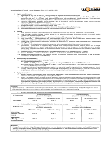 Szczegółowe Warunki Promocji Internet-Telewizja na Święta 2016 z dnia 2016.12.01 1 Ogólne warunki Promocji 1.1 Promocja trwa od 2016.12.01 do 2016.12.31. Zastrzegamy prawo do skrócenia czasu obowiązywania Promocji. 1.2 Z Promocji może skorzystać wyłącznie Nowy Abonent będący Konsumentem w rozumieniu Ustawy z dnia 16 lipca 2004 r. Prawo telekomunikacyjne (art. 2 ust. 18 Ustawy Prawo telekomunikacyjne), który zawrze z Operatorem Umowę Promocyjną o świadczenie usług telekomunikacyjnych na czas określony 24 pełnych Okresów Rozliczeniowych obejmującą Usługę Internetową. 1.3 Dodatkowo Nowy Abonent zawierający umowę określoną w pkt 1.2. powyżej, ma możliwość zamówienia w ramach Umowy Promocyjnej następujących Usług na warunkach niniejszej Promocji: 1.3.1 Usługa Telewizyjna JAMBOX w wariancie MINI HD lub Wielotematyczny HD. 1.4 Wszystkie ceny podane w niniejszym dokumencie są cenami brutto. 1.5 Wszystkie opłaty abonamentowe podane w niniejszym dokumencie dotyczą jednego Okresu Rozliczeniowego. 1.6 Promocja jest ograniczona terytorialnie, dostępna po uzgodnieniach technicznych w danej lokalizacji. 2 Definicje 2.1 Usługa Internetowa (Internet) – usługa stałego dostępu do internetu, realizowana na łączu Operatora, realizowanym w technologii ETTH. 2.2 Usługa Telewizyjna JAMBOX (Telewizja, JAMBOX)– usługa telewizji kablowej umożliwiająca dostęp do programów telewizyjnych, zgodnie z wybrany przez Abonenta wariantem usługi. 2.3 Multiroom – Usługa Telewizyjna świadczona na drugim i trzecim Urządzeniu STB na tym samym łączu Operatora. 2.4 Pakiet Usług (Pakiet) - Usługa Internetowa wraz Usługą Telewizyjną JAMBOX, zakupione łącznie na warunkach niniejszej Promocji: usługi świadczone są przez Operatora pod tym samym adresem, za pomocą tego samego łącza. 2.5 Urządzenie STB – dekoder telewizyjny, udostępniany Abonentowi w ramach umowy o świadczenie usługi telekomunikacyjnej w celu korzystania z Usługi Telewizyjnej. 2.6 ETTH (Ethernet) – technologia świadczenia przez Operatora Usług, wykorzystywana w budowie lokalnych sieci komputerowych. 2.7 Nowy Abonent – Abonent, który nie posiadał w okresie ostatnich 30 dni poprzedzających rozpoczęcie niniejszej Promocji oraz nie posiada aktualnie obowiązujące Umowy w zakresie Usługi, na którą ma być zawarta nowa Umowa. Nowa umowa nie może być zawarta na ten sam adres instalacji Usługi, w którym okresie ostatnich 30 dni poprzedzających datę rozpoczęcia niniejszej Promocji świadczona była Usługa, na którą ma być zawarta nowa Umowa. 2.8 Umowa Promocyjna – Umowa na warunkach promocyjnych określonych w niniejszych Szczegółowych Warunkach Promocji. 2.9 Operator – PROMEDIA s.c. z siedzibą w Kluczborku, ul. Zamkowa 6, 46-200 Kluczbork, NIP 751-172-58-54, REGON 160169120. 2.10 Pozostałe terminy pisane wielką literą mają znaczenie określone w Regulaminie Świadczenia Usług przez PROMEDIA s.c. oraz w Cennikach poszczególnych Usług dostępnych w ramach Promocji. 3 Usługi dostępne w ramach Promocji 3.1 W ramach niniejszej Promocji oferujemy następujące Usługi: 3.1.1 Usługę Internetową w wariancie: 3.1.1.1 LAN 100Mbps w technologii ETTH - z prędkością nie większą niż 100 Mbit/s do Abonenta i 20Mbit/s od Abonenta 3.1.2 Usługę Telewizyjną JAMBOX dostępna wyłącznie w Pakiecie z Usługą Internetową LAN 100Mbps. Usługa Telewizyjna JAMBOX oferowana jest wariancie MINI HD i Wielotematyczny HD. 3.2 Brak możliwości technicznych Operatora do świadczenia Usługi Internetowej lub Usługi Telewizyjnej JAMBOX w lokalizacji wskazanej w Umowie powoduje, iż Umowa nie może zostać zawarta, a jeśli Umowę zawarto, Abonent ma prawo do odstąpienia od niej w całości lub w części dotyczącej danej Usługi, przy zachowaniu określonych w Umowie warunków Usług, z których może korzystać w danej lokalizacji. 4 Opłaty abonamentowe 4.1 W ramach niniejszej Promocji obniżamy opłaty abonamentowe za korzystanie z Usług, zgodnie z tabelami poniżej, o ile zawarta Umowa zawiera zamówienie odpowiednich usług dodatkowych wskazanych w pkt. 1.2 i 1.3. 4.2 Rabat za e-Fakturę przyznajemy w przypadku wyrażenia zgody przez Abonenta na dostarczanie Rachunku w formie elektronicznej (e-faktury) oraz wykonywania terminowych płatności (wpływ należności na rachunek bankowy Operatora do ostatniego dnia wskazanego w Rachunku jako termin zapłaty) w wysokości 5,00 zł na abonament za Usługę Internetową w każdym Okresie Rozliczeniowym. W pierwszym Okresie Rozliczeniowym rabat przyznawany jest automatycznie w przypadku posiadania aktywnej e-faktury. W kolejnym Okresie Rozliczeniowym rabat zostanie przyznany przy spełnieniu warunku aktywnej e-faktury na dzień wystawiania Rachunku oraz terminowego opłacenia poprzedniego Rachunku. Komentarz: Wystawiana przez nas e-faktura stanowi dokument księgowy, który ma taką samą wartość jak faktura w wersji papierowej. W przypadku rezygnacji z e-faktury i/lub nie opłacania faktury w terminie nie będziemy udzielali rabatu w wysokości 5 zł na abonament za Usługę Internetową. 4.3 Dla Usługi Internetowej w technologii ETTH opłaty abonamentowe wynoszą: A. Wariant usługi LAN 100 Mbps 4.4 B. Opłata abonamentowa przy umowie 24-miesięcznej C. Opłata abonamentowa przy umowie na czas nieokreślony z Rabatem za e-fakturę bez Rabatu za e-fakturę z Rabatem za e-fakturę bez Rabatu za e-fakturę 40,00 zł 45,00 zł 80,00 zł 85,00 zł Dla Pakietu Usług Internetowej z Telewizyjną JAMBOX opłaty abonamentowe wynoszą: A. Wariant usługi B. Opłata abonamentowa przy umowie 24-miesięcznej C. Opłata abonamentowa przy umowie na czas nieokreślony z Rabatem za e-fakturę bez Rabatu za e-fakturę z Rabatem za e-fakturę bez Rabatu za e-fakturę LAN 100 Mbps z Telewizją w wariancie MINI HD 60,00 zł 65,00 zł 150,00 zł 155,00 zł LAN 100 Mbps z Telewizją w wariancie Wielotematyczny HD 80,00 zł 85,00 zł 190,0