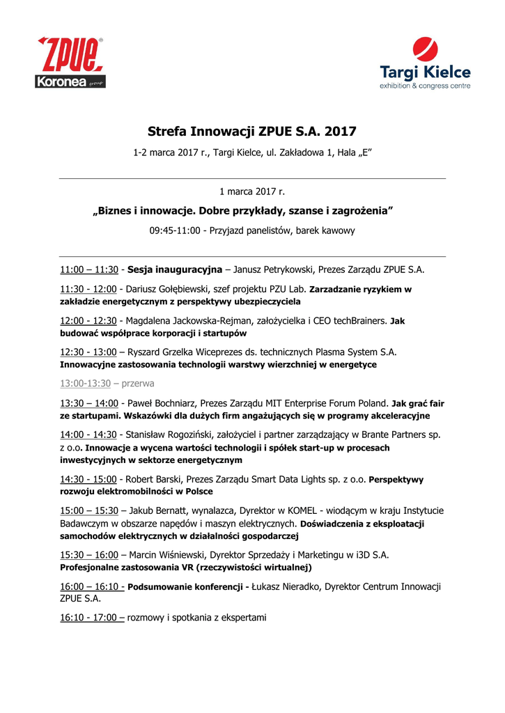 Strefa Innowacji ZPUE S.A. 2017 1-2 marca 2017 r., Targi Kielce, ul. Zakładowa 1, Hala „E” 1 marca 2017 r. „Biznes i innowacje. Dobre przykłady, szanse i zagrożenia” 09:45-11:00 - Przyjazd panelistów, barek kawowy 11:00 – 11:30 - Sesja inauguracyjna – Janusz Petrykowski, Prezes Zarządu ZPUE S.A. 11:30 - 12:00 - Dariusz Gołębiewski, szef projektu PZU Lab. Zarzadzanie ryzykiem w zakładzie energetycznym z perspektywy ubezpieczyciela 12:00 - 12:30 - Magdalena Jackowska-Rejman, założycielka i CEO techBrainers. Jak budować współprace korporacji i startupów 12:30 - 13:00 – Ryszard Grzelka Wiceprezes ds. technicznych Plasma System S.A. Innowacyjne zastosowania technologii warstwy wierzchniej w energetyce 13:00-13:30 – przerwa 13:30 – 14:00 - Paweł Bochniarz, Prezes Zarządu MIT Enterprise Forum Poland. Jak grać fair ze startupami. Wskazówki dla dużych firm angażujących się w programy akceleracyjne 14:00 - 14:30 - Stanisław Rogoziński, założyciel i partner zarządzający w Brante Partners sp. z o.o. Innowacje a wycena wartości technologii i spółek start-up w procesach inwestycyjnych w sektorze energetycznym 14:30 - 15:00 - Robert Barski, Prezes Zarządu Smart Data Lights sp. z o.o. Perspektywy rozwoju elektromobilności w Polsce 15:00 – 15:30 – Jakub Bernatt, wynalazca, Dyrektor w KOMEL - wiodącym w kraju Instytucie Badawczym w obszarze napędów i maszyn elektrycznych. Doświadczenia z eksploatacji samochodów elektrycznych w działalności gospodarczej 15:30 – 16:00 – Marcin Wiśniewski, Dyrektor Sprzedaży i Marketingu w i3D S.A. Profesjonalne zastosowania VR (rzeczywistości wirtualnej) 16:00 – 16:10 - Podsumowanie konferencji - Łukasz Nieradko, Dyrektor Centrum Innowacji ZPUE S.A. 16:10 - 17:00 – rozmowy i spotkania z ekspertami