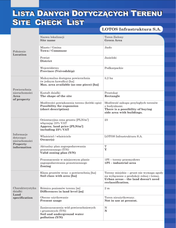 LISTA DANYCH DOTYCZĄCYCH TERENU SITE CHECK LIST LOTOS Infrastruktura S.A. Położenie Location Powierzchnia nieruchomości Area of property Informacje dotyczące nieruchomości Property information Charakterystyka działki Land specification Nazwa lokalizacji Site name Teren Zielony Green Area Miasto / Gmina Town / Commune Jasło Powiat District Jasielski Województwo Province (Voivodship) Podkarpackie Maksymalna dostępna powierzchnia (w jednym kawałku) [ha] Max. area available (as one piece) [ha] 5,2 ha Kształt działki The shape of the site Prostokąt Rectangle Możliwości powiększenia terenu (krótki opis) Possibility for expansion (short description) Możliwość zakupu przyległych terenów z budynkami. There is a possibility of buying side area with buildings. Orientacyjna cena gruntu [PLN/m2] włączając 23% VAT Approx. land price [PLN/m2] including 23% VAT 23 Właściciel / właściciele Owner(s) LOTOS Infrastruktura S.A. Aktualny plan zagospodarowania przestrzennego (T/N) Valid zoning plan (Y/N) T Y Przeznaczenie w miejscowym planie zagospodarowania przestrzennego Zoning 1PI – tereny przemysłowe 1PI – industrial area Klasa gruntów wraz z powierzchnią [ha] Soil class with area [ha] Tereny miejskie – grunt nie wymaga zgody na wyłączenie z produkcji rolnej i leśnej. Urban areas – the land doesn't need reclassification. Różnica poziomów terenu [m] Differences in land level [m] 2m Obecne użytkowanie Present usage Teren nieużytkowany. Not in use at present. Zanieczyszczenia wód powierzchniowych i gruntowych (T/N) Soil and underground water pollution (Y/N) N N Charakterystyka działki Land specification Połączenia transportowe Transport links Istniejąca infrastruktura Existing infrastructure Poziom wód gruntowych m Underground water level m Niski Low Czy były prowadzone badania geologiczne terenu (T/N) Were geological research done (Y/N) N N Ryzyko wystąpienia zalań lub obsunięć terenu (T/N) Risk of flooding or land slide (Y/N) N N Przeszkody podziemne (T/N) Underground obstacles (Y/N) N N Przeszkody występujące na powierzchni terenu (T/N) Ground and overhead obstacles (Y/N) N N Istniejące ograniczenia ekologiczne (T/N) Ecological restrictions (Y/N) N N Budynki i zabudowania na terenie (T/N) Buildings / other constructions on site (Y/N) N N Droga dojazdowa do terenu (rodzaj drogi i jej szerokość) Access road to the plot (type and width of access road) Droga wewnątrzzakładowa, szerokość 8 m. The in plant road, 8 m of width. Autostrada / droga krajowa [km] Nearest motorway / national road [km] Autostrada / Motorway – 60 km Droga krajowa nr 28 – 2 km National road no 28 – 2 km Kolej [km] Railway line [km] Jasło Bocznica kolejowa [km] Railway siding [km] Bocznica zakładowa The in plant railway siding Najbliższe lotnisko międzynarodowe [km] Nearest international airport [km] Rzeszów - Jasionka - 80 km Najbliższe miasto wojewódzkie [km] Nearest province capital [km] Rzeszów - 65 km Elektryczność na terenie (T/N) Electricity (Y/N) N N Odległość przyłącza od granicy terenu Connection point (distance from boundary) [m] 250 m Napięcie Voltage [kV] 6 kV Dostępna moc Available capacity [MW] 1,6 MW Gaz na terenie (T/N) Gas (Y/N) Odległość przyłącza od granicy działki Connection point (distance from boundary) [m] 300 m Wartość kaloryczna Calorific value [MJ/Nm3] 38 MJ/Nm3 Średnica rury Pipe diameter [mm] 150 Dostępna objętość Available capacity [Nm3/h] 250 Nm3/h Woda na terenie (T/N) Water supply (Y/N) Istniejąca infrastruktura Existing infrastructure T T Odległość przyłącza od granicy terenu Connection point (distance from boundary) [m] 300 m Dostępna objętość Available capacity [m3/24h] 1200 m3/24h Kanalizacja na terenie (T/N) Sewage discharge (Y/N) N N Odległość przyłącza od granicy terenu Connection point (distance from boundary) [m] 50 m Dostępna objętość Available capacity [m3/24h] 1200 m3/24h Oczyszczalnia ścieków na terenie bądź w bezpośrednim sąsiedztwie Treatment plant (Y/N) T Y Telefony (T/N) Telephone (Y/N) N N Odległość przyłącza od granicy terenu Connection point (distance from boundary) [m] Uwagi Comments N N 100 m Inne informacje o terenie / Extra information about the area 1) Teren wchodzący w skład Tarnobrzeskiej Specjalnej Strefy Ekonomicznej / The area is located in the Tarnobrzeg Special Economic Zone; 2. Bocznica kolejowa z wagą / Railway siding with scales; 3) Waga samochodowa w pobliżu / Car scales in the vicinity; 4) Teren w ogrodzeniu / Fenced area; 5) Teren monitorowany i strzeżony całodobowo / Area is monitored and guareded round the clock. 10 atutów Jasła jako lokalizacji inwestycji 1. Bogate i ugruntowane historycznie tradycje przemysłowe (przemysł naftowy, chemiczny, szklarski, maszynowy, spożywczy i meblowy). 2. Lokalizacja firm prowadzących sprzedaż na rynkach międzynarodowych, np.: - Grupa Nowy Styl – zajmująca 4 miejsce w zestawieniu największych grup meblowych w Europie, posiadająca 15 fabryk (w Polsce, Niemczech, Rosji i Ukrainie), prowadząca sprzedaż do 70 krajów (eksport stanowi 60% produkcji); Uwagi Comments - Grupa Orion Engineered Carbons - producent sadz technicznych stosowanych w produkcji mieszanek gumowych do opon samochodowych, wyrobów gumowych i galanterii gumowej; posiada 15 fabryk na całym świecie (m.in. w Niemczech, Francji, Portugalii, Włoszech, USA, Brazylii, Korei), obecna w 100 krajach; centrala grupy znajduje się w Niemczech; - Naturex SA – francuska grupa, będąca światowym liderem w produkcji naturalnych składników pochodzenia roślinnego, posiada 15 fabryk na całym świecie (m.in. we Francji, Australii, Maroko, USA, Chinach); - Fabryka Armatur Jafar SA – producent armatury żeliwnej do wody, gazu, ścieków, jak również armatury sanitarnej i sieci domowej; 50% produkcji jest eksportowana do 30 krajów; - Polwax SA – jeden z największych europejskich producentów i dystrybutorów parafiny rafi