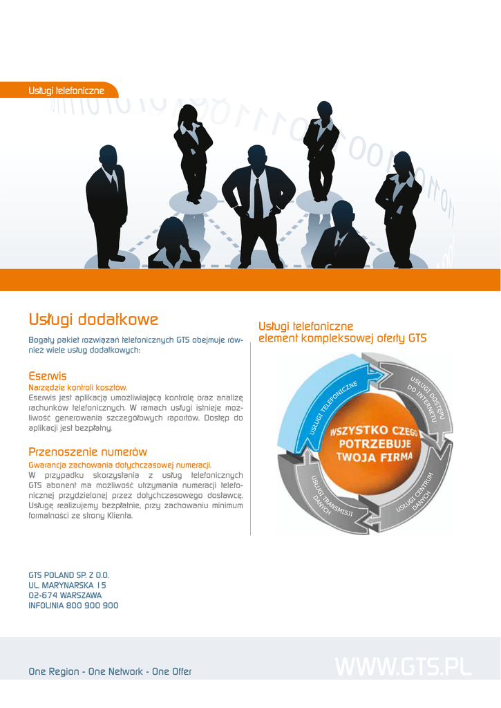 Usługi telefoniczne Usługi dodatkowe Bogaty pakiet rozwiązań telefonicznych GTS obejmuje również wiele usług dodatkowych: usługi telefoniczne element kompleksowej oferty GTS Eserwis Narzędzie kontroli kosztów. Eserwis jest aplikacją umożliwiającą kontrolę oraz analizę rachunków telefonicznych. W ramach usługi istnieje możliwość generowania szczegółowych raportów. Dostęp do aplikacji jest bezpłatny. Przenoszenie numerów Gwarancja zachowania dotychczasowej numeracji. W przypadku skorzystania z usług telefonicznych GTS abonent ma możliwość utrzymania numeracji telefonicznej przydzielonej przez dotychczasowego dostawcę. Usługę realizujemy bezpłatnie, przy zachowaniu minimum formalności ze strony Klienta. GTS Poland Sp. z o.o. ul. Marynarska 15 02-674 Warszawa infolinia 800 900 900 One Region - One Network - One Offer www.GTS.PL Niezawodna komunikacja kluczem do sukcesu Usługi telefoniczne Niezawodna komunikacja głosowa jest jednym z kluczowych czynników decydujących o jakości kontaktów z partnerami biznesowymi, kontrahentami i Klientami. GTS systematycznie rozwijając ofertę usług głosowych, koncentruje się na dostarczaniu rozwiązań, które odpowiadają na różnorodne potrzeby Klientów, pozwalają na optymalne wykorzystanie istniejącej infrastruktury i jednocześnie zapewniają racjonalizację wydatków. Dostarczamy usługi telekomunikacyjne wraz z pełnym wachlarzem opcji dodatkowych. Bez względu na wielkość, rodzaj prowadzonej działalności i strukturę, każda firma znajdzie w ofercie GTS korzystne dla siebie rozwiązania. Dlaczego warto korzystać z usług telefonicznych gts? Kompleksowa oferta usług telefonicznych • pełne portfolio usług - od telefonii tradycyjnej do zarządzanej telefonii IP - dostępne na terenie całego kraju • realne oszczędności przy zachowaniu wysokiej, gwarantowanej jakości świadczenia usług • optymalizacja wydatków inwestycyjnych w infrastrukturę telekomunikacyjną • usprawnienie komunikacji i strategicznych procesów biznesowych • wdrożenia niestandardowe dla Klientów o specyficznych potrzebach One Region - One Network - One Offer Usługi telefonii stacjonarnej www.GTS.PL Usługi sieci inteligentnych POŁĄCZENIA GŁOSOWE NA NAJWYŻSZYM POZIOMIE JAKOŚCIOWYM GTS posiada szeroki pakiet usług telefonii stacjonarnej. Różnorodność rozwiązań sprawia, że każda firma znajdzie produkt odpowiadający jej potrzebom. Dostęp ISDN Prefiks 1066 i Abonament Telefoniczny Internetowa Telefonia Cyfrowa (ITC) Usługi telefoniczne w standardzie cyfrowym. Dostęp ISDN zapewnia obsługę wielu jednoczesnych połączeń telefonicznych o gwarantowanej, wysokiej jakości i niezawodności. Usługa jest realizowana przez podłączenie centrali telefonicznej Klienta bezpośrednio do sieci telekomunikacyjnej GTS za pomocą dedykowanych łączy cyfrowych ISDN 30B+D. Tradycyjne usługi telefoniczne. Prefiks 1066 umożliwia wykonywanie połączeń przez sieć GTS ze stacjonarnych linii telefonicznych (analogowych i cyfrowych) przy wykorzystaniu numeru dostępowego do sieci GTS. Dodatkowo, możliwe jest przeniesienie abonamentu telefonicznego, od innego operatora do GTS, przy zachowaniu dotychczasowej numeracji i istniejącej infrastruktury. Telefonia VoIP. Internetowa Telefonia Cyfrowa umożliwia prowadzenie rozmów telefonicznych w technologii VoIP poprzez publiczną sieć Internet z wykorzystaniem tradycyjnych aparatów telefonicznych lub telefonów IP. Usługę charakteryzuje jakość porównywalna z innymi usługami telefonicznymi, duża elasty czność oraz łatwość zarządzania dzięki bezpiecznemu panelowi administracyjnemu. IP Telefonia Zaawansowana i zarządzana telefonia w sieci IP. IP Telefonia to usługa w pełni zarządzana przez GTS, która zapewnia nie tylko realizację połączeń telefonicznych, ale także integrację systemu telefonicznego z kolejnymi modułami rozszerzającymi możliwości komunikacyjne przedsiębiorstwa (serwer, voice mail, IVR, CallCenter). Rozwiąza- nie polega na udostępnieniu w lokalizacji Klienta sprzętu obsługującego wywołania telefoniczne za pośrednictwem sieci MPLS, przy zachowaniu gwarantowanej, wysokiej jakości i administracji GTS. Usługi telefonii stacjonarnej dedykowane są dla firm: • dynamicznie rozwijających się, oczekujących zintegrowanych i zarządzanych rozwiązań dla usług telefonicznych i transmisji danych • poszukujących efektywnych narzędzi komunikacji z małymi oddziałami lub filiami • oczekujących wzrostu efektywności poprzez zwiększenie dostępności komunikacyjnej pracowników • poszukujących możliwości optymalizacji kosztów połączeń telefonicznych • oczekujących oferty cenowej w pełni dopasowanej do ich indywidualnych potrzeb NOWOCZESNE FORMY KONTAKTU Z OTOCZENIEM BIZNESOWYM Usługi sieci inteligentnej realizowane przez GTS umożliwiają tworzenie nowych kanałów dystrybucji produktów i usług, pozyskiwanie Klientów, podniesienie standardu obsługi kontrahentów, promowanie marki oraz generowanie nowych źródeł przychodu. Umożliwiają także podniesienie efektywności komunikacji wewnętrznej. INfo Telekonferencje Numery Premium Efektywne zarządzanie połączeniami przychodzącymi na numery infolinii. Podstawowa funkcjonalność usługi INfo polega na udostępnieniu numeru infolinii bezpłatnej (800) lub częściowo płatnej (801) i dystrybucji połączeń przychodzących zgodnie ze zdefiniowanym scenariuszem. Zastosowanie rozwiązania znacząco ułatwiają komunikację z partnerami, Klientami oraz pomiędzy pracownikami firmy. Narzędzia komunikacji grupowej. Telekonferencja polega na realizacji połączeń wielostronnych, co umożliwia jednoczesne prowadzenie rozmowy wielu osobom, znajdującym się w dowolnych miejscach na świecie. Usługa może być zarządzana przez panel www lub z poziomu aparatu telefonicznego. Źródło dodatkowych przychodów. Usługi Premium wspierają potrzeby Klientów 