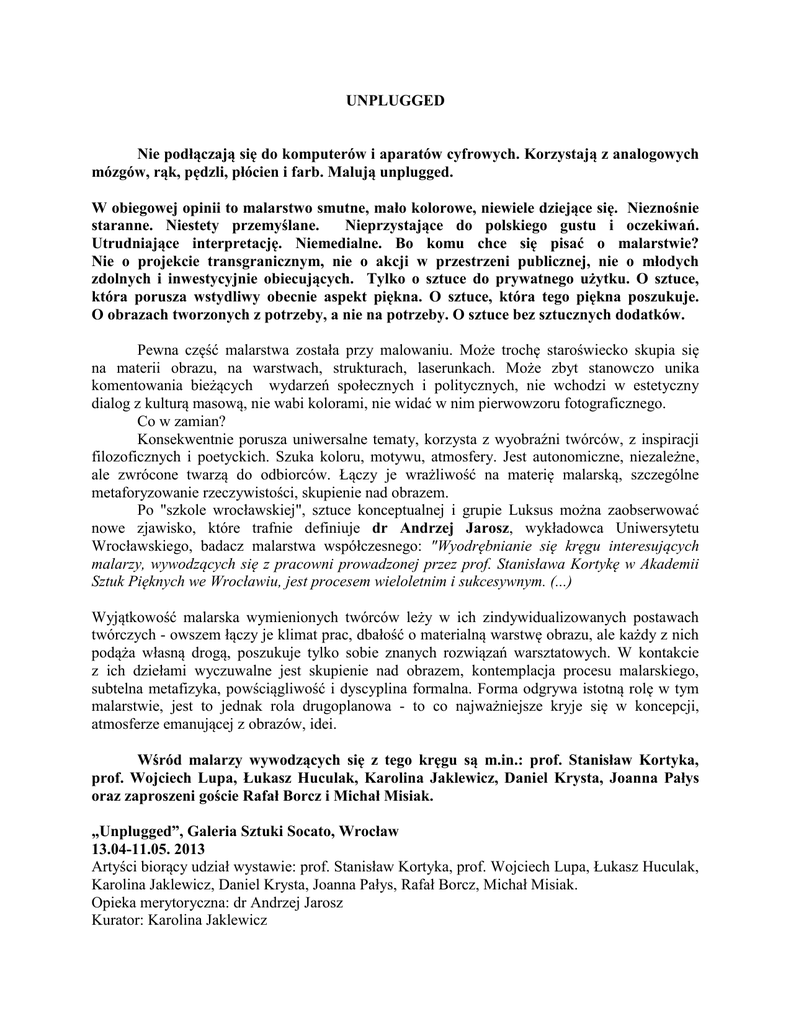 UNPLUGGED Nie podłączają się do komputerów i aparatów cyfrowych. Korzystają z analogowych mózgów, rąk, pędzli, płócien i farb. Malują unplugged. W obiegowej opinii to malarstwo smutne, mało kolorowe, niewiele dziejące się. Nieznośnie staranne. Niestety przemyślane. Nieprzystające do polskiego gustu i oczekiwań. Utrudniające interpretację. Niemedialne. Bo komu chce się pisać o malarstwie? Nie o projekcie transgranicznym, nie o akcji w przestrzeni publicznej, nie o młodych zdolnych i inwestycyjnie obiecujących. Tylko o sztuce do prywatnego użytku. O sztuce, która porusza wstydliwy obecnie aspekt piękna. O sztuce, która tego piękna poszukuje. O obrazach tworzonych z potrzeby, a nie na potrzeby. O sztuce bez sztucznych dodatków. Pewna część malarstwa została przy malowaniu. Może trochę staroświecko skupia się na materii obrazu, na warstwach, strukturach, laserunkach. Może zbyt stanowczo unika komentowania bieżących wydarzeń społecznych i politycznych, nie wchodzi w estetyczny dialog z kulturą masową, nie wabi kolorami, nie widać w nim pierwowzoru fotograficznego. Co w zamian? Konsekwentnie porusza uniwersalne tematy, korzysta z wyobraźni twórców, z inspiracji filozoficznych i poetyckich. Szuka koloru, motywu, atmosfery. Jest autonomiczne, niezależne, ale zwrócone twarzą do odbiorców. Łączy je wrażliwość na materię malarską, szczególne metaforyzowanie rzeczywistości, skupienie nad obrazem. Po "szkole wrocławskiej", sztuce konceptualnej i grupie Luksus można zaobserwować nowe zjawisko, które trafnie definiuje dr Andrzej Jarosz, wykładowca Uniwersytetu Wrocławskiego, badacz malarstwa współczesnego: "Wyodrębnianie się kręgu interesujących malarzy, wywodzących się z pracowni prowadzonej przez prof. Stanisława Kortykę w Akademii Sztuk Pięknych we Wrocławiu, jest procesem wieloletnim i sukcesywnym. (...) Wyjątkowość malarska wymienionych twórców leży w ich zindywidualizowanych postawach twórczych - owszem łączy je klimat prac, dbałość o materialną warstwę obrazu, ale każdy z nich podąża własną drogą, poszukuje tylko sobie znanych rozwiązań warsztatowych. W kontakcie z ich dziełami wyczuwalne jest skupienie nad obrazem, kontemplacja procesu malarskiego, subtelna metafizyka, powściągliwość i dyscyplina formalna. Forma odgrywa istotną rolę w tym malarstwie, jest to jednak rola drugoplanowa - to co najważniejsze kryje się w koncepcji, atmosferze emanującej z obrazów, idei. Wśród malarzy wywodzących się z tego kręgu są m.in.: prof. Stanisław Kortyka, prof. Wojciech Lupa, Łukasz Huculak, Karolina Jaklewicz, Daniel Krysta, Joanna Pałys oraz zaproszeni goście Rafał Borcz i Michał Misiak. „Unplugged”, Galeria Sztuki Socato, Wrocław 13.04-11.05. 2013 Artyści biorący udział wystawie: prof. Stanisław Kortyka, prof. Wojciech Lupa, Łukasz Huculak, Karolina Jaklewicz, Daniel Krysta, Joanna Pałys, Rafał Borcz, Michał Misiak. Opieka merytoryczna: dr Andrzej Jarosz Kurator: Karolina Jaklewicz