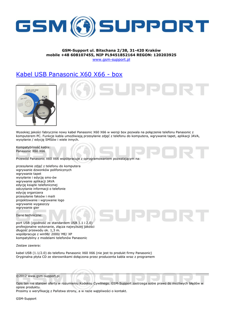 GSM-Support ul. Bitschana 2/38, 31-420 Kraków mobile +48 608107455, NIP PL9451852164 REGON: 120203925 www.gsm-support.pl Kabel USB Panasonic X60 X66 - box Wysokiej jakości fabrycznie nowy kabel Panasonic X60 X66 w wersji box pozwala na połączenie telefonu Panasonic z komputerem PC. Funkcje kabla umożliwiają przesyłanie zdjęć z telefonu do komputera, wgrywanie tapet, aplikacji JAVA, wysyłanie / edycję SMSów i wiele innych. Kompatybilność kabla: Panasonic X60 X66 Przewód Panasonic X60 X66 współpracuje z oprogramowaniem pozwalającym na: przesyłanie zdjęć z telefonu do komputera wgrywanie dzwonków polifonicznych wgrywanie tapet wysyłanie i edycję sms-ów wgrywanie aplikacji JAVA edycję książki telefonicznej odczytanie informacji o telefonie edycję organizera przesyłanie faksów i maili projektowanie i wgrywanie logo wgrywanie wygaszczy wgrywanie gier Dane techniczne: port USB (zgodność ze standardem USB 1.1 i 2.0) profesjonalne wykonanie, złącza najwyższej jakości długość przewodu ok. 1,3 m. współpracuje z win98/ 2000/ ME/ XP kompatybilny z modelami telefonów Panasonic Zestaw zawiera: kabel USB (1.1/2.0) do telefonu Panasonic X60 X66 (nie jest to produkt firmy Panasonic) Oryginalna płyta CD ze sterownikami dołączona przez producenta kabla wraz z programem ©2012 www.gsm-support.pl Opis ten nie stanowi oferty w rozumieniu Kodeksu Cywilnego. GSM-Support zastrzega sobie prawo do możliwych błędów w opisie produktu. Prosimy o weryfikację z Państwa strony, a w razie wątpliwości o kontakt. GSM-Support ul. Bitschana 2/38 31-420 Kraków POLSKA tel. 608107455 e-mail: [email protected] Powered by TCPDF (www.tcpdf.org)