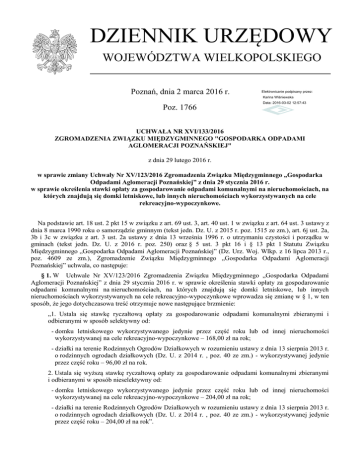 DZIENNIK URZĘDOWY WOJEWÓDZTWA WIELKOPOLSKIEGO Poznań, dnia 2 marca 2016 r. Elektronicznie podpisany przez: Karina Wiśniewska Poz. 1766 Data: 2016-03-02 12:57:43 UCHWAŁA NR XVI/133/2016 ZGROMADZENIA ZWIĄZKU MIĘDZYGMINNEGO "GOSPODARKA ODPADAMI AGLOMERACJI POZNAŃSKIEJ" z dnia 29 lutego 2016 r. w sprawie zmiany Uchwały Nr XV/123/2016 Zgromadzenia Związku Międzygminnego „Gospodarka Odpadami Aglomeracji Poznańskiej” z dnia 29 stycznia 2016 r. w sprawie określenia stawki opłaty za gospodarowanie odpadami komunalnymi na nieruchomościach, na których znajdują się domki letniskowe, lub innych nieruchomościach wykorzystywanych na cele rekreacyjno-wypoczynkowe. Na podstawie art. 18 ust. 2 pkt 15 w związku z art. 69 ust. 3, art. 40 ust. 1 w związku z art. 64 ust. 3 ustawy z dnia 8 marca 1990 roku o samorządzie gminnym (tekst jedn. Dz. U. z 2015 r. poz. 1515 ze zm.), art. 6j ust. 2a, 3b i 3c w związku z art. 3 ust. 2a ustawy z dnia 13 września 1996 r. o utrzymaniu czystości i porządku w gminach (tekst jedn. Dz. U. z 2016 r. poz. 250) oraz § 5 ust. 3 pkt 16 i § 13 pkt 1 Statutu Związku Międzygminnego „Gospodarka Odpadami Aglomeracji Poznańskiej” (Dz. Urz. Woj. Wlkp. z 16 lipca 2013 r., poz. 4609 ze zm.), Zgromadzenie Związku Międzygminnego „Gospodarka Odpadami Aglomeracji Poznańskiej” uchwala, co następuje: § 1. W Uchwale Nr XV/123/2016 Zgromadzenia Związku Międzygminnego „Gospodarka Odpadami Aglomeracji Poznańskiej” z dnia 29 stycznia 2016 r. w sprawie określenia stawki opłaty za gospodarowanie odpadami komunalnymi na nieruchomościach, na których znajdują się domki letniskowe, lub innych nieruchomościach wykorzystywanych na cele rekreacyjno-wypoczynkowe wprowadza się zmianę w § 1, w ten sposób, że jego dotychczasowa treść otrzymuje nowe następujące brzmienie: „1. Ustala się stawkę ryczałtową opłaty za gospodarowanie odpadami komunalnymi zbieranymi i odbieranymi w sposób selektywny od: - domku letniskowego wykorzystywanego jedynie przez część roku lub od innej nieruchomości wykorzystywanej na cele rekreacyjno-wypoczynkowe – 168,00 zł na rok; - działki na terenie Rodzinnych Ogrodów Działkowych w rozumieniu ustawy z dnia 13 sierpnia 2013 r. o rodzinnych ogrodach działkowych (Dz. U. z 2014 r. , poz. 40 ze zm.) - wykorzystywanej jedynie przez część roku – 96,00 zł na rok. 2. Ustala się wyższą stawkę ryczałtową opłaty za gospodarowanie odpadami komunalnymi zbieranymi i odbieranymi w sposób nieselektywny od: - domku letniskowego wykorzystywanego jedynie przez część roku lub od innej nieruchomości wykorzystywanej na cele rekreacyjno-wypoczynkowe – 204,00 zł na rok; - działki na terenie Rodzinnych Ogrodów Działkowych w rozumieniu ustawy z dnia 13 sierpnia 2013 r. o rodzinnych ogrodach działkowych (Dz. U. z 2014 r. , poz. 40 ze zm.) - wykorzystywanej jedynie przez część roku – 204,00 zł na rok”. Dziennik Urzędowy Województwa Wielkopolskiego –2– Poz. 1766 § 2. Wykonanie uchwały powierza się Zarządowi Związku Międzygminnego „Gospodarka Odpadami Aglomeracji Poznańskiej”. § 3. Uchwała wchodzi w życie po upływie 14 dni od dnia jej ogłoszenia w Dzienniku Urzędowym Województwa Wielkopolskiego. Przewodniczący Zgromadzenia Związku Międzygminnego "Gospodarka Odpadami Aglomeracji Poznańskiej" (-) Marian Szkudlarek