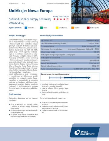29 stycznia 2016 r. str. 1 UniFundusze Fundusz Inwestycyjny Otwarty UniAkcje: Nowa Europa Subfundusz akcji Europy Centralnej i Wschodniej Ryzyko portfela: minimalne Polityka inwestycyjna Subfundusz inwestuje środki przede wszystkim w akcje emitentów z Europy Centralnej i Wschodniej lub akcje emitentów, których głównym obszarem działalności jest Europa Centralna i Wschodnia, a także w świadectwa depozytowe, np. ADR lub GDR. Udział akcji i innych papierów wartościowych o charakterze udziałowym w aktywach funduszu nie będzie niższy niż 60%. Przez akcje emitentów z Europy Centralnej i Wschodniej rozumie się akcje emitowane przez emitentów z krajów, takich jak: Litwa, Łotwa, Estonia, Polska, Czechy, Słowacja, Węgry, Słowenia, Turcja, Rosja, Ukraina, Macedonia, Chorwacja, Bośnia i Hercegowina, Serbia, Czarnogóra, Albania, Bułgaria, Rumunia, Cypr i Kazachstan. Lokaty subfunduszu w akcje i inne papiery wartościowe są dokonywane przede wszystkim na podstawie analizy fundamentalnej, w szczególności w przypadku papierów o charakterze udziałowym podstawowymi kryteriami będzie określenie rynkowych i technologicznych przewag firm oraz jakości zarządzania przedsiębiorstwem. Profil inwestora Subfundusz skierowany jest do inwestorów, którzy: •chcą uczestniczyć w zyskach spółek z siedzibą w krajach Europy Środkowej i Wschodniej, •chcą redukować ryzyko poprzez dywersyfikację geograficzną, •chcą mieć łatwy dostęp do rynków akcji krajów Europy Środkowej i Wschodniej, niskie umiarkowane wysokie bardzo wysokie Charakterystyka subfunduszu Typ subfunduszu subfundusz akcyjny Data dostosowania struktury portfela 1 sierpnia 2006 r. Firma zarządzająca Union Investment TFI S.A. Akcjonariusz firmy zarządzającej Union Asset Management Holding AG – 100% Min. pierwsza wpłata 100 PLN Maks. opłata manipulacyjna zgodnie z tabelą opłat 5% Maks. opłata za zarządzanie 3% Zarządzający Ryszard Rusak Wartość aktywów netto 31,04 mln PLN Wartość jednostki uczestnictwa 99,62 PLN Numer rachunku bankowego 59 1880 0009 0000 0013 0023 7004 Zalecany min. horyzont inwestycyjny: 5 •poszukują elastycznych możliwości inwestycyjnych o wysokiej płynności, •mają co najmniej 5-letni horyzont inwestycyjny, •akceptują bardzo wysokie ryzyko inwestycyjne. To nie jest subfundusz dla inwestorów: • dążących do uzyskania gwarantowanego zysku, • nieakceptujących wahań wartości inwestycji w krótkim terminie, • lokujących swoje środki krótkoterminowo. lat 29 stycznia 2016 r. str. 2 UniFundusze Fundusz Inwestycyjny Otwarty UniAkcje: Nowa Europa Subfundusz akcji Europy Centralnej i Wschodniej Ryzyko portfela: minimalne niskie umiarkowane wysokie bardzo wysokie Wyniki inwestycyjne subfunduszu i benchmarku* UniAkcje: Nowa Europa (%) 1m 3m 6m 1 rok 2 lata 5 lat 10 lat -1,91 -3,84 -6,66 -6,55 21,90 -5,56 – * Stopy zwrotu subfunduszu i benchmarku obliczane są na podstawie ostatnich dni roboczych miesiąca. Zmiana wartości jednostki UniAkcje: Nowa Europa 109 104 99 94 89 84 79 74 Sty ’11 Sie ’11 Mar ’12 Wrz ’12 Kwi ’13 Paź ’13 Maj ’14 Alokacja aktywów Gru ’14 Cze ’15 Sty ’16 Benchmark1 Akcje i inne instrumenty udziałowe 100,00% 0 20 40 60 80 Brak 100 ¹ Wzorcowy portfel, który stanowi punkt odniesienia do dokonywania oceny wyników zarządzania aktywami funduszu. 29 stycznia 2016 r. str. 3 UniFundusze Fundusz Inwestycyjny Otwarty UniAkcje: Nowa Europa Subfundusz akcji Europy Centralnej i Wschodniej Ryzyko portfela: minimalne niskie umiarkowane Alokacja geograficzna portfela akcyjnego Alokacja sektorowa portfela akcyjnego Inne 3,78% Ochrona zdrowia 0,51% Paliwa 1,05% Niemcy 5,33% Austria 5,53% Beta do benchmarku – współczynnik ten pokazuje zależność pomiędzy zmianami wartości jednostki funduszu a benchmarku. Wskaźnik beta wynoszący 1 oznacza, że zmiany wartości jednostki funduszu są takie same jak benchmarku, co sugeruje, że skład instrumentów funduszu jest tożsamy ze składem instrumentów w benchmarku. Beta o wartości mniejszej niż 1 oznacza, że wzrost (spadek) benchmarku o 1% jest zazwyczaj powiązany ze wzrostem (spadkiem) wartości jednostki funduszu o mniej niż 1%. Wartość beta większa niż 1 oznacza, że wzrost (spadek) benchmarku o 1% jest zazwyczaj powiązany ze wzrostem (spadkiem) wartości jednostki funduszu o więcej niż 1%. Przemysł 6,10% Surowce 9,97% Turcja 18,70% Technologie 9,99% Dobra kons. 12,61% Usługi 17,04% Polska 60,91% Finanse 39,02% Struktura walutowa PLN TRY HUF EUR CZK 62,53% 24,23% 5,75% 4,65% 2,84% 0 20 Współczynniki ryzyka 12 m Beta do benchmarku Beta do WIG Information ratio Tracking error – 0,46 – – Współczynnik Sharpe’a -0,80 Odchylenie standardowe 10,14% 40 60 80 bardzo wysokie Słowniczek Użytecz. pub. 3,71% Węgry 5,75% wysokie 100 Beta do WIG – współczynnik ten pokazuje zależność pomiędzy zmianami wartości jednostki funduszu a zmianami indeksu WIG. Wskaźnik beta wynoszący 1 oznacza, że zmiany wartości jednostki funduszu są takie same jak indeksu WIG. Beta o wartości mniejszej niż 1 oznacza, że wzrost (spadek) benchmarku o 1% jest zazwyczaj powiązany ze wzrostem (spadkiem) wartości indeksu WIG o mniej niż 1%. Wartość beta większa niż 1 oznacza, że wzrost (spadek) indeksu WIG o 1% jest zazwyczaj powiązany ze wzrostem (spadkiem) wartości jednostki funduszu o więcej niż 1%. Information ratio – współczynnik ten pokazuje, jak opłacalne jest ryzyko, jakie ponosi fundusz w stosunku do swojego benchmarku. Im wyższy poziom wskaźnika information ratio, tym przy niższym nakładzie ryzyka w stosunku do benchmarku został osiągnięty wynik funduszu. Fundusz, który osiąga information ratio powyżej 0,3, uważany jest za efektywnie zarządzany. Tracking error – współczynnik ten pokazuje, jak ryzykowny jest dany fundusz w stosunku do swojego benchmarku. Im wyższy wskaźnik, tym bardziej agresywnie zarządzany jest fundusz 
