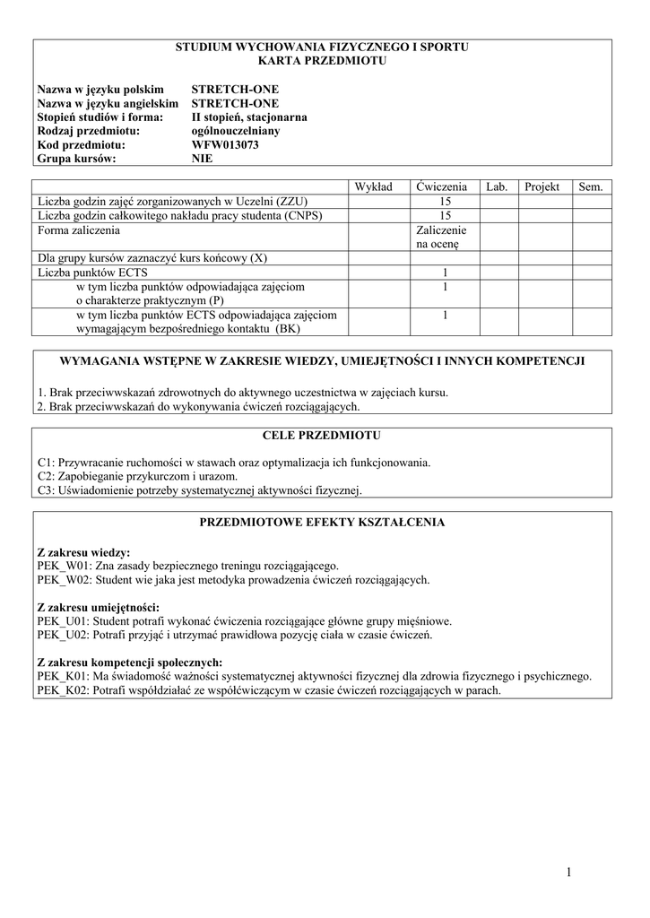 STUDIUM WYCHOWANIA FIZYCZNEGO I SPORTU KARTA PRZEDMIOTU Nazwa w języku polskim Nazwa w języku angielskim Stopień studiów i forma: Rodzaj przedmiotu: Kod przedmiotu: Grupa kursów: STRETCH-ONE STRETCH-ONE II stopień, stacjonarna ogólnouczelniany WFW013073 NIE Wykład Liczba godzin zajęć zorganizowanych w Uczelni (ZZU) Liczba godzin całkowitego nakładu pracy studenta (CNPS) Forma zaliczenia Ćwiczenia 15 15 Zaliczenie na ocenę Dla grupy kursów zaznaczyć kurs końcowy (X) Liczba punktów ECTS w tym liczba punktów odpowiadająca zajęciom o charakterze praktycznym (P) w tym liczba punktów ECTS odpowiadająca zajęciom wymagającym bezpośredniego kontaktu (BK) Lab. Projekt Sem. 1 1 1 WYMAGANIA WSTĘPNE W ZAKRESIE WIEDZY, UMIEJĘTNOŚCI I INNYCH KOMPETENCJI 1. Brak przeciwwskazań zdrowotnych do aktywnego uczestnictwa w zajęciach kursu. 2. Brak przeciwwskazań do wykonywania ćwiczeń rozciągających. CELE PRZEDMIOTU C1: Przywracanie ruchomości w stawach oraz optymalizacja ich funkcjonowania. C2: Zapobieganie przykurczom i urazom. C3: Uświadomienie potrzeby systematycznej aktywności fizycznej. PRZEDMIOTOWE EFEKTY KSZTAŁCENIA Z zakresu wiedzy: PEK_W01: Zna zasady bezpiecznego treningu rozciągającego. PEK_W02: Student wie jaka jest metodyka prowadzenia ćwiczeń rozciągających. Z zakresu umiejętności: PEK_U01: Student potrafi wykonać ćwiczenia rozciągające główne grupy mięśniowe. PEK_U02: Potrafi przyjąć i utrzymać prawidłowa pozycję ciała w czasie ćwiczeń. Z zakresu kompetencji społecznych: PEK_K01: Ma świadomość ważności systematycznej aktywności fizycznej dla zdrowia fizycznego i psychicznego. PEK_K02: Potrafi współdziałać ze współćwiczącym w czasie ćwiczeń rozciągających w parach. 1 TREŚCI PROGRAMOWE Forma zajęć - ćwiczenia Ćw. 1 Ćw. 2 Ćw. 3 Ćw. 4 Ćw. 5 Liczba godzin Zajęcia organizacyjne: omówienie przeciwwskazań zdrowotnych do wykonywania ćwiczeń rozciągających oraz zasad BHP obowiązujących na zajęciach. Kryteria usprawiedliwiania nieobecności, odrabiania i oceniania. Zapoznanie się z techniką wykonywania ćwiczeń rozciągających metodą „natural stretch”. Nauczanie utrzymania prawidłowej postawy ciała w każdym z ćwiczeń rozciągających objętych autorskim programem prowadzącego. Izometryczne ćwiczenia wzmacniające mięśnie grzbietu, brzucha i pośladków. Ćwiczenia rozciągające główne partie mięśniowe z wykorzystaniem wałka. Nauka poprawnego oddychania podczas ćwiczeń. Ćwiczenia rozciągające mięśnie z tendencją do przykurczu (wałek) Ćwiczenia wzmacniające mięśnie głębokie z wykorzystaniem niestabilnego podłożą (poduszki) oraz rozciągające główne grupy mięśniowe z naciskiem na mięśnie z tendencją do przykurczu. 2 2 2 2 2 Ćw. 6 Ćwiczenia wzmacniające mięśnie głębokie z wykorzystaniem niestabilnego podłożą (małe piłki) oraz rozciągające główne grupy mięśniowe z naciskiem na mięśnie z tendencją do przykurczu. 2 Ćw. 7 Ćwiczenia wzmacniające mięśnie głębokie z wykorzystaniem niestabilnego podłożą (piłki body ball) oraz rozciągające główne grupy mięśniowe z naciskiem na mięśnie z tendencją do przykurczu. 2 Ćw. 8 Zajęcia podsumowujące semestr. Ćwiczenia relaksacyjne. 1 Suma godzin 15 STOSOWANE NARZĘDZIA DYDAKTYCZNE N1. Ćwiczenia praktyczne. N2. Demonstracja prowadzącego (studenta). N3. Wykład. OCENA OSIĄGNIĘCIA PRZEDMIOTOWYCH EFEKTÓW KSZTAŁCENIA Oceny: F – formująca (w trakcie semestru), Numer efektu kształcenia Sposób oceny osiągnięcia efektu P – podsumowująca (na koniec semestru) kształcenia F1 PEK_W01,W02 Odpowiedź ustna, demonstracja. F2 PEK_U01,U02,K02 Demonstracja, frekwencja. P: Frekwencja, aktywność i postawa na zajęciach oraz średnia z ocen F1 i F2. LITERATURA PODSTAWOWA I UZUPEŁNIAJĄCA LITERATURA PODSTAWOWA: [1] Tsatsouline P.: Rozciąganie odprężone. Łódź: Wydawnictwo JK, 2010. [2] Listkowski M.: Stretching. Łódź: Wydawnictwo Marian Listkowski, 1994. [3] Clemenceau J-P., Delavier F., Gundill M.: Stretching. Ilustrowany Przewodnik. Warszawa: Wydawnictwo Lekarskie PZWL, 2012 LITERATURA UZUPEŁNIAJĄCA: [1] Ignasiak Z.: Anatomia układu ruchu. Wrocław: Wydawnictwo Medyczne Urban&Partner, 2012. OPIEKUN PRZEDMIOTU mgr Izabela Hrabańska, [email protected] 2 MACIERZ POWIĄZANIA EFEKTÓW KSZTAŁCENIA DLA PRZEDMIOTU STRETCH – ONE Przedmiotowy Odniesienie przedmiotowego efektu do Cele efekt efektów kształcenia zdefiniowanych przedmiotu** kształcenia dla obszarowych efektów kształcenia Posiada podstawową wiedzę z zakresu wybranej dyscypliny sportu (kursu wf) spośród kilkudziesięciu oferowanych Posiada podstawowe umiejętności z zakresu dyscyplin, którą wybrał, posiada, umiejętność włączenia się w prozdrowotny styl życia z wybraniem aktywności na całe życie oraz PEK_U02 kształtowania postaw sprzyjających całożyciowej aktywności fizycznej. Promuje społeczne i kulturowe znaczenie PEK_K01 (kompetencje) sportu i aktywności fizycznej oraz pielęgnuje własne upodobania z zakresu PEK_K02 kultury fizycznej. ** - z tabel powyżej PEK_W01 (wiedza) PEK_W02 PEK_U01 (umiejętności) Treści programowe** Numer narzędzia dydaktycznego** C1, C2, C3 Ćw. 1 - 8 N1, N2, N3 C1, C2, C3 Ćw. 1 - 8 N1, N2, N3 C1, C2, C3 Ćw. 1 - 8 N1, N2, N3 C1, C2, C3 Ćw. 1 - 8 N1, N2, N3 C1, C2, C3 Ćw. 1 - 8 N1, N2, N3 C1, C2, C3 Ćw. 1 - 8 N1, N2, N3 3