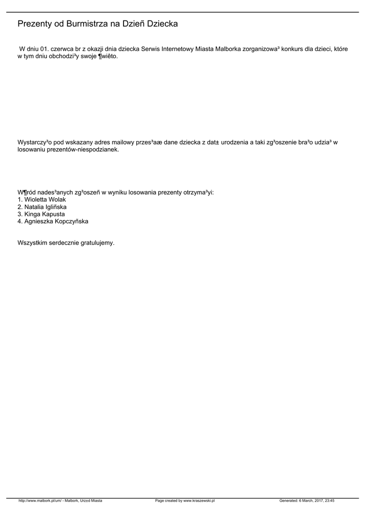 Prezenty od Burmistrza na Dzieñ Dziecka W dniu 01. czerwca br z okazji dnia dziecka Serwis Internetowy Miasta Malborka zorganizowa³ konkurs dla dzieci, które w tym dniu obchodzi³y swoje ¶wiêto. Wystarczy³o pod wskazany adres mailowy przes³aæ dane dziecka z dat± urodzenia a taki zg³oszenie bra³o udzia³ w losowaniu prezentów-niespodzianek. W¶ród nades³anych zg³oszeñ w wyniku losowania prezenty otrzyma³yi: 1. Wioletta Wolak 2. Natalia Igliñska 3. Kinga Kapusta 4. Agnieszka Kopczyñska Wszystkim serdecznie gratulujemy. http://www.malbork.pl/um/ - Malbork, Urz±d Miasta Page created by www.kraszewski.pl Generated: 6 March, 2017, 23:45