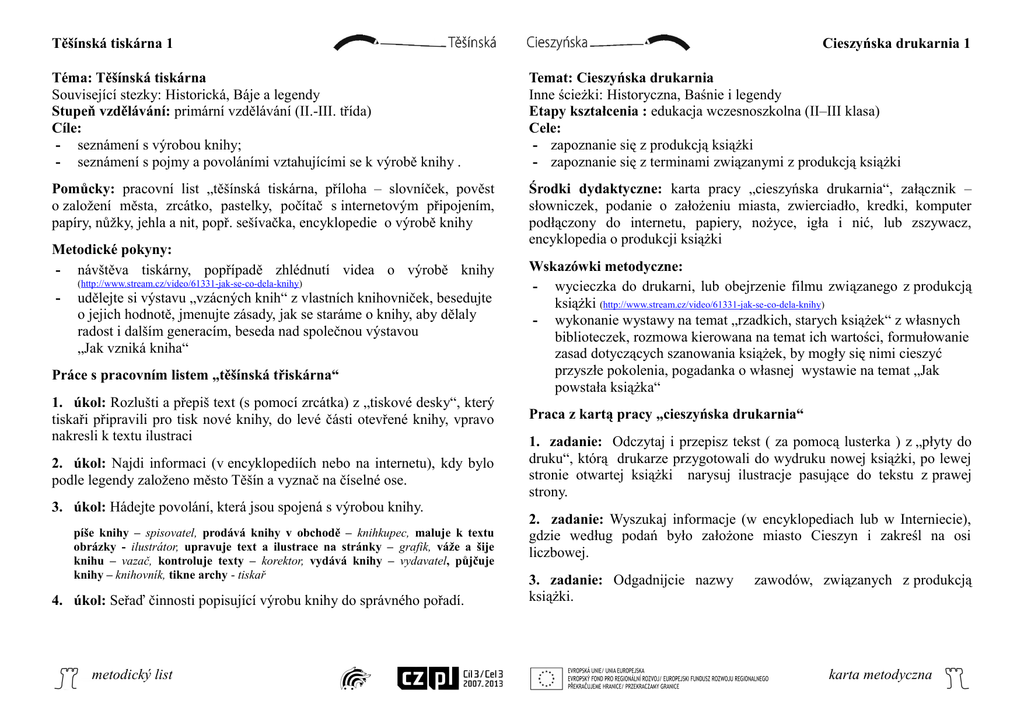 Těšínská tiskárna 1 Cieszyńska drukarnia 1 Téma: Těšínská tiskárna Související stezky: Historická, Báje a legendy Stupeň vzdělávání: primární vzdělávání (II.-III. třída) Cíle: - seznámení s výrobou knihy; - seznámení s pojmy a povoláními vztahujícími se k výrobě knihy . Temat: Cieszyńska drukarnia Inne ścieżki: Historyczna, Baśnie i legendy Etapy kształcenia : edukacja wczesnoszkolna (II–III klasa) Cele: - zapoznanie się z produkcją książki - zapoznanie się z terminami związanymi z produkcją książki Pomůcky: pracovní list „těšínská tiskárna, příloha – slovníček, pověst o založení města, zrcátko, pastelky, počítač s internetovým připojením, papíry, nůžky, jehla a nit, popř. sešívačka, encyklopedie o výrobě knihy Środki dydaktyczne: karta pracy „cieszyńska drukarnia“, załącznik – słowniczek, podanie o założeniu miasta, zwierciadło, kredki, komputer podłączony do internetu, papiery, nożyce, igła i nić, lub zszywacz, encyklopedia o produkcji książki Metodické pokyny: - návštěva tiskárny, popřípadě zhlédnutí videa o výrobě knihy (http://www.stream.cz/video/61331-jak-se-co-dela-knihy) - udělejte si výstavu „vzácných knih“ z vlastních knihovniček, besedujte o jejich hodnotě, jmenujte zásady, jak se staráme o knihy, aby dělaly radost i dalším generacím, beseda nad společnou výstavou „Jak vzniká kniha“ Práce s pracovním listem „těšínská třiskárna“ 1. úkol: Rozlušti a přepiš text (s pomocí zrcátka) z „tiskové desky“, který tiskaři připravili pro tisk nové knihy, do levé části otevřené knihy, vpravo nakresli k textu ilustraci 2. úkol: Najdi informaci (v encyklopediích nebo na internetu), kdy bylo podle legendy založeno město Těšín a vyznač na číselné ose. 3. úkol: Hádejte povolání, která jsou spojená s výrobou knihy. píše knihy – spisovatel, prodává knihy v obchodě – knihkupec, maluje k textu obrázky - ilustrátor, upravuje text a ilustrace na stránky – grafik, váže a šije knihu – vazač, kontroluje texty – korektor, vydává knihy – vydavatel, půjčuje knihy – knihovník, tikne archy - tiskař 4. úkol: Seřaď činnosti popisující výrobu knihy do správného pořadí. metodický list Wskazówki metodyczne: - wycieczka do drukarni, lub obejrzenie filmu związanego z produkcją książki (http://www.stream.cz/video/61331-jak-se-co-dela-knihy) - wykonanie wystawy na temat „rzadkich, starych książek“ z własnych biblioteczek, rozmowa kierowana na temat ich wartości, formułowanie zasad dotyczących szanowania książek, by mogły się nimi cieszyć przyszłe pokolenia, pogadanka o własnej wystawie na temat „Jak powstała książka“ Praca z kartą pracy „cieszyńska drukarnia“ 1. zadanie: Odczytaj i przepisz tekst ( za pomocą lusterka ) z „płyty do druku“, którą drukarze przygotowali do wydruku nowej książki, po lewej stronie otwartej książki narysuj ilustracje pasujące do tekstu z prawej strony. 2. zadanie: Wyszukaj informacje (w encyklopediach lub w Interniecie), gdzie według podań było założone miasto Cieszyn i zakreśl na osi liczbowej. 3. zadanie: Odgadnijcie nazwy książki. zawodów, związanych z produkcją karta metodyczna Těšínská tiskárna 2 Cieszyńska drukarnia 2 Správné řešení: 1. 2. 3. 4. 5. 6. 7. 8. 9. 10. 11. Setkání autora knihy a vydavatele. Obchodní schůzka vydavatele a tiskaře. Kontrola napsaného textu. Přenesení dat z počítače na tiskovou desku. Přenesení desek na tiskové válce a kopírování archů. Skládání archů – „falcování“ – do správného formátu. Seřazení stránek na „snášečce“ a výroba bloků (knih bez vazby). Výroba knižní desky. Šití, lisování a lepení bloků. Ořezání bloku a vlepení do knižní desky. Balení knih a rozvoz do knihkupectví. pisze książki – pisarz, kupuje i sprzedaje książki – księgarz, maluje obrazki do tekstu - ilustrator, opracowuje tekst i ilustracje na stronach – grafik, skleja i zszywa książke - introligator, sprawdza teksty – korektor, publikuje książki – wydawca, pożycza książki - bibliotekarz, drukuje arkusze z tekstem książki drukarz 4. zadanie: Przeanalizuj i ustaw w poprawnej kolejności etapy powstania książki. Poprawne rozwiazanie: 1. 2. 3. 4. 5. 6. 7. Zajímavé náměty: - vyrobte si svou vlastní knihu s měkkou vazbou v pracovních činnostech (památníček, adresář, společná třídní kniha zážitků, …) - vyberte ze slovníčku v příloze pojmy vztahující se k pohádce, napište a nakreslete si je do svého vlastního slovníčku, naučte se je v nářečí a polském jazyce 8. 9. 10. 11. Spotkanie autora i wydawcy książki. Spotkanie biznesowe wydawcy i drukarza Korekta napisanego tekstu. Przesyłanie danych z komputera na matrycę. Przesyłnie płyt do cylindrów drukarskich i kopiowanie arkuszy. Składanie i cięcie arkuszy w odpowiednim formacie. Sortowanie stron na specjalnej maszynie i składanie bloków z kartek (książki bez powiązania). Produkcja okładek do książek. Szycie, klejenie i prasowanie bloków. Cięcie bloku i wklejanie do okładek. Pakowanie książek i rozwożenie do księgarni. Inne pomysły: - metodický list zrób sobie swoją własną książkę z miekką oprawą (pamiętnik, wspólny dziennik przygód,…) poszukaj w słowniku w załączniku terminów związanych z bajką, wypisz je i narysuj do własnego słowniczka, naucz się ich brzmienia na pamięć również gwarą i w języku czeskim karta metodyczna