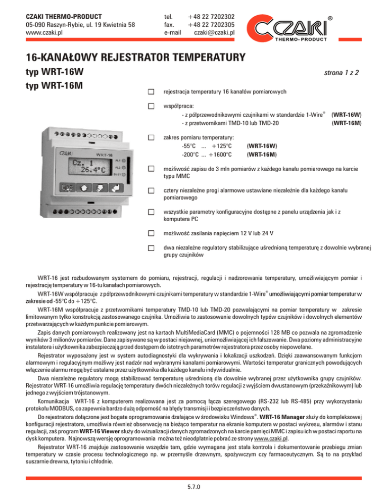 CZAKI THERMO-PRODUCT 05-090 Raszyn-Rybie, ul. 19 Kwietnia 58 www.czaki.pl tel. +48 22 7202302 fax. +48 22 7202305 e-mail [email protected] 16-KANAŁOWY REJESTRATOR TEMPERATURY typ WRT-16W typ WRT-16M strona 1 z 2 rejestracja temperatury 16 kanałów pomiarowych współpraca: ® - z półprzewodnikowymi czujnikami w standardzie 1-Wire (WRT-16W) - z przetwornikami TMD-10 lub TMD-20 (WRT-16M) zakres pomiaru temperatury: -55°C ... +125°C -200°C ... +1600°C (WRT-16W) (WRT-16M) możliwość zapisu do 3 mln pomiarów z każdego kanału pomiarowego na karcie typu MMC cztery niezależne progi alarmowe ustawiane niezależnie dla każdego kanału pomiarowego wszystkie parametry konfiguracyjne dostępne z panelu urządzenia jak i z komputera PC możliwość zasilania napięciem 12 V lub 24 V dwa niezależne regulatory stabilizujące uśrednioną temperaturę z dowolnie wybranej grupy czujników WRT-16 jest rozbudowanym systemem do pomiaru, rejestracji, regulacji i nadzorowania temperatury, umożliwiającym pomiar i rejestrację temperatury w 16-tu kanałach pomiarowych. ® WRT-16W współpracuje z półprzewodnikowymi czujnikami temperatury w standardzie 1-Wire umożliwiającymi pomiar temperatur w zakresie od -55°C do +125°C. WRT-16M współpracuje z przetwornikami temperatury TMD-10 lub TMD-20 pozwalającymi na pomiar temperatury w zakresie limitowanym tylko konstrukcją zastosowanego czujnika. Umożliwia to zastosowanie dowolnych typów czujników i dowolnych elementów przetwarzających w każdym punkcie pomiarowym. Zapis danych pomiarowych realizowany jest na kartach MultiMediaCard (MMC) o pojemności 128 MB co pozwala na zgromadzenie wyników 3 milionów pomiarów. Dane zapisywane są w postaci niejawnej, uniemożliwiającej ich fałszowanie. Dwa poziomy administracyjne instalatora i użytkownika zabezpieczają przed dostępem do istotnych parametrów rejestratora przez osoby niepowołane. Rejestrator wyposażony jest w system autodiagnostyki dla wykrywania i lokalizacji uszkodzeń. Dzięki zaawansowanym funkcjom alarmowym i regulacyjnym możliwy jest nadzór nad wybranymi kanałami pomiarowymi. Wartości temperatur granicznych powodujących włączenie alarmu mogą być ustalane przez użytkownika dla każdego kanału indywidualnie. Dwa niezależne regulatory mogą stabilizować temperaturę uśrednioną dla dowolnie wybranej przez użytkownika grupy czujników. Rejestrator WRT-16 umożliwia regulację temperatury dwóch niezależnych torów regulacji z wyjściem dwustanowym (przekaźnikowym) lub jednego z wyjściem trójstanowym. Komunikacja WRT-16 z komputerem realizowana jest za pomocą łącza szeregowego (RS-232 lub RS-485) przy wykorzystaniu protokołu MODBUS, co zapewnia bardzo dużą odporność na błędy transmisji i bezpieczeństwo danych. ® Do rejestratora dołączone jest bogate oprogramowanie dzałające w środowisku Windows . WRT-16 Manager służy do kompleksowej konfiguracji rejestratora, umożliwia również obserwację na bieżąco temperatur na ekranie komputera w postaci wykresu, alarmów i stanu regulacji, zaś program WRT-16 Viewer służy do wizualizacji danych zgromadzonych na karcie pamięci MMC i zapisu ich w postaci raportu na dysk komputera. Najnowszą wersję oprogramowania można też nieodpłatnie pobrać ze strony www.czaki.pl. Rejestrator WRT-16 znajduje zastosowanie wszędzie tam, gdzie wymagana jest stała kontrola i dokumentowanie przebiegu zmian temperatury w czasie procesu technologicznego np. w przemyśle drzewnym, spożywczym czy farmaceutycznym. Są to na przykład suszarnie drewna, tytoniu i chłodnie. 5.7.0 CZAKI THERMO-PRODUCT 05-090 Raszyn-Rybie, ul. 19 Kwietnia 58 www.czaki.pl tel. +48 22 7202302 fax. +48 22 7202305 e-mail [email protected] 16-KANAŁOWY REJESTRATOR TEMPERATURY typ WRT-16, WRT-16M strona 2 z 2 DANE TECHNICZNE WRT-16W: WRT-16M: dowolny o Æmin 6mm z elementem przetwornik TMD-10, TMD-20 przetwarzającym typu D (1-Wire®) np. TP992D Zakres pomiarowy -55...+125°C -200...+1600°C Błąd pomiaru ± 0,5 °C w zakresie -10 ... 85°C zgodnie z danymi TMD-10, TMD-20 ± 2,0 °C w zakresie -55...-10°C i 85...125°C Rozdzielczość 0,1°C Maksymalna liczba czujników 16 Opóźnienie toru pomiarowego ok. 2,5 s Rodzaj karty pamięci MultiMediaCard (MMC) 128MB Rodzaj wyjść przełączne styki przekaźnika 5 A, 250 V AC / 24 V DC 230 V AC +10% –15%, 50 Hz, 4 VA Zasilanie standardowe Zasilanie opcjonalne 10...30 V DC lub 10...26 V AC / 1,5W (wersja LV) Temperatura pracy 0.. +45 °C Wymiary (wys. x szer. x gł.) / ciężar 90 x 70 x 58 mm / ok. 290 g Interfejs do komunikacji z komputerem RS-485 lub RS-232 Sposób montażu na szynę 35 mm, DIN EN 50022-35 Typ czujnika/przetwornika SPOSÓB ZAMAWIANIA Kod zamówienia: (2) (3) WRT-16 (1) Wejście (2) Napięcie zasilania, jeżeli inne niż 230 V AC (3) Interfejs szeregowy, jeżeli inny niż RS-232 Przykłady zamawiania: (1) ® W - czujniki 1-Wire , M - przetworniki MODBUS-RTU LV RS-485 WRT-16M-LV-485 oznacza rejestrator temperatury przeznaczony do współpracy z przetwornikami MODBUS-RTU, zasilany niskim napięciem, z interfejsem komunikacyjnym RS-485 WRT-16W oznacza rejestrator temperatury przeznaczony do współpracy z czujnikami rodziny 1-Wire®, zasilany z sieci 230 V AC, z interfejsem komunikacyjnym RS-232 Na życzenie bezpłatne Świadectwo jakości lub odpłatne Świadectwo wzorcowania dla dowolnych temperatur z oznaczonymi odchyłkami 5.7.0