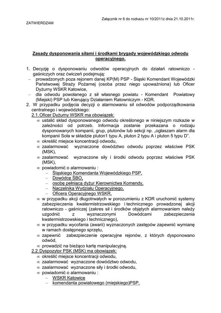 Załącznik nr 6 do rozkazu nr 10/2011z dnia 21.10.2011r. ZATWIERDZAM Zasady dysponowania siłami i środkami brygady wojewódzkiego odwodu operacyjnego. 1. Decyzję o dysponowaniu odwodów operacyjnych do działań ratowniczo gaśniczych oraz ćwiczeń podejmują: – prowadzonych poza rejonem danej KP(M) PSP - Śląski Komendant Wojewódzki Państwowej Straży Pożarnej (osoba przez niego upoważniona) lub Oficer Dyżurny WSKR Katowice, – dla odwodu powołanego z sił własnego powiatu - Komendant Powiatowy (Miejski) PSP lub Kierujący Działaniem Ratowniczym - KDR. 2. W przypadku podjęcia decyzji o alarmowaniu sił odwodów podporządkowania centralnego i wojewódzkiego: 2.1. Oficer Dyżurny WSKR ma obowiązek: • ustalić skład dysponowanego odwodu określonego w niniejszym rozkazie w zależności od potrzeb. Informacja zostanie przekazana o rodzaju dysponowanych kompanii, grup, plutonów lub sekcji np. „ogłaszam alarm dla kompanii Soła w składzie pluton1 typu A, pluton 2 typu A i pluton 5 typu D”. • określić miejsce koncentracji odwodu, • zaalarmować wyznaczone dowództwo odwodu poprzez właściwe PSK (MSK), • zaalarmować wyznaczone siły i środki odwodu poprzez właściwe PSK (MSK), • powiadomić o alarmowaniu : – Śląskiego Komendanta Wojewódzkiego PSP, – Dowódcę ŚBO, – osobę pełniącą dyżur Kierownictwa Komendy, – Naczelnika Wydziału Operacyjnego, – Oficera Operacyjnego WSKR, • w przypadku akcji długotrwałych w porozumieniu z KDR uruchomić systemy zabezpieczenia kwatermistrzowskiego i technicznego prowadzonej akcji ratowniczo - gaśniczej (zakres sił i środków objętych alarmowaniem należy uzgodnić z wyznaczonymi Dowódcami zabezpieczenia kwatermistrzowskiego i technicznego), • w przypadku wycofania (awarii) wyznaczonych zastępów zapewnić wymianę w ramach dostępnego sprzętu, • zapewnić zabezpieczenie operacyjne rejonów, z których dysponowano odwód, • prowadzić na bieżąco kartę manipulacyjną. 2.2. Dyspozytor PSK (MSK) ma obowiązek: • określić miejsce koncentracji odwodu, • zaalarmować wyznaczone dowództwo odwodu, • zaalarmować wyznaczone siły i środki odwodu, • powiadomić o alarmowaniu : – WSKR Katowice – komendanta powiatowego (miejskiego)PSP, • • • • – osobę pełniącą dyżur kierownictwa komendy, – dowódcę nieetatowej grupy operacyjnej w przypadku wycofania (awarii) wyznaczonych zastępów zapewnić wymianę w ramach dostępnego sprzętu, w przypadku alarmowania i dysponowania kompanii odwodowych OSP minimalny skład odwodu gotowego do wyjazdu wynosi 9 zastępów gaśniczych, zapewnić zabezpieczenie operacyjne rejonu w ramach dostępnych sił i środków lub poprzez WSKR, prowadzić na bieżąco kartę manipulacyjną. 3. W przypadku zaalarmowania sił i środków PSP wyznaczonych z jednostek woj. śląskiego do Centralnego Odwodu Operacyjnego, odwód podporządkowania wojewódzkiego utworzony na bazie jednostek PSP może być dysponowany poza rejon działania danej KP(M) PSP po osiągnięciu przez wyznaczone JRG podwyższonej gotowości bojowej.