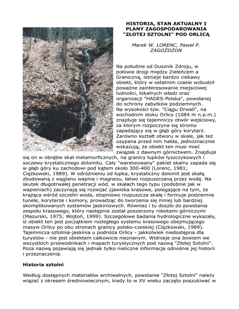 HISTORIA, STAN AKTUALNY I PLANY ZAGOSPODAROWANIA "ZŁOTEJ SZTOLNI" POD ORLICĄ Marek W. LORENC, Paweł P. ZAGOŻDŻON Na południe od Dusznik Zdroju, w połowie drogi między Zieleńcem a Graniczną, istnieje bardzo ciekawy obiekt, który w ostatnim czasie wzbudził poważne zainteresowanie miejscowej ludności, lokalnych władz oraz organizacji "HADES-Polska", powołanej do ochrony zabytków podziemnych. Na wysokości tzw. "Ciągu Drwali", na wschodnim stoku Orlicy (1084 m n.p.m.) znajduje się tajemniczy otwór wejściowy, za którym rozpoczyna się stromo zapadający się w głąb góry korytarz. Zarówno kształt otworu w skale, jak też usypana przed nim hałda, jednoznacznie wskazują, że obiekt ten musi mieć związek z dawnym górnictwem. Znajduje się on w obrębie skał metamorficznych, na granicy łupków łyszczykowych i soczewy krystalicznego dolomitu. Cały "warstwowany" pakiet skalny zapada się w głąb góry ku zachodowi pod kątem około 300-400 (Lorenc, 1981; Ciężkowski, 1989). W odróżnieniu od łupka, krystaliczny dolomit jest skałą zbudowaną z węglanu wapnia i magnezu, łatwo rozpuszczaną przez wodę. Na skutek długotrwałej penetracji wód, w skałach tego typu (podobnie jak w wapieniach) zaczynają się rozwijać zjawiska krasowe, polegające na tym, że krążąca wśród szczelin woda, stopniowo rozpuszcza skałę i formuje podziemne tunele, korytarze i komory, prowadząc do tworzenia się mniej lub bardziej skomplikowanych systemów jaskiniowych. Również i tu doszło do powstania zespołu krasowego, który następnie został poszerzony robotami górniczymi (Mazurski, 1975; Wojtoń, 1999). Szczegółowe badania hydrologiczne wykazały, iż obiekt ten jest początkiem rozległego systemu krasowego obejmującego masyw Orlicy po obu stronach granicy polsko-czeskiej (Ciężkowski, 1989). Tajemnicza sztolnia-jaskinia u podnóża Orlicy - jakkolwiek niedostępna dla turystów - nie jest obiektem całkowicie nieznanym. Widnieje ona bowiem we wszystkich przewodnikach i mapach turystycznych pod nazwą "Złotej Sztolni". Poza nazwą pojawiają się jednak tylko nieliczne informacje odnośnie jej historii i przeznaczenia. Historia sztolni Według dostępnych materiałów archiwalnych, powstanie "Złotej Sztolni" należy wiązać z okresem średniowiecznym, kiedy to w XV wieku zaczęto poszukiwać w tym rejonie rud żelaza (Mazurski, 1975; Wojtoń, 1999). Jak podaje Gluziński (1960), początki eksploatacji rudy sięgają najwyżej roku 1350. Surowiec ten wydobywano przez długi czas dla potrzeb ówczesnej huty w Dusznikach, która - jak podaje Mazurski (op. Cit.) - w 1408 r. dawno już działała. W świetle dawnych opracowań, była to "kuźnica" położona nad Zieloną Bystrzycą na południu zdrojowej części Dusznik Zdrój w miejscu dawnej wsi Protendorf. Pomimo braku konkretnych dokumentów, można przyjąć, że Złota Sztolnia mogła powstać pomiędzy rokiem 1350 a 1408 (o ile kuźnica w Protendorfie korzystała z jej rudy) a działalność w niej trwała nie dłużej niż do 1425 roku. Wtedy bowiem najazd Husytów na Śląsk spowodował upadek górnictwa w całym Państwie Homolskim. Zostało ono podówczas całkowicie zniszczone i co najmniej do 1534 roku nie było tu żadnych kopalń (Gluziński, 1960). Najstarsza informacja o istnieniu sztolni, w której eksploatację rudy prowadzono aż do całkowitego wyczerpania nadających się do wydobycia zasobów pochodzi z 1594 r. (Staffa, 1992). W późniejszym okresie wydobywano tu dolomit na potrzeby pobliskiego wapiennika, a pod koniec XVII w. "wedle tradycji" prace górnicze prowadzili tu jeszcze Włosi (względnie Wenecjanie lub Walończycy), po czym sztolnia została porzucona i całkowicie zapomniana (Staffa, op.cit.). Za kolejny chronologicznie przekaz związany ze "Złotą Sztolnią", można uznać legendę o znalezieniu skarbu przez ubogiego wieśniaka Jakuba Wymertałka (Kwaśniewski, 1968; Kłodnicki, 1996). Podanie to "uporczywie" - jak twierdzi Mazurski (1975) - występuje w tradycji ludowej tego regionu. Najstarsza pisana wzmianka o wejściu do nieczynnej już od pewnego czasu sztolni, pochodzi z 1692 r. (Kincel, 1976) kiedy to odwiedził ją pewien włoski podróżnik. W materiałach źródłowych istnieją rozbieżności co do jego nazwiska, gdyż nawet cytat jego własnej relacji (Dittrich, 1838), w jednym miejscu przy imieniu Johann podaje nazwisko Wurmlin, zaś w innym oraz w podpisie - Werrentini (?). Pomijają tę niejasność, w księdze miejskiej znajduje się zapis stwierdzający, że podróżnik ten został wysłany do "Złotej Sztolni" przez Radę Miejską Dusznik, a po powrocie napisał "Przewodnik do Złotej Sztolni lub czarcią jamą zwanej" (Mazurski, op.cit.). Rękopiśmienna relacja z tego wydarzenia, poza dokładnym opisem podziemnej trasy, zawiera też treść natury demonologicznej z fragmentem skomplikowanego zaklęcia włącznie. Właśnie w tej relacji znajduje się m. In. Wzmianka, że "...wewnątrz znajdziesz mnóstwo najprzedniejszego złotego kruszcu...". Wzmianka ta - jakkolwiek nieprawdziwa - przyczyniła się zapewne do nadania temu staremu wyrobisku frapującej nazwy "Złota Sztolnia". W dawnej literaturze istnieją przekazy pozwalające przypuszczać, że po Werrenlinim, w 1770 r. nieczynną "Złotą Sztolnię" odwiedził jeszcze inny badacz o nazwisku Zeplichal (Dittrich, 1838). W 1800 r. z polecenia starosty von Reibnitza, poszerzono otwór wejściowy do sztolni, po czym jej wnętrze, w towarzystwie dr. Blottnera, osobiście odwiedził dusznicki burmistrz Fritsch. W tej penetracji niezwykle pomocna okazała się wspomniana wcześniej piśmienna relacja XVIII-wiecznego podróżnika z Włoch (Kincel, 1976). Po tej oficjalnej eksploracji, od 1841 r. zaistniała możliwość publicznego zwiedzania sztolni. Pierwszy instruktaż, objaśniający jak dostać się do sztolni przedstawili w dość obszernym opracowaniu C.J.Weltzel i C.P.Weltzel (1841). W 1872 roku st
