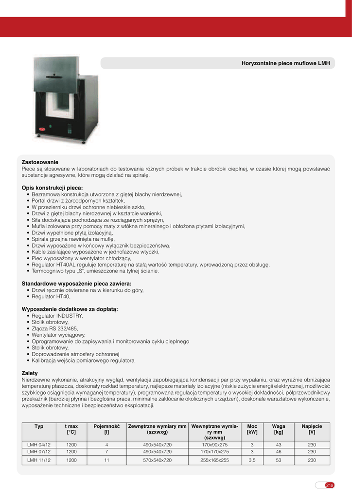 Horyzontalne piece muflowe LMH Zastosowanie Piece sà stosowane w laboratoriach do testowania ró˝nych próbek w trakcie obróbki cieplnej, w czasie której mogà powstawaç substancje agresywne, które mogà dzia∏aç na spiral´. Opis konstrukcji pieca: • Bezramowa konstrukcja utworzona z gi´tej blachy nierdzewnej, • Portal drzwi z ˝aroodpornych kszta∏tek, • W przezierniku drzwi ochronne niebieskie szk∏o, • Drzwi z gi´tej blachy nierdzewnej w kszta∏cie wanienki, • Si∏a dociskajàca pochodzàca ze rozciàganych spr´˝yn, • Mufla izolowana przy pomocy maty z w∏ókna mineralnego i ob∏o˝ona p∏ytami izolacyjnymi, • Drzwi wype∏nione p∏ytà izolacyjnà, • Spirala grzejna nawini´ta na mufl´, • Drzwi wyposa˝one w koƒcowy wy∏àcznik bezpieczeƒstwa, • Kable zasilajàce wyposa˝one w jednofazowe wtyczki, • Piec wyposa˝ony w wentylator ch∏odzàcy, • Regulator HT40AL reguluje temperatur´ na sta∏à wartoÊç temperatury, wprowadzonà przez obs∏ug´, • Termoogniwo typu „S", umieszczone na tylnej Êcianie. Standardowe wyposa˝enie pieca zawiera: • Drzwi r´cznie otwierane na w kierunku do góry, • Regulator HT40, Wyposa˝enie dodatkowe za dop∏atà: • Regulator INDUSTRY, • Stolik obrotowy, • Z∏àcza RS 232/485, • Wentylator wyciàgowy, • Oprogramowanie do zapisywania i monitorowania cyklu cieplnego • Stolik obrotowy, • Doprowadzenie atmosfery ochronnej • Kalibracja wejÊcia pomiarowego regulatora Zalety Nierdzewne wykonanie, atrakcyjny wyglàd, wentylacja zapobiegajàca kondensacji par przy wypalaniu, oraz wyraênie obni˝ajàca temperatur´ p∏aszcza, doskona∏y rozk∏ad temperatury, najlepsze materia∏y izolacyjne (niskie zu˝ycie energii elektrycznej, mo˝liwoÊç szybkiego osiàgni´cia wymaganej temperatury), programowana regulacja temperatury o wysokiej dok∏adnoÊci, pó∏przewodnikowy przekaênik (bardziej p∏ynna i bezg∏oÊna praca, minimalne zak∏ócanie okolicznych urzàdzeƒ), doskona∏e warsztatowe wykoƒczenie, wyposa˝enie techniczne i bezpieczeƒstwo eksploatacji. Typ t max [°C] PojemnoÊç [l] LMH 04/12 LMH 07/12 1200 1200 4 7 LMH 11/12 1200 11 Zewn´trzne wymiary mm Wewn´trzne wymia(szxwxg) ry mm (szxwxg) 490x540x720 170x90x275 490x540x720 170x170x275 570x540x720 255x165x255 Moc [kW] Waga [kg] Napi´cie [V] 3 3 43 46 230 230 3,5 53 230 219