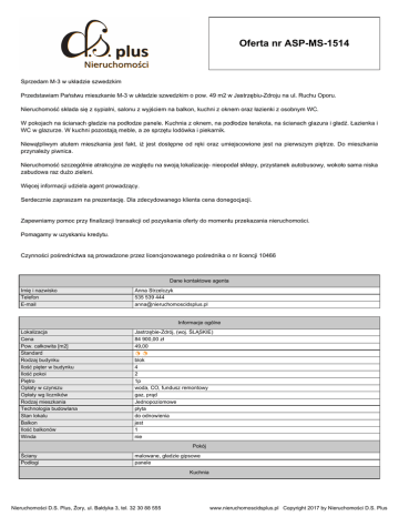 Oferta nr ASP-MS-1514 Sprzedam M-3 w układzie szwedzkim Przedstawiam Państwu mieszkanie M-3 w układzie szwedzkim o pow. 49 m2 w Jastrzębiu-Zdroju na ul. Ruchu Oporu. Nieruchomość składa się z sypialni, salonu z wyjściem na balkon, kuchni z oknem oraz łazienki z osobnym WC. W pokojach na ścianach gładzie na podłodze panele. Kuchnia z oknem, na podłodze terakota, na ścianach glazura i gładź. Łazienka i WC w glazurze. W kuchni pozostają meble, a ze sprzętu lodówka i piekarnik. Niewątpliwym atutem mieszkania jest fakt, iż jest dostępne od ręki oraz umiejscowione jest na pierwszym piętrze. Do mieszkania przynależy piwnica. Nieruchomość szczególnie atrakcyjna ze względu na swoją lokalizację- nieopodal sklepy, przystanek autobusowy, wokoło sama niska zabudowa raz dużo zieleni. Więcej informacji udziela agent prowadzący. Serdecznie zapraszam na prezentację. Dla zdecydowanego klienta cena donegocjacji. Zapewniamy pomoc przy finalizacji transakcji od pozyskania oferty do momentu przekazania nieruchomości. Pomagamy w uzyskaniu kredytu. Czynności pośrednictwa są prowadzone przez licencjonowanego pośrednika o nr licencji 10466 Dane kontaktowe agenta Imię i nazwisko Telefon E-mail Anna Strzelczyk 535 539 444 [email protected] Lokalizacja Cena Pow. całkowita [m2] Standard Rodzaj budynku Ilość pięter w budynku Ilość pokoi Piętro Opłaty w czynszu Opłaty wg liczników Rodzaj mieszkania Technologia budowlana Stan lokalu Balkon Ilość balkonów Winda Jastrzębie-Zdrój, (woj. ŚLĄSKIE) 84 900,00 zł 49,00 Informacje ogólne blok 4 2 1p woda, CO, fundusz remontowy gaz, prąd Jednopoziomowe płyta do odnowienia jest 1 nie Pokój Ściany Podłogi malowane, gładzie gipsowe panele Kuchnia Nieruchomości D.S. Plus, Żory, ul. Bałdyka 3, tel. 32 30 88 555 www.nieruchomoscidsplus.pl Copyright 2017 by Nieruchomości D.S. Plus Oferta nr ASP-MS-1514 Typ pomieszczenia Rodzaj kuchni Ściany Podłogi oddzielna z zabudową kuchenną malowane, gładzie gipsowe, glazura terakota Łazienka Typ pomieszczenia Ilość Ściany Podłogi osobno z wc 1 glazura terakota Wc Ilość Ściany Podłogi 1 glazura terakota Przedpokój Ściany Podłogi tapety terakota Nieruchomości D.S. Plus, Żory, ul. Bałdyka 3, tel. 32 30 88 555 www.nieruchomoscidsplus.pl Copyright 2017 by Nieruchomości D.S. Plus