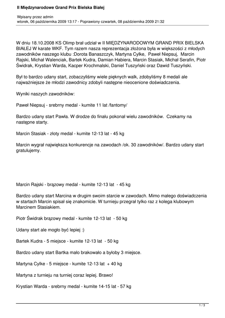 II Międzynarodowe Grand Prix Bielska Białej Wpisany przez admin wtorek, 06 października 2009 13:17 - Poprawiony czwartek, 08 października 2009 21:32 W dniu 18.10.2008 KS Olimp brał udział w II MIĘDZYNARODOWYM GRAND PRIX BIELSKA BIAŁEJ W karate WKF. Tym razem nasza reprezentacja złożona była w większości z młodych zawodników naszego klubu :Dorota Banaszczyk, Martyna Cylke, Paweł Niepsuj, Marcin Rajski, Michał Walenciak, Bartek Kudra, Damian Habiera, Marcin Stasiak, Michał Serafin, Piotr Świdrak, Krystian Warda, Kacper Krochmalski, Daniel Tuszyński oraz Dawid Tuszyński. Był to bardzo udany start, zobaczyliśmy wiele pięknych walk, zdobyliśmy 8 medali ale najważniejsze że młodzi zawodnicy zdobyli następne nieocenione doświadczenia. Wyniki naszych zawodników: Paweł Niepsuj - srebrny medal - kumite 11 lat /fantomy/ Bardzo udany start Pawła. W drodze do finału pokonał wielu zawodników. Czekamy na następne starty. Marcin Stasiak - złoty medal - kumite 12-13 lat - 45 kg Marcin wygrał największa konkurencje na zawodach /ok. 30 zawodników/. Bardzo udany start gratulujemy. Marcin Rajski - brązowy medal - kumite 12-13 lat - 45 kg Bardzo udany start Marcina w drugim swoim starcie w zawodach. Mimo małego doświadczenia w startach Marcin spisał się znakomicie. W turnieju przegrał tylko raz z kolega klubowym Marcinem Stasiakiem. Piotr Świdrak brązowy medal - kumite 12-13 lat - 50 kg Udany start ale mogło być lepiej :) Bartek Kudra - 5 miejsce - kumite 12-13 lat - 50 kg Bardzo udany start Bartka mało brakowało a byłoby 3 miejsce. Martyna Cylke - 5 miejsce - kumite 12-13 lat + 40 kg Martyna z turnieju na turniej coraz lepiej. Brawo! Krystian Warda - srebrny medal - kumite 14-15 lat - 57 kg 1/3 II Międzynarodowe Grand Prix Bielska Białej Wpisany przez admin wtorek, 06 października 2009 13:17 - Poprawiony czwartek, 08 października 2009 21:32 Krystian powoli wraca do formy po rocznej przerwie. Gratulujemy i życzymy wytrwałości w pracy. Kacper Krochmalski- brązowy medal - kumite 14-15 lat - 57 kg Dobry start Kacpra chodź niedosyt z pewnością jest. Dawid Tuszyński -srebrny medal - kumite +18 lat - 80 kg Następny medal Dawida choć bez większej historii. Kacper Krochmalski - brązowy medal w kumite drużynowym 14-15 lat jako /KADRA WOJEWÓDZKA/ 2/3 II Międzynarodowe Grand Prix Bielska Białej Wpisany przez admin wtorek, 06 października 2009 13:17 - Poprawiony czwartek, 08 października 2009 21:32 Gratulujemy naszym zawodnikom. Życzymy dalszych sukcesów. Wkrótce zdjęcia z turnieju oraz szczegółowe opisy konkurencji 3/3