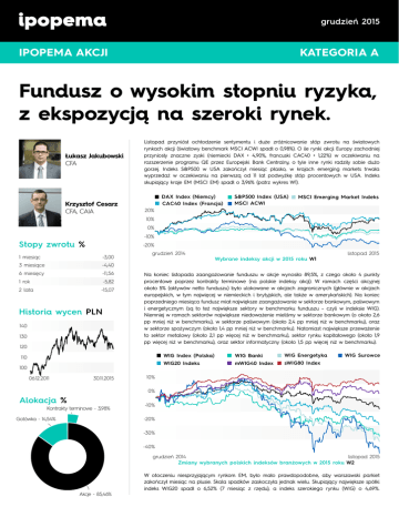 grudzień 2015 IPOPEMA AKCJI KATEGORIA A Fundusz o wysokim stopniu ryzyka, z ekspozycją na szeroki rynek. Łukasz Jakubowski CFA Krzysztof Cesarz CFA, CAIA Listopad przyniósł ochłodzenie sentymentu i duże zróżnicowanie stóp zwrotu na światowych rynkach akcji (światowy benchmark MSCI ACWI spadł o 0,98%). O ile rynki akcji Europy zachodniej przyniosły znaczne zyski (niemiecki DAX + 4,90%, francuski CAC40 + 1,22%) w oczekiwaniu na rozszerzenie programu QE przez Europejski Bank Centralny, o tyle inne rynki radziły sobie dużo gorzej. Indeks S&P500 w USA zakończył miesiąc płasko, w krajach emerging markets trwała wyprzedaż w oczekiwaniu na pierwszą od 11 lat podwyżkę stóp procentowych w USA. Indeks skupiający kraje EM (MSCI EM) spadł o 3,96% (patrz wykres W1). DAX Index (Niemcy) CAC40 Index (Francja) S&P500 Index (USA) MSCI ACWI MSCI Emerging Market Indeks 20% 10% 0% -10% Stopy zwrotu % -20% 1 miesiąc -3,00 3 miesiące -4,40 6 miesięcy -11,56 1 rok -5,82 2 lata -15,07 Historia wycen PLN 140 130 120 grudzień 2014 100 30.11.2015 listopad 2015 Na koniec listopada zaangażowanie funduszu w akcje wynosiło 89,5%, z czego około 4 punkty procentowe poprzez kontrakty terminowe (na polskie indeksy akcji). W ramach części akcyjnej około 5% (aktywów netto funduszu) było ulokowane w akcjach zagranicznych (głównie w akcjach europejskich, w tym najwięcej w niemieckich i brytyjskich, ale także w amerykańskich). Na koniec poprzedniego miesiąca fundusz miał największe zaangażowanie w sektorze bankowym, paliwowym i energetycznym (są to też największe sektory w benchmarku funduszu – czyli w indeksie WIG). Niemniej w ramach sektorów największe niedoważenie mieliśmy w sektorze bankowym (o około 2,6 pp mniej niż w benchmarku), w sektorze paliwowym (około 2,4 pp mniej niż w benchmarku), oraz w sektorze spożywczym (około 1,4 pp mniej niż w benchmarku). Natomiast największe przeważenie to sektor metalowy (około 2,1 pp więcej niż w benchmarku), sektor rynku kapitałowego (około 1,9 pp więcej niż w benchmarku), oraz sektor informatyczny (około 1,5 pp więcej niż w benchmarku). 110 06.12.2011 Wybrane indeksy akcji w 2015 roku W1 WIG Index (Polska) WIG Banki WIG Energetyka WIG20 Indeks mWIG40 Index sWIG80 Index WIG Surowce 10% 0% Alokacja % Kontrakty terminowe - 3,98% -10% -20% Gotówka - 14,54% -30% -40% grudzień 2014 listopad 2015 Zmiany wybranych polskich indeksów branżowych w 2015 roku W2 Akcje - 85,46% W otoczeniu niesprzyjającym rynkom EM, było mało prawdopodobne, aby warszawski parkiet zakończył miesiąc na plusie. Skala spadków zaskoczyła jednak wielu. Skupiający największe spółki indeks WIG20 spadł o 6,52% (7 miesiąc z rzędu), a indeks szerokiego rynku (WIG) o 4,69%. grudzień 2015 IPOPEMA AKCJI Katalizatorem spadków na lokalnym parkiecie były negatywne dla kursów spółek informacje z sektora bankowego, energetycznego i surowcowego. W sektorze bankowym, komentarze polityków wskazują na to, że podatek bankowy zostanie nałożony przy wykorzystaniu maksymalnej, wcześniej dyskutowanej stawki (0,39% aktywów). Ponadto, niewyjaśniona pozostaje kwestia przewalutowania kredytów walutowych po historycznym kursie franka. W sektorze energetycznym, niepewność inwestorów wzbudziły komentarze polityków dotyczące powtarzalności dywidend wypłacanych przez te spółki oraz przecieki prasowe nt. planów ich połączenia ze śląskimi kopalniami. Na polskie indeksy negatywny wpływ miał też KGHM, na którym zaważyły wciąż spadające ceny miedzi oraz malejąca szansa na to, że nowy rząd zrealizuje obietnicę obniżenia podatku od wydobycia miedzi. Lepiej od szerokiego rynku zachowywały się małe i średnie spółki, jednak i one nie uchroniły się przed spadkami (MWIG40 -0,73%, SWIG80 -1,72%) – patrz wykres W2. Waluty % EUR - 8,07% USD - 0,90% CZK - 0,14% PLN - 90,89% Sektory % Banki Nasze założenie o powolnym, ale stabilnym globalnym wzroście gospodarczym w tym i przyszłym roku pozostaje scenariuszem bazowym. Polskiej gospodarce pomagać będzie również ożywienie w strefie euro (patrz wykres W3 przedstawiający zmianę polskiego PKB, oraz wykres W4 przedstawiający wskaźniki wyprzedzające dla strefy euro). Ponadto, duża przecena, wciąż dobre wyniki spółek, a także korzystna sezonowość stóp zwrotu z rynku akcji w grudniu przemawiają za inwestowaniem w akcje. Z drugiej strony, ryzykiem dla inwestowania w polskie akcje są czynniki polityczne i ryzyko regulacyjne oraz spodziewana grudniowa podwyżka stóp procentowych w USA. PKB niewyrównany sezonowo (ceny stałe średnioroczne roku poprzedniego) 26,02 Przemysł paliwowy 11,36 Energetyka 8,54 Handel detaliczny 7,25 Informatyka 5,61 Przemysł metalowy 4,88 Przemysł surowcowy KATEGORIA A 3,29 Inne Usługi 3,10 Rynek kapitałowy 3,08 Media 3,01 Finanse – Inne 2,94 Przemysł motoryzacyjny 2,88 Przemysł elektromaszynowy 2,67 Hotele i Restauracje 2,26 Pozostałe 13,12 PKB wyrównany sezonowo (ceny stałe przy roku odniesienia 2010) 105,3 105 104,9 104,2 104,7 104 103,2 103 104,8 105,0 103,3 103,3 103,5 102,7 102,3 101,8 101,7 101 101,0 100,9 100100,4 2009 2010 2011 100,1 100,0 2012 100,5 2013 2014 2015 Zmiany polskiego PKB (dwie serie) W3 Recesje (NBER) Wskaźnik wyprzedzający EU (średnia z 4 wsk.) 1,587 1,5 Struktura geograficzna % 1,0 Polska 0,5 94,26 103,3 103,4 103,3 102 103,7 103,4 103,7 Niemcy 3,67 Holandia 0,88 USA 0,86 -0,5 Wielka Brytania 0,30 -1,0 Francja 0,03 1,168 0,254 0,0 0,449 -0,182 -1,5 -1,258 -2,0 -2,5 -3,0 2000 2002 2004 2006 2008 -2,835 2010 2012 2014 2016 Wskaźniki wyprzedzające dla strefy euro (średnia z 4 serii) W4 Niniejszy dokument służy wyłącznie celom informacyjnym, nie stanowi rekomendacji czy doradztwa inwestycyjnego i nie może stanowić podstawy do podjęcia decyzji inwestycyjnej. Wszelkie informacje dotyczące planów, oczekiwań, strategii, czy polityki inwestycyjnej co do przyszłości, stanowią odzwiercied