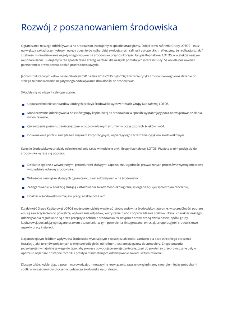 Rozwój z poszanowaniem środowiska Ograniczanie naszego oddziaływania na środowisko traktujemy w sposób strategiczny. Dzięki temu rafineria Grupy LOTOS – nasz największy zakład przemysłowy - należy obecnie do najbardziej ekologicznych rafinerii europejskich. Wierzymy, że realizacja działań z zakresu minimalizowania negatywnego wpływu na środowisko przynosi korzyści Grupie Kapitałowej LOTOS, a w efekcie naszym akcjonariuszom. Budujemy w ten sposób także szereg wartości dla naszych pozostałych interesariuszy. Są oni dla nas również partnerami w prowadzeniu działań prośrodowiskowych. Jednym z kluczowych celów naszej Strategii CSR na lata 2012–2015 było "Ograniczenie ryzyka środowiskowego oraz dążenie do stałego minimalizowania negatywnego oddziaływania działalności na środowisko". Składały się na niego 4 cele operacyjne: Upowszechnienie standardów i dobrych praktyk środowiskowych w ramach Grupy Kapitałowej LOTOS, Monitorowanie oddziaływania obiektów grupy kapitałowej na środowisko w sposób wykraczający poza obowiązkowe działania w tym zakresie, Ograniczenie poziomu zanieczyszczeń w odprowadzanym strumieniu oczyszczonych ścieków i wód, Doskonalenie portalu zarządzania ryzykiem korporacyjnym, wspierającego zarządzanie ryzykiem środowiskowym. Kwestie środowiskowe znalazły odzwierciedlenie także w Kodeksie etyki Grupy Kapitałowej LOTOS. Przyjęte w nim podejście do środowiska wyraża się poprzez: Działanie zgodne z wewnętrznymi procedurami służącymi zapewnieniu zgodności prowadzonych procesów z wymogami prawa w dziedzinie ochrony środowiska, Wdrażanie rozwiązań służących ograniczaniu skali oddziaływania na środowisko, Zaangażowanie w edukację służącą kształtowaniu świadomości ekologicznej w organizacji i jej społecznym otoczeniu, Dbałość o środowisko w miejscu pracy, a także poza nim. Działalność Grupy Kapitałowej LOTOS może potencjalnie wywierać istotny wpływ na środowisko naturalne, w szczególności poprzez emisję zanieczyszczeń do powietrza, wytwarzanie odpadów, korzystanie z wód i odprowadzanie ścieków. Skala i charakter naszego oddziaływania regulowane są przez przepisy o ochronie środowiska. W związku z prowadzoną działalnością, spółki grupy kapitałowej, posiadają wymagane prawem pozwolenia, w tym pozwolenia zintegrowane, określające operacyjne i środowiskowe aspekty pracy instalacji. Najistotniejszym źródłem wpływu na środowisko wynikającym z naszej działalności, zarówno dla bezpośredniego otoczenia instalacji, jak i terenów położonych w większej odległości od rafinerii, jest emisja gazów do atmosfery. Z tego powodu przywiązujemy największą wagę do tego, aby procesy powodujące emisję zanieczyszczeń do powietrza przeprowadzane były w oparciu o najlepsze dostępne techniki i praktyki minimalizujące oddziaływanie zakładu w tym zakresie. Dlatego także, wybierając, a potem wprowadzając innowacyjne rozwiązania, zawsze uwzględniamy synergię między potrzebami spółki a korzyściami dla otoczenia, zwłaszcza środowiska naturalnego. Łączne wydatki i inwestycje przeznaczone na ochronę środowiska (tys. zł) Koszty utylizacji odpadów, oczyszczania emisji oraz rekultywacji 33 523 Koszty i nakłady inwestycyjne w zakresie zapobiegania i zarządzania ochroną środowiska 84 839 Inwestycje proekologiczne 72 211 Przełomowym z punktu widzenia efektywności i konkurencyjności działalności Grupy Kapitałowej LOTOS, a zarazem ograniczającym nasz negatywny wpływ na środowisko jest realizowany przez nas Projekt EFRA. Wdrażając go, zdecydowaliśmy się na rozwiązania idące dalej, niż wymagania przepisów ochrony środowiska i wymagania BAT, tj.: * bardziej niż w typowych instalacjach obniżymy ciśnienie przed otwarciem reaktora DCU, aby maksymalnie odessać gazowe węglowodory, jeszcze przed procesem cięcia i opróżniania urządzenia z wytworzonego koksu; * procesy związane z wyładunkiem, przemieszczaniem, magazynowaniem, załadunkiem i wywozem koksu będą odbywały się w sposób ponadstandardowo bezpieczny dla środowiska. Projekt EFRA Dobre praktyki Najważniejsze projekty i inicjatywy służące ograniczeniu wpływu na środowisko: W 2015 roku Grupa LOTOS została Partnerem Głównym Programu Bałtyk, realizowanego przez UN Global Compact w Polsce. Program Bałtyk ma na celu wypracowanie optymalnych kierunków zrównoważonego rozwoju regionu Morza Bałtyckiego poprzez wsparcie rozbudowy morskich korytarzy transportowych oraz żeglugi regionu, ze szczególnym uwzględnieniem poprawy bezpieczeństwa i infrastruktury transportowej, zwiększenia konkurencyjności regionu Morza Bałtyckiego, a także ochrony jego ekosystemu. Ochrona ekologiczna Morza Bałtyckiego, w tym zapobieganie procesowi eutrofizacji, zostało uznana za jeden z kluczowych priorytetów Programu Bałtyk. Realizując w latach 2012–2015 cel "Ograniczenie ryzyka środowiskowego oraz dążenie do stałego minimalizowania negatywnego oddziaływania działalności na środowisko" dokonaliśmy m.in. wielkoobszarowej inwentaryzacji przyrodniczej wokół rafinerii w Gdańsku oraz aktualizowaliśmy dokumentację środowiskową dla wszystkich stacji paliw w Polsce. Zorganizowaliśmy także spotkania specjalistów środowiskowych, na których dyskutowano o istotnych działaniach chroniących nasze otoczenie, dobrych praktykach środowiskowych. Wyposażając spółkę LOTOS Kolej w nowoczesny tabor kolejowy, wyeliminowaliśmy wycieki olejów smarowych. W 2015 roku na terenie LOTOS Kolej w Gdańsku wyeliminowaliśmy proces odgazowania cystern LPG. Proces został przeniesiony na instalację Grupy LOTOS, gdzie odbywa się odzysk gazów poprzez skierowanie ich do systemu gazu opałowego. Spółka LOTOS Asfalt obniżyła koszty produkcji poprzez wprowadzenie efektywnego zarządzania energią oraz optymalizację surowcową. Jednocześnie produkty oferowane przez nią są 
