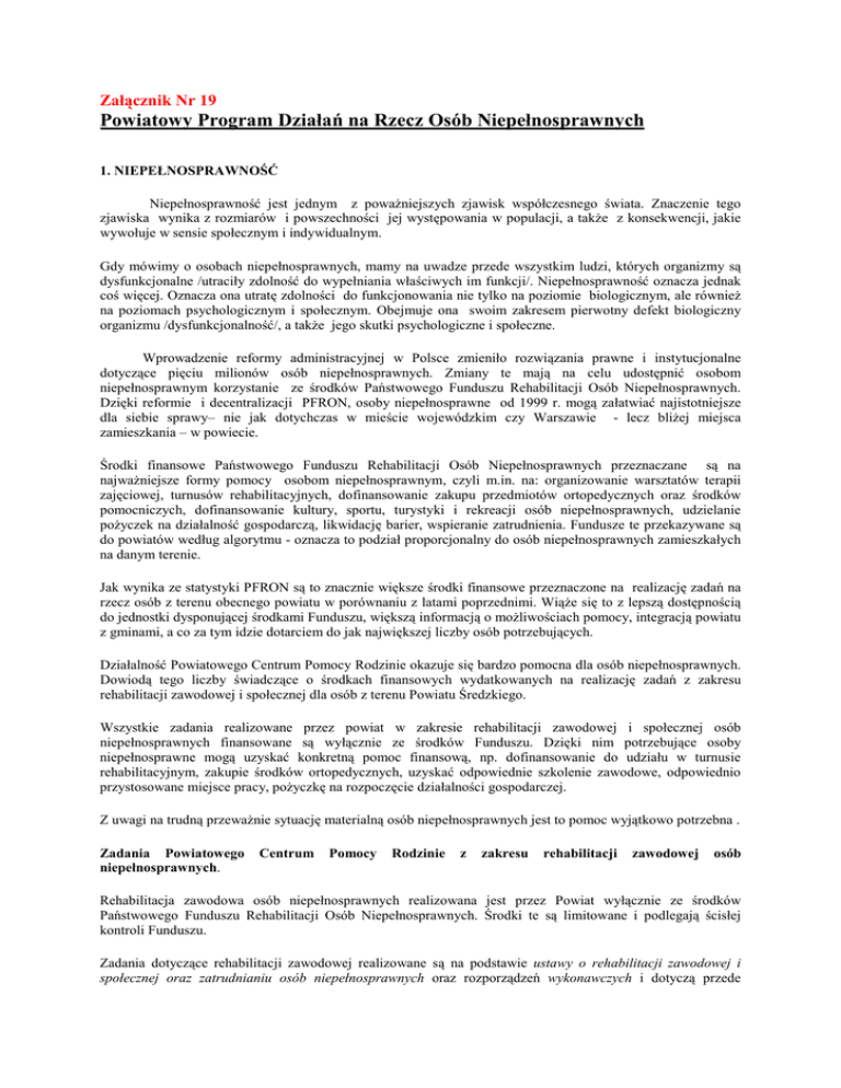 Załącznik Nr 19 Powiatowy Program Działań na Rzecz Osób Niepełnosprawnych 1. NIEPEŁNOSPRAWNOŚĆ Niepełnosprawność jest jednym z powaŜniejszych zjawisk współczesnego świata. Znaczenie tego zjawiska wynika z rozmiarów i powszechności jej występowania w populacji, a takŜe z konsekwencji, jakie wywołuje w sensie społecznym i indywidualnym. Gdy mówimy o osobach niepełnosprawnych, mamy na uwadze przede wszystkim ludzi, których organizmy są dysfunkcjonalne /utraciły zdolność do wypełniania właściwych im funkcji/. Niepełnosprawność oznacza jednak coś więcej. Oznacza ona utratę zdolności do funkcjonowania nie tylko na poziomie biologicznym, ale równieŜ na poziomach psychologicznym i społecznym. Obejmuje ona swoim zakresem pierwotny defekt biologiczny organizmu /dysfunkcjonalność/, a takŜe jego skutki psychologiczne i społeczne. Wprowadzenie reformy administracyjnej w Polsce zmieniło rozwiązania prawne i instytucjonalne dotyczące pięciu milionów osób niepełnosprawnych. Zmiany te mają na celu udostępnić osobom niepełnosprawnym korzystanie ze środków Państwowego Funduszu Rehabilitacji Osób Niepełnosprawnych. Dzięki reformie i decentralizacji PFRON, osoby niepełnosprawne od 1999 r. mogą załatwiać najistotniejsze dla siebie sprawy– nie jak dotychczas w mieście wojewódzkim czy Warszawie - lecz bliŜej miejsca zamieszkania – w powiecie. Środki finansowe Państwowego Funduszu Rehabilitacji Osób Niepełnosprawnych przeznaczane są na najwaŜniejsze formy pomocy osobom niepełnosprawnym, czyli m.in. na: organizowanie warsztatów terapii zajęciowej, turnusów rehabilitacyjnych, dofinansowanie zakupu przedmiotów ortopedycznych oraz środków pomocniczych, dofinansowanie kultury, sportu, turystyki i rekreacji osób niepełnosprawnych, udzielanie poŜyczek na działalność gospodarczą, likwidację barier, wspieranie zatrudnienia. Fundusze te przekazywane są do powiatów według algorytmu - oznacza to podział proporcjonalny do osób niepełnosprawnych zamieszkałych na danym terenie. Jak wynika ze statystyki PFRON są to znacznie większe środki finansowe przeznaczone na realizację zadań na rzecz osób z terenu obecnego powiatu w porównaniu z latami poprzednimi. WiąŜe się to z lepszą dostępnością do jednostki dysponującej środkami Funduszu, większą informacją o moŜliwościach pomocy, integracją powiatu z gminami, a co za tym idzie dotarciem do jak największej liczby osób potrzebujących. Działalność Powiatowego Centrum Pomocy Rodzinie okazuje się bardzo pomocna dla osób niepełnosprawnych. Dowiodą tego liczby świadczące o środkach finansowych wydatkowanych na realizację zadań z zakresu rehabilitacji zawodowej i społecznej dla osób z terenu Powiatu Średzkiego. Wszystkie zadania realizowane przez powiat w zakresie rehabilitacji zawodowej i społecznej osób niepełnosprawnych finansowane są wyłącznie ze środków Funduszu. Dzięki nim potrzebujące osoby niepełnosprawne mogą uzyskać konkretną pomoc finansową, np. dofinansowanie do udziału w turnusie rehabilitacyjnym, zakupie środków ortopedycznych, uzyskać odpowiednie szkolenie zawodowe, odpowiednio przystosowane miejsce pracy, poŜyczkę na rozpoczęcie działalności gospodarczej. Z uwagi na trudną przewaŜnie sytuację materialną osób niepełnosprawnych jest to pomoc wyjątkowo potrzebna . Zadania Powiatowego niepełnosprawnych. Centrum Pomocy Rodzinie z zakresu rehabilitacji zawodowej osób Rehabilitacja zawodowa osób niepełnosprawnych realizowana jest przez Powiat wyłącznie ze środków Państwowego Funduszu Rehabilitacji Osób Niepełnosprawnych. Środki te są limitowane i podlegają ścisłej kontroli Funduszu. Zadania dotyczące rehabilitacji zawodowej realizowane są na podstawie ustawy o rehabilitacji zawodowej i społecznej oraz zatrudnianiu osób niepełnosprawnych oraz rozporządzeń wykonawczych i dotyczą przede wszystkim: dostosowania istniejących lub nowych miejsc pracy dla osób niepełnosprawnych / stosownie do potrzeb wynikających z niepełnosprawności tych osób rozpoznanych przez słuŜby medycyny pracy/, refundacji wynagrodzeń dla osób zatrudnionych na stanowiskach pracy utworzonych w latach poprzednich, udzielanie poŜyczek na rozpoczęcie działalności gospodarczej lub rolniczej, dofinansowanie oprocentowania kredytów bankowych zaciągniętych na prowadzenie działalności gospodarczej lub rolniczej, szkolenie zawodowe osób niepełnosprawnych. Zadania Powiatowego Centrum Pomocy Rodzinie z zakresu rehabilitacji społecznej. Do podstawowych zadań realizowanych przez powiat z zakresu rehabilitacji społecznej naleŜy stwarzanie moŜliwości osobom niepełnosprawnym udziału w turnusach rehabilitacyjnych, dofinansowanie zaopatrzenia w sprzęt rehabilitacyjny, przedmioty ortopedyczne i środki pomocnicze, pomoc w likwidacji barier architektonicznych i w komunikowaniu się, dofinansowanie sportu, kultury, rekreacji i turystyki osób niepełnosprawnych. Zadania z zakresu rehabilitacji zawodowej i społecznej realizowane ze środków Państwowego Funduszu Rehabilitacji Osób Niepełnosprawnych. Ilość osób objętych dofinansowaniem Nazwa zadania 2001 r. 2002 r. 3 5 17 19 Szkolenia i przekwalifikowania osób niepełnosprawnych 4 8 PoŜyczki na rozpoczęcie działalności gospodarczej lub rolniczej brak wniosków brak wniosków brak wniosków brak wniosków 267 125 109 67 Rehabilitacja zawodowa : Tworzenie nowych stanowisk pracy Refundacja wynagrodzeń i składek na ubezpieczenie społeczne /w tym dla osób zatrudnionych na podstawie umów z lat poprzednich/ Dofinansowanie do oprocentowania kredytu bankowego Rehabilitacja społeczna: Turnusy rehabilitacyjne w tym: dzieci i młodzieŜ niepełnosprawna / łącznie z opiekunami/ Dofinansowanie likwidacji barier : architektonicznych w komunikowaniu się 4 23 brak moŜliwości prawnych - Dofinansowanie zakupu przedmiotów ortopedycznych i środków pomocniczych
