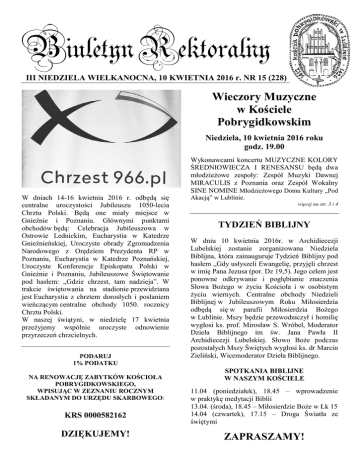 Biuletyn Rektoralny III NIEDZIELA WIELKANOCNA, 10 KWIETNIA 2016 r. NR 15 (228) Wieczory Muzyczne w Kościele Pobrygidkowskim Niedziela, 10 kwietnia 2016 roku godz. 19.00 W dniach 14-16 kwietnia 2016 r. odbędą się centralne uroczystości Jubileuszu 1050-lecia Chrztu Polski. Będą one miały miejsce w Gnieźnie i Poznaniu. Głównymi punktami obchodów będą: Celebracja Jubileuszowa w Ostrowie Lednickim, Eucharystia w Katedrze Gnieźnieńskiej, Uroczyste obrady Zgromadzenia Narodowego z Orędziem Prezydenta RP w Poznaniu, Eucharystia w Katedrze Poznańskiej, Uroczyste Konferencje Episkopatu Polski w Gnieźnie i Poznaniu, Jubileuszowe Świętowanie pod hasłem: „Gdzie chrzest, tam nadzieja”. W trakcie świętowania na stadionie przewidziana jest Eucharystia z chrztem dorosłych i posłaniem wieńczącym centralne obchody 1050. rocznicy Chrztu Polski. W naszej świątyni, w niedzielę 17 kwietnia przeżyjemy wspólnie uroczyste odnowienie przyrzeczeń chrzcielnych. PODARUJ 1% PODATKU NA RENOWACJĘ ZABYTKÓW KOŚCIOŁA POBRYGIDKOWSKIEGO, WPISUJĄC W ZEZNANIU ROCZNYM SKŁADANYM DO URZĘDU SKARBOWEGO: KRS 0000582162 DZIĘKUJEMY! Wykonawcami koncertu MUZYCZNE KOLORY ŚREDNIOWIECZA I RENESANSU będą dwa młodzieżowe zespoły: Zespół Muzyki Dawnej MIRACULIS z Poznania oraz Zespół Wokalny SINE NOMINE Młodzieżowego Domu Kultury „Pod Akacją” w Lublinie. więcej na str. 3 i 4 TYDZIEŃ BIBLIJNY W dniu 10 kwietnia 2016r. w Archidiecezji Lubelskiej zostanie zorganizowana Niedziela Biblijna, która zainauguruje Tydzień Biblijny pod hasłem „Gdy usłyszeli Ewangelię, przyjęli chrzest w imię Pana Jezusa (por. Dz 19,5). Jego celem jest ponowne odkrywanie i pogłębianie znaczenia Słowa Bożego w życiu Kościoła i w osobistym życiu wiernych. Centralne obchody Niedzieli Biblijnej w Jubileuszowym Roku Miłosierdzia odbędą się w parafii Miłosierdzia Bożego w Lublinie. Mszy będzie przewodniczył i homilię wygłosi ks. prof. Mirosław S. Wróbel, Moderator Dzieła Biblijnego im św. Jana Pawła II Archidiecezji Lubelskiej. Słowo Boże podczas pozostałych Mszy Świętych wygłosi ks. dr Marcin Zieliński, Wicemoderator Dzieła Biblijnego. SPOTKANIA BIBLIJNE W NASZYM KOŚCIELE 11.04 (poniedziałek), 18.45 – wprowadzenie w praktykę medytacji Biblii 13.04. (środa), 18.45 – Miłosierdzie Boże w Łk 15 14.04 (czwartek), 17.15 – Droga Światła ze świętymi ZAPRASZAMY! INTENCJE MSZALNE Poniedziałek, 11.04. 7.00 +Stefan Kondracki - gregorianka 11 7.30 +Leszek - gregorianka 21 7.30 Do Matki Bożej i Jezusa Miłosiernego o przywrócenia wiary i sakrament małżeństwa dla Piotra – nowenna 8 11.00 +Stanisława (28 r.), Ludwik, Anna, Bartłomiej, Natalia, Piotr 18.00 +Władysław Kowalski - gregorianka 7 18.00 +Maria (9 r.) Wtorek, 12.04. 7.00 +Stefan Kondracki - gregorianka 12 7.00 Nowenna 9 7.30 +Leszek - gregorianka 22 7.30 +Władysław Kowalski - gregorianka 8 11.00 +Aniela, Franciszek, Jacek, Alicja, zmarli Olendrów 18.00 +Jerzy 18.00 +Krystyna Madejewska-Roman Środa, 13.04., Św. Marcina, papieża i męczennika 7.00 +Stefan Kondracki - gregorianka 13 7.00 W intencji ofiarodawców 7.30 +Leszek - gregorianka 23 11.00 +Krzysztof, Andrzej, Jerzy 18.00 +Władysław Kowalski - gregorianka 9 18.00 +Czesława Żydek Czwartek, 14.04 7.00 +Stefan Kondracki - gregorianka 14 7.00 O dary Ducha św. i łaskę wytrwania na drodze powołania zakonnego dla Tomasza - nowenna 1 7.30 +Leszek - gregorianka 24 8.00 Msza św. wotywna ku czci Św. Judy Tadeusza 11.00 +Zygmunt Kopyciński (8 r.), zmarli z rodziny Witkowskich, Wacława, Piotr, Rafał, Marian, Hieronim 18.00 +Władysław Kowalski - gregorianka 10 18.00 +Janusz (1 r.), Jan, Stanisława Piątek, 15.04 7.00 +Stefan Kondracki - gregorianka 15 7.00 Nowenna 2 7.30 +Leszek - gregorianka 25 11.00 Msza św. wotywna ku czci Św. Brygidy 18.00 +Władysław Kowalski - gregorianka 11 Sobota, 16.04 7.00 +Stefan Kondracki - gregorianka 16 7.00 Nowenna 3 7.30 +Leszek - gregorianka 26 7.30 +Elżbieta Dziubińska 11.00 +Jerzy Głąb 6 miesiąc po śmierci i zmarli z rodziny 11.00 +Helena, Stanisław, Jan, Marianna, Janina, Jan, Edmund, Beniamina, Barbara, ks. bp Władysław 18.00 +Władysław Kowalski - gregorianka 12 IV NIEDZIELA WIELKANOCY, 17.04 7.00 Nowenna 4 7.00 +Marian, Bronisława, Jerzy, zmarli z rodziny 8.00 +Stefan Kondracki - gregorianka 17 9.30 +Eugeniusz (9 r.), 9.30 +Janina Kucała (3 r.) 11.00 +Janina Jamroży (8 r.) 11.00 O błogosławieństwo Boże, potrzebne łaski, dary Ducha Świętego, zdrowie, opiekę Marki Bożej dla Anastazji z okazji 85 urodzin 11.00 +Alfred, Elżbieta Pieczykolan, Irena, Stefan, zmarli z rodziny Stępkowskich 11.00 O błogosławieństwo Boże, potrzebne łaski, dary Ducha Świętego, zdrowie, opiekę Marki Bożej dla Stasia i Jasia i ich rodziców 12.00Wintencji pomordowanych w 76 rocznicę Zbrodni Katyńskiej 12.00 +Krzysztof Kwiatkowski (9 r.) 13.15 +Władysław Kowalski - gregorianka 13 13.15 +Bolesław, Helena, Zdzisław 16.00 +Leszek - gregorianka 27 16.00 +Wanda Makuła (1 r.) 18.00 +Harcmistrzyni Danuta Magierska (32 r.) SŁOWO NA NIEDZIELĘ „Żaden z uczniów nie odważył się zadać mu pytania; Kto Ty jesteś?, bo wiedzieli, że to jest Pan” Poznanie daje szansę! Poznanie, że Pan zmartwychwstał wyrywa uczniów zza zamkniętych z obawy przed Żydami drzwi, gdzie spędzali czas po śmierci Jezusa. Poznanie, że to jest Pan, zatrzymuje zrezygnowanych uczniów wracających do swoich codziennych, wykonywanych wcześniej zajęć – połowu ryb, jak słyszymy w dzisiejszej ewangelii. Poznanie w obliczu Chrystusa daje szansę na nową jakość życia: puste sieci – symbol przygnębienia, braku osiągnięć w trudnej rzeczywistości w obliczu Chrystusa stają się pełne mnóstwa ryb. Dzisiejsza liturgia raz jeszcze daje szansę także nam głębszego poznania, że Pan zmartwychwstał! Niezwykle interesującą postacią w tym procesie poznania jest Piotr. “Idę łowić ryby” – słys