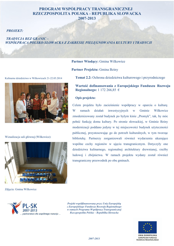 PROGRAM WSPÓŁPRACY TRANSGRANICZNEJ RZECZPOSPOLITA POLSKA - REPUBLIKA SŁOWACKA 2007-2013 PROJEKT: TRADYCJA BEZ GRANIC – WSPÓŁPRACA POLSKO-SŁOWACKA Z ZAKRESIE PIELĘGNOWANIA KULTURY I TRADYCJI Partner Wiodący: Gmina Wilkowice Partner Projektu: Gmina Bziny Kulinarne dziedzictwo w Wilkowicach 21-22.05.2014 Temat 2.2: Ochrona dziedzictwa kulturowego i przyrodniczego Wartość dofinansowania z Europejskiego Funduszu Rozwoju Regionalnego: 1 172 266,85 € Opis projektu: Celem projektu było zacieśnienie współpracy w oparciu o kulturę. W ramach działań inwestycyjnych w Gminie Wilkowice zmodernizowany został budynek po byłym kinie „Promyk”, tak, by móc pełnić funkcję domu kultury. Po stronie słowackiej, w Gminie Bziny modernizacji poddano jedyny w tej miejscowości budynek użyteczności publicznej, przystosowując go do potrzeb kulturalnych, w tym tworząc Wizualizacja sali głównej (Wilkowice): bibliotekę. Partnerzy zorganizowali również wydarzenia ukazujące wspólne cechy regionów w ujęciu transgranicznym. Dotyczyły one dziedzictwa kulinarnego, regionalnej architektury drewnianej, rzeźby ludowej i zbójnictwa. W ramach projektu wydany został również transgraniczny przewodnik po obu gminach. Zdjęcia: Gmina Wilkowice Projekt współfinansowany przez Unię Europejską z Europejskiego Funduszu Rozwoju Regionalnego w ramach Programu Współpracy Transgranicznej Rzeczpospolita Polska – Republika Słowacka 2007-2013 PROGRAM CEZHRANIČNEJ SPOLUPRÁCE POL’SKO – SLOVENSKÁ REPUBLIKA 2007-2013 PROJEKT: TRADÍCIE BEZ HRANÍC – POĽSKO-SLOVENSKÁ SPOLUPRÁCA V ROZSAHU PESTOVANIA KULTÚRY A TRADÍCI Vedúci partner: Obec Wilkowice Projektový partneri: Bziny Kulinárske dedičstvo v Wilkowicach 21-22.05.2014 Oblast` podpory 2.2: Ochrana kultúrneho a prírodného dedičstva Hodnota dofinacovania z Európskeho fondu regionálneho rozvoja: 1 172 266,85 € Popis projektu: Cieľom projektu bolo posilnenie spolupráce na základe kultúry. V rámci investičných činností v obci Wilkowice sa zmodernizovala budova bývalého kina „Lúč“ tak, aby mohla plniť funkciu domu kultúry. Na slovenskej strane bola v obci Bziny zmodernizovaná jediná verejnoprospešná budova v tejto obci, a prispôsobená Vizualizácia hlavnej sály (Wilkowice): kultúrnym potrebám vrátane vybudovania knižnice. Partneri zorganizovali tiež podujatia prezentujúce spoločné prvky regiónov v cezhraničnom poňatí. Týkali sa kulinárskeho dedičstva, regionálnej drevenej architektúry, ľudového rezbárstva a zbojníctva. V rámci projektu bol tiež vydaný cezhraničný sprievodca po obidvoch obciach. Fotografie: Obec Wilkowice Projekt spolufinancovaný Európskou úniou z Európskeho fondu regionálneho rozvoja v rámci Programu cezhraničnej spolupráce Poľsko – Slovenská republika 2007-2013