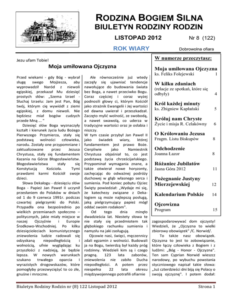 RODZINA BOGIEM SILNA BIULETYN RODZINY RODZIN LISTOPAD 2012 ROK WIARY Dobrowolna ofiara W numerze przeczytasz: Jezu ufam Tobie! Moja umiłowana Ojczyzna Przed wiekami - gdy Bóg - wybrał sługę swego Mojżesza, aby wyprowadził Naród z niewoli egipskiej, przekazał Mu dziesięć prostych słów: „Szema Izrael Słuchaj Izraelu: Jam jest Pan, Bóg twój, którym cię wywiódł z ziemi egipskiej, z domu niewoli. Nie będziesz miał bogów cudzych przede Mną ... " Dziesięć słów Boga wyznaczyły kształt i kierunek życia ludu Bożego Pierwszego Przymierza, stały się podstawą wolności człowieka, narodu. Zostały one przypomniane i zaktualizowane przez Jezusa Chrystusa, stały się fundamentem Kazania na Górze Błogosławieństw. Błogosławieństwa stały się Konstytucją Kościoła. Tymi prawdami karmi Kościół swoje dzieci. Słowa Dekalogu - dziesięciu słów Boga - Papież Jan Paweł II uczynił przesłaniem do Polaków w dniach od 1 do 9 czerwca 1991r. podczas czwartej pielgrzymki do Polski. Przypadła ona bezpośrednio po wielkich przemianach społeczno – politycznych, jakie miały miejsce w naszej Ojczyźnie i Europie Środkowo-Wschodniej. Po kilku dziesięcioleciach komunistycznego zniewolenia ludzie radowali się odzyskaną niepodległością i wolnością, ufnie wyglądając ku przyszłości z nadzieją, że będzie lepsza. W nowych warunkach szukano trwałego oparcia I wyrazistych drogowskazów, które pomogłyby przezwyciężyć to co złe, gnuśne i mroczne. Nr 8 (122) Ale równocześnie już wtedy zaczęły się ujawniać tendencje nawołujące do budowania świata bez Boga, a nawet przeciwko Bogu. Coraz częściej i coraz wyżej podnosili głowy ci, którym Kościół jako strażnik Ewangelii i Jej wartości od dawna uwierał i przeszkadzał. Zaczęto mylić wolność, ze swobodą, a nawet swawolą, co uderza w tradycyjne wartości oraz je osłabia i niszczy. W tym czasie przybył Jan Paweł II jako świadek wiary, której fundamentem jest prawo Boże. Cierpliwie jako Namiestnik Chrystusa objaśniał to, co jest podstawą życia chrześcijańskiego. Przypominał wymagania znane, a także otwierał nowe horyzonty, zachęcając do odważnej podróży duchowej w głąb własnego serca i sumienia. Pod koniec pobytu Ojciec Święty powiedział: „Wydaje mi się, że katechezy związane z Dekalogiem są może najlepszą posługą, jaką pielgrzymujący papież mógł oddać swoim rodakom". Od tego dnia minęło dwadzieścia lat. Niestety słowa te nie stały się przedmiotem tak głębokiego rachunku sumienia i namysłu na jaki zasługują. Ojcowie nasi, święci, męczennicy zdali egzamin z wolności. Budowali ja na Bogu, twierdzą był każdy próg rodzinny. Wiedzieli kim są i czego pragną. 123 lata zaborów, zniewolenia nie zabiło Ducha niepodległości. A potem przez niespełna 22 lata okresu międzywojennego potrafili ofiarnie Biuletyn Rodziny Rodzin nr (8) 122 Listopad 2012 Moja umiłowana Ojczyzna ks. Feliks Folejewski 1 W kilku zdaniach (relacje ze spotkań, które się odbyły) 4 Król każdej minuty ks. Zbigniew Kapłański 5 Króluj nam Chryste Życie i misja R. Celakówny 6 O Królowaniu Jezusa Fragm. Listu Biskupów 8 Odchodzenie Joanna Łazor 8 Różaniec Jubilatów Jasna Góra 2012 11 Pożegnanie Justyny Mierzejewskiej 12 Kalendarium Polskie 14 Ojcowizna Program 15 zagospodarowywać dom ojczysty! Wiedzieli, że „Ojczyzna to wielki zbiorowy obowiązek" /C. Norwid/. To także nasz obowiązek. Ojczyzna to jest to zobowiązanie, które łączy człowieka z Bogiem i z ludźmi: „Bóg - Honor - Ojczyzna". Ten sam Cyprian Norwid wieszcz narodowy, po wybuchu powstania styczniowego napisał takie słowa: „Już czterdzieści dni biją się Polacy o swoją ojczyznę". I potem dodał: Strona 1 „Kłamstwa długo tłumione zawsze strumieniami krwi wypływają". Wielkimi ofiarami okupiliśmy naszą niepodległość. Dzisiaj nie chcemy przelewać krwi cudzej i własnej. Ale chcemy żyć w Prawdzie. Kłamstwo jest to główne niebezpieczeństwo Ojczyzny. Pamiętamy dobrze historię różnych kłamstw w naszej Ojczyźnie. Jan Paweł II w Gdańsku podczas pielgrzymki, powiedział do ludzi, którzy oklaskami przerywali mu kazanie „Pozwólcie mi mówić, bo mówię nie tylko do was, ale i za was". Patriotyzm wyraża się między innymi w tym, że człowiek jest sobą, wie kim jest, skąd jego ród, jakie są jego korzenie, kultura, kim dla człowieka wierzącego jest Bóg, Kościół. Żeby człowiek nie musiał kłamać! Bo każdy z nas potrzebuje przecież umocnienia w tym, co jest najważniejszą sprawą człowieka, umocnienia w prawdzie i miłości. Dla człowieka wierzącego Prawda i Miłość ma twarz Chrystusa. Człowiek, który uwierzył tej Miłości wie, że wyraża się ona w Krzyżu! Dlatego nie godzi się na propozycje pustej ściany, ale chce uczyć się tej miłości patrząc na Krzyż, który przez wieki towarzyszył Polakom. Nie chcemy być niewolnikami innych ludzi i niewolnikami rozmaitych lęków. Pan Jezus wiele czasu poświęcił na to, ażeby apostołów wyzwolić od lęku. Przypominał, że człowiek najpierw powinien szukać Królestwa Bożego. Żeby na świecie byli ludźmi prawdziwie wolnymi. Są bowiem stworzeni na obraz i podobieństwo Boże, a nie zaprogramowani przez kolorową reklamę i kształtowani przez „papierowe autorytety" lub „wilków, którzy przychodzą w owczej skórze". Do wolności wezwał nas Bóg. Mamy słuchać jedynie Boga. Ale Boga mamy słuchać nie z przymusu, lecz w wolności, z dobrej woli. Pan Bóg do niczego nas nie przymusza. On, który daje człowiekowi rady, daje przykazania, wymaga od człowieka wolnego posłuchu. Pyta: „jeśli chcesz ... ?" Gdy odpowiem „tak" to trzeba wiedzieć czego ja naprawdę chcę i kto jest moim Panem. Człowiek ulegający nałogom strachu, lekom, nie jest do końca wolnym. Sługa Boży Stefan Kardynał Wyszyński mówił: „Gdy Bóg jest uwielbiony, człowiek jest 