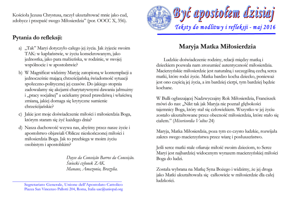 Kościoła Jezusa Chrystusa, raczył ukształtować mnie jako cud, zdobycz i przepaść swego Miłosierdzia” (por. OOCC X, 356). Pytania do refleksji: a) „Tak” Maryi dotyczyło całego jej życia. Jak żyjecie swoim TAK: w kapłaństwie, w życiu konsekrowanym, jako jednostka, jako para małżeńska, w rodzinie, w swojej wspólnocie i w apostolstwie? b) W Magnificat widzimy Maryję zatopioną w kontemplacji a jednocześnie mającą chrześcijańską świadomość sytuacji społeczno-politycznej jej czasów. Do jakiego stopnia zadowalamy się akcjami charytatywnymi dawania jałmużny i „pracy socjalnej" a uciekamy przed prawdziwą i właściwą zmianą, jakiej domaga się krytyczne sumienie chrześcijańskie? c) Jakie jest moje doświadczenie miłości i miłosierdzia Boga, którym staram się żyć każdego dnia? d) Nasza duchowość wzywa nas, abyśmy przez nasze życie i apostolstwo objawiali Oblicze nieskończonej miłości i miłosierdzia Boga. Jak to przebiega w moim życiu osobistym i apostolskim? Dayse da Conceição Barros da Conceição. Świecki członek ZAK. Manaus, Amazonia, Brazylia. ________________________________________________ Segretariato Generale, Unione dell’Apostolato Cattolico Piazza San Vincenzo Pallotti 204, Roma, Italia [email protected] Maryja Matka Miłosierdzia Ludzkie doświadczenie rodziny, relacji między matką i dzieckiem pozwala nam zrozumieć autentyczność miłosierdzia. Macierzyńskie miłosierdzie jest naturalną i szczególną cechą serca matki, które rodzi życie. Matka bardzo kocha dziecko, ponieważ jest ono częścią jej życia, a im bardziej cierpi, tym bardziej będzie kochane. W Bulli ogłaszającej Nadzwyczajny Rok Miłosierdzia, Franciszek mówi do nas: ,,Nikt tak jak Maryja nie poznał głębokości tajemnicy Boga, który stał się człowiekiem. Wszystko w jej życiu zostało ukształtowane przez obecność miłosierdzia, które stało się ciałem.” (Misericordia Vultus 24) Maryja, Matka Miłosierdzia, poza tym co czysto ludzkie, rozwijała zakres swego macierzyństwa przez wiarę i posłuszeństwo. Jeśli serce matki stale ofiaruje miłość swoim dzieciom, to Serce Maryi jest najbardziej widocznym wyrazem macierzyńskiej miłości Boga do ludzi. Została wybrana na Matkę Syna Bożego i widzimy, że jej droga jako Matki ukształtowała się całkowicie w miłosierdzie dla całej ludzkości. Maryja, kobieta uważnego słuchania Boga i wydarzeń jej czasów. Nie jest proste „słuchanie”, słuchanie pobieżne, ale „słuchanie z uwagą, akceptacją i gotowością”. Papież Franciszek mówi nam, że Maryja poświadcza, iż miłosierdzie Syna Bożego nie zna granic i rozciąga się na wszystkich bez wyjątku. Przy zwiastowaniu ona słucha anioła Gabriela i wraz z jej ,,Niech mi się stanie” (fiat), zgadza się zostać matką Zbawiciela. Jest to „tak” płynące z wiary i oddania się Bogu. Matka Miłosierdzia przebacza wszystkie okropności, jakie wycierpiał jej Syn. Maryja, kobieta decyzji. Słysząc, że Elżbieta, jej starsza kuzynka jest w ciąży, wyrusza w pośpiechu, aby jej służyć. W spotkaniu z Elżbietą Magnificat ogłoszone przez Maryję uprzedziło w pewien sposób wylanie Ducha Świętego na wspólnotę jerozolimską. Proroctwo i miłosierdzie, życie i dzieła Maryi głoszone w tej pieśni ujawniają, że czynnie praktykowała ona miłosierny wymiar swej kobiecości ogłaszając miłosierdzie wszechmogącego Boga, a jednocześnie wymiar społeczny, wzywając do sprawiedliwości wobec dzieci Bożych, które są pokrzywdzone lub są ofiarami niesprawiedliwości. Maryja, dusza mistyczna, lecz także prorokini oddania się sprawie powszechnej sprawiedliwości. Maryja, kobieta czynu. Uczestnicząc w weselu w Kanie Galilejskiej, zauważa wstyd, jaki mogła przeżyć młoda para z powodu braku wina. Nikt nie musiał jej prosić, ona zadziałała z miłosierdziem. Tutaj również widzimy realizm, ludzkie podejście i konsekwencję Maryi, zwracającej uwagę na wydarzenia życia. Maryja u stóp Krzyża jest świadkiem bezgranicznego przebaczenia Syna Bożego, który doświadcza w swoim ciele dramatycznego spotkania grzechu świata z miłosierdziem Boga. Święty Wincenty Pallotti był człowiekiem upojonym Bożym Miłosierdziem. Czytając jego pisma odkrywamy, że żyje on zawsze jako przedmiot i podmiot miłości. Widzi całe swoje życie i całą swą istotę jako wspaniałe dzieło nieskończonego miłosierdzia Boga, które ma za sam cel swej miłości, uczynienie go (Wincentego) wiecznym cudem Swego miłosierdzia w taki sposób, w jaki uczynił Maryję cudem Swej łaski. Św. Wincenty Pallotti uznaje, jak my wszyscy, że Maryja jest pełna łaski, jest Matką Miłosierdzia, Współodkupicielką ludzkości, i wzywa ją nieustannie w swych prośbach i błaganiach: moja ukochana matka, ,,moja droga matka miłosierdzia”, witaj, Matko Miłosierdzia. Nasz Założyciel rozważając teksty z Dziejów Apostolskich, które mówią o zesłaniu Ducha Świętego, chciał stworzyć obraz ukazujący scenę Pięćdziesiątnicy. Widział Maryję jako Królową Apostołów, dającą im siłę i odwagę. Z tego powodu zawierzył swoje dzieło Jej opiece. Módlmy się razem ze św. Wincentym Pallotim: ,, jak w Maryi jaśnieje przepaść łaski, podobnie we mnie bije w oczy przepaść miłosierdzia (…) Bóg miłosierny bez granic, przez zasługi Jezusa Chrystusa, przez zasługi i wstawiennictwo Najśw. Maryi, wszystkich Aniołów i Świętych oraz przez zasługi powszechnego