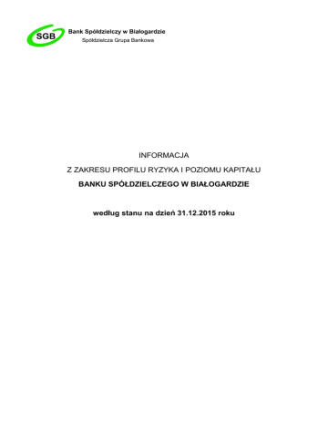 Bank Spółdzielczy w Białogardzie Spółdzielcza Grupa Bankowa INFORMACJA Z ZAKRESU PROFILU RYZYKA I POZIOMU KAPITAŁU BANKU SPÓŁDZIELCZEGO W BIAŁOGARDZIE według stanu na dzień 31.12.2015 roku Bank Spółdzielczy w Białogardzie I. WSTĘP 1. Niniejsza informacja została opracowana w celu realizacji „Polityki ujawnień w zakresie profilu ryzyka i poziomu kapitału w Banku spółdzielczym w Białogardzie”, wprowadzonej Uchwałą Zarządu Nr 61/2015 z dnia 09.12.2015 r., zatwierdzonej Uchwałą Rady Nadzorczej Nr 17/2015 z dnia 15.12.2015 r. oraz spełnienia wymogów dotyczących ujawniania informacji zawartych w Rozporządzeniu Parlamentu Europejskiego i Rady UE nr 575/2013 z dnia 26.06.2013 r. w sprawie wymogów ostrożnościowych dla instytucji kredytowych i firm inwestycyjnych, zmieniające rozporządzenie (UE) nr 648/2012 (zwanego dalej CRR), stanowiącego podstawę prawną na dzień sporządzenia niniejszej informacji, tj. na 31.12.2015 r. 2. Informacje ogólne W 2015 roku BS w Białogardzie prowadził działalność poprzez swoje placówki: Centrala - ul. Kochanowskiego 6, 78-200 Białogard http: www.bsbialogard.pl e-mail: [email protected] Oddział w Barwicach ul. Bankowa 9, 78-460 Barwice Filia w Grzmiącej ul. Kolejowa 7 Punkt Obsługi Klienta w Barwicach pl. Wolności 12 Oddział w Białogardzie ul. Kochanowskiego 6, 78-200 Białogard Punkt Obsługi Klienta w Białogardzie ul. Szosa Połczyńska 1(Kaufland) Punkt Obsługi Klienta w Białogardzie ul. 1 Maja 18 (Urząd Miasta) Oddział w Dygowie ul. Kolejowa 14, 78-113 Dygowo Punkt Obsługi Klienta w Kołobrzegu ul. Źródlana 5 Punkt Obsługi Klienta w Ustroniu Morskim ul. Wojska Polskiego 15 N Punkt Obsługi Klienta w Ustroniu Morskim ul. Rolna 2 (Urząd Gminy) Oddział w Karlinie ul. Koszalińska 33, 78-230 Karlino Punkt Obsługi Klienta w Biesiekierzu 76-039 Biesiekierz (Urząd Gminy) Oddział w Tychowie ul. Dworcowa 9a, 78-220 Tychowo Punkt Obsługi Klienta w Tychowie ul. Bobolicka 17 (Urząd Gminy), Działalność operacyjna prowadzona była również za pośrednictwem bankowości internetowej. Bank Spółdzielczy w Białogardzie na dzień w podmiotach zależnych nieobjętych konsolidacją. 31.12.2015 roku nie posiadał udziałów 2 Bank Spółdzielczy w Białogardzie II. CELE I ZASADY POLITYKI ZARZĄDZANIA POSZCZEGÓLNYMI RYZYKAMI (art. 435 CRR) Informacje ogólne 1. Zarządzanie ryzykiem w Banku odbywa się zgodnie ze „Strategią zarządzania ryzykiem w Banku Spółdzielczym w Białogardzie” przygotowaną przez Zarząd i zatwierdzoną przez Radę Nadzorczą Banku. Strategia jest zgodna z założeniami „Strategii działania Banku Spółdzielczego w Białogardzie na lata 2011-2015 r.”, która podlega corocznemu przeglądowi zarządczemu i weryfikacji; przegląd i weryfikacja dokonywana jest również w przypadku występowania znaczących zmian wewnątrz lub w otoczeniu Banku. 2. „Strategia zarządzania ryzykiem w Banku Spółdzielczym z siedzibą w Białogardzie” jest powiązana również z innymi regulacjami o charakterze strategicznym, np. „Strategią zarządzania i planowania kapitałowego w Banku Spółdzielczym w Białogardzie”, „Procedurą planowania (…)”, a także Zasadami, które są dedykowane zarządzaniu poszczególnymi rodzajami ryzyk bankowych. 3. „Strategia zarządzania ryzykiem (…)” zawiera cele definiujące apetyt na ryzyko Banku, rozumiany jako maksymalny, akceptowalny poziom ryzyka jaki Bank może ponosić. 4. Cele definiujące apetyt na ryzyko mają charakter wskaźników ilościowych, w tym limitów wewnętrznych, a także założeń dotyczących zasad zarządzania ryzykiem o charakterze jakościowym. 5. Informacja dotycząca art. 435. ust. 1 lit a-d Rozporządzenia, tzn. strategii i procesów zarządzania tymi rodzajami ryzyka; struktury i organizacji odpowiedniej funkcji zarządzania ryzykiem, w tym informacji na temat jej uprawnień i statutu, lub innych odpowiednich rozwiązań w tym względzie; zakresu i charakteru systemów raportowania i pomiaru ryzyka; strategii w zakresie zabezpieczenia i ograniczenia ryzyka, a także strategii i procesów monitorowania stałej skuteczności instrumentów zabezpieczających i czynników łagodzących ryzyko – zawarte są w Załączniku nr 1 do niniejszego dokumentu. 6. Zatwierdzone przez Zarząd oświadczenie na temat adekwatności ustaleń dotyczących zarządzania ryzykiem w Banku, dające pewność, że stosowane systemy zarządzania ryzykiem są odpowiednie z punktu widzenia profilu i strategii Banku wymagane przez Art. 435 ust.1 lit. e zawarte jest w Załączniku nr 2. 7. Informacja na temat ryzyka, zgodna z art. 435 ust 1. lit f. w której omówiono ogólny profil ryzyka Banku związany ze strategią działalności, zawierająca kluczowe wskaźniki i dane liczbowe dotyczące ryzyka zawarta jest w „Strategii zarządzania ryzykiem w Banku Spółdzielczym w Białogardzie”. Raport z realizacji ustalonego przez Radę Nadzorczą apetytu na ryzyko wyrażonego wskaźnikami ilościowymi na dzień ogłoszenia informacji zawarty jest w Załączniku nr 3. 8. W zakresie art. 435 ust 2 Bank informuje, że: 1) Członkowie Zarządu Banku pełnią po jednym stanowisku dyrektorskim. Członkowie Rady Nadzorczej Banku pełnią po jednym stanowisku dyrektorskim. Przez stanowisko dyrektorskie należy rozumieć stanowisko zajmowane w organie Banku (odpowiednio Zarządzie albo Radzie Nadzorczej) lub organach innych podmiotów. 2) Członków Zarządu powołuje zgodnie z przepisami prawa Rada Nadzorcza, działając wg Statutu Banku biorąc pod uwagę wyniki oceny wstępnej kwalifikacji, doświadczenia i reputacji kandydata. Oceny następczej kwalifikacji, doświadczenia i reputacji członków Zarządu dokonuje Rada Nadzorcza zgodnie z Procedurą oceny kwalifikacji Członków 3 Bank Spółdzielczy w Białogardzie Zarządu i Zarządu. Członków Rady Nadzorczej powołuje Zebranie Przedstawicieli zgodnie ze Statutem Banku, biorąc pod uwagę