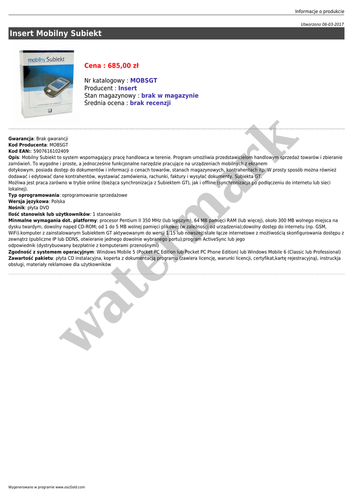 Informacje o produkcie Utworzono 06-03-2017 Insert Mobilny Subiekt Cena : 685,00 zł Nr katalogowy : MOBSGT Producent : Insert Stan magazynowy : brak w magazynie Średnia ocena : brak recenzji w at er m ar k Gwarancja: Brak gwarancji Kod Producenta: MOBSGT Kod EAN:: 5907616102409 Opis: Mobilny Subiekt to system wspomagający pracę handlowca w terenie. Program umożliwia przedstawicielom handlowym sprzedaż towarów i zbieranie zamówień. To wygodne i proste, a jednocześnie funkcjonalne narzędzie pracujące na urządzeniach mobilnych z ekranem dotykowym. posiada dostęp do dokumentów i informacji o cenach towarów, stanach magazynowych, kontrahentach itp. W prosty sposób można również dodawać i edytować dane kontrahentów, wystawiać zamówienia, rachunki, faktury i wysyłać dokumenty. Subiekta GT. Możliwa jest praca zarówno w trybie online (bieżąca synchronizacja z Subiektem GT), jak i offline (synchronizacja po podłączeniu do internetu lub sieci lokalnej). Typ oprogramowania: oprogramowanie sprzedażowe Wersja językowa: Polska Nośnik: płyta DVD Ilość stanowisk lub użytkowników: 1 stanowisko Minmalne wymagania dot. platformy: procesor Pentium II 350 MHz (lub lepszym), 64 MB pamięci RAM (lub więcej), około 300 MB wolnego miejsca na dysku twardym, dowolny napęd CD-ROM; od 1 do 5 MB wolnej pamięci plikowej (w zależności od urządzenia);dowolny dostęp do internetu (np. GSM, WiFi).komputer z zainstalowanym Subiektem GT aktywowanym do wersji 1.15 lub nowszej; stałe łącze internetowe z możliwością skonfigurowania dostępu z zewnątrz (publiczne IP lub DDNS, otwieranie jednego dowolnie wybranego portu);program ActiveSync lub jego odpowiednik (dystrybuowany bezpłatnie z komputerami przenośnymi) Zgodność z systemem operacyjnym: Windows Mobile 5 (Pocket PC Edition lub Pocket PC Phone Edition) lub Windows Mobile 6 (Classic lub Professional) Zawartość pakietu: płyta CD instalacyjna, koperta z dokumentacją programu (zawiera licencję, warunki licencji, certyfikat,kartę rejestracyjną), instruckja obsługi, materiały reklamowe dla użytkowników Wygenerowano w programie www.oscGold.com