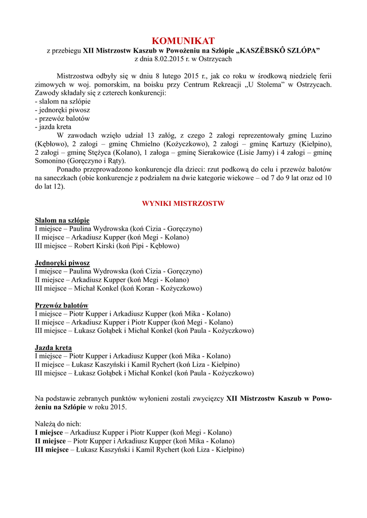 KOMUNIKAT z przebiegu XII Mistrzostw Kaszub w Powożeniu na Szlópie „KASZËBSKÔ SZLÓPA” z dnia 8.02.2015 r. w Ostrzycach Mistrzostwa odbyły się w dniu 8 lutego 2015 r., jak co roku w środkową niedzielę ferii zimowych w woj. pomorskim, na boisku przy Centrum Rekreacji „U Stolema” w Ostrzycach. Zawody składały się z czterech konkurencji: - slalom na szlópie - jednoręki piwosz - przewóz balotów - jazda kreta W zawodach wzięło udział 13 załóg, z czego 2 załogi reprezentowały gminę Luzino (Kębłowo), 2 załogi – gminę Chmielno (Kożyczkowo), 2 załogi – gminę Kartuzy (Kiełpino), 2 załogi – gminę Stężyca (Kolano), 1 załoga – gminę Sierakowice (Lisie Jamy) i 4 załogi – gminę Somonino (Goręczyno i Rąty). Ponadto przeprowadzono konkurencje dla dzieci: rzut podkową do celu i przewóz balotów na saneczkach (obie konkurencje z podziałem na dwie kategorie wiekowe – od 7 do 9 lat oraz od 10 do lat 12). WYNIKI MISTRZOSTW Slalom na szlópie I miejsce – Paulina Wydrowska (koń Cizia - Goręczyno) II miejsce – Arkadiusz Kupper (koń Megi - Kolano) III miejsce – Robert Kirski (koń Pipi - Kębłowo) Jednoręki piwosz I miejsce – Paulina Wydrowska (koń Cizia - Goręczyno) II miejsce – Arkadiusz Kupper (koń Megi - Kolano) III miejsce – Michał Konkel (koń Koran - Kożyczkowo) Przewóz balotów I miejsce – Piotr Kupper i Arkadiusz Kupper (koń Mika - Kolano) II miejsce – Arkadiusz Kupper i Piotr Kupper (koń Megi - Kolano) III miejsce – Łukasz Gołąbek i Michał Konkel (koń Paula - Kożyczkowo) Jazda kreta I miejsce – Piotr Kupper i Arkadiusz Kupper (koń Mika - Kolano) II miejsce – Łukasz Kaszyński i Kamil Rychert (koń Liza - Kiełpino) III miejsce – Łukasz Gołąbek i Michał Konkel (koń Paula - Kożyczkowo) Na podstawie zebranych punktów wyłonieni zostali zwycięzcy XII Mistrzostw Kaszub w Powożeniu na Szlópie w roku 2015. Należą do nich: I miejsce – Arkadiusz Kupper i Piotr Kupper (koń Megi - Kolano) II miejsce – Piotr Kupper i Arkadiusz Kupper (koń Mika - Kolano) III miejsce – Łukasz Kaszyński i Kamil Rychert (koń Liza - Kiełpino) KONKURENCJE DLA DZIECI Rzut do celu (dzieci od 7 do 9 lat) I miejsce – Alicja Gruchała (Piotrowo) II miejsce – Tomasz Birr (Kamienica Szlachecka) III miejsce – Gracjan Konkel (Kożyczkowo) Przewóz balotów na saneczkach (dzieci od 7 do 9 lat) I miejsce –Tobiasz Nader (Grzybno) II miejsce – Alicja Gruchała (Piotrowo) III miejsce – Nicola Wrońska (Łączyno) Rzut do celu (dzieci od 10 do 12 lat) I miejsce – Patryk Brylowski (Ostrzyce) II miejsce – Izabela Puzdrowska (Brodnica Górna) III miejsce – Maria Szwichtenberg (Ostrzyce) Przewóz balotów na saneczkach (dzieci od 10 do 12 lat) I miejsce – Fabian Nader (Grzybno) II miejsce – Agata Wrońska III miejsce – Nicola Birr (Kamienica Szlachecka) Imprezę umilała kaszubska „Kapela Kazimierza” z Borzestowskiej Huty, która w przerwach prezentowała znane na Kaszubach utwory muzyczne. Sędziami zawodów byli: Danuta Kosowska - sędzia główny oraz sędziowie pomocniczy: Angelika Miłosz i Mariusz Michalak.. Organizatorami Mistrzostw byli: Gminny Ośrodek Kultury w Somoninie, Samorząd Województwa Pomorskiego, Starostwo Powiatowe w Kartuzach, Centrum Rekreacji „U Stolema” w Ostrzycach, Hodowcy Koni Zimnokrwistych na Kaszubach oraz Stowarzyszenie „Przyjazna Wieś Kaszubska”. Imprezę prowadził Piotr Szyca z Radia „Kaszebe”. Zawodnicy oraz uczestnicy imprezy mogli skorzystać z darmowego poczęstunku kuchni kaszubskiej.
