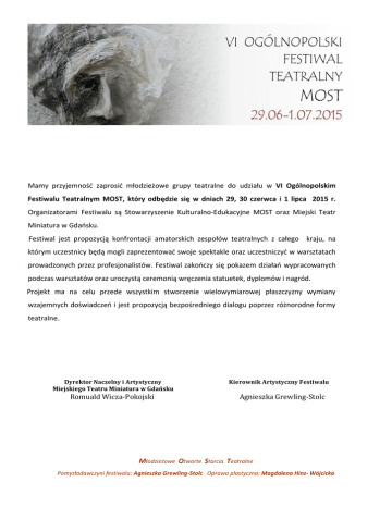 Mamy przyjemność zaprosić młodzieżowe grupy teatralne do udziału w VI Ogólnopolskim Festiwalu Teatralnym MOST, który odbędzie się w dniach 29, 30 czerwca i 1 lipca 2015 r. Organizatorami Festiwalu są Stowarzyszenie Kulturalno-Edukacyjne MOST oraz Miejski Teatr Miniatura w Gdańsku. Festiwal jest propozycją konfrontacji amatorskich zespołów teatralnych z całego kraju, na którym uczestnicy będą mogli zaprezentować swoje spektakle oraz uczestniczyć w warsztatach prowadzonych przez profesjonalistów. Festiwal zakończy się pokazem działań wypracowanych podczas warsztatów oraz uroczystą ceremonią wręczenia statuetek, dyplomów i nagród. Projekt ma na celu przede wszystkim stworzenie wielowymiarowej płaszczyzny wymiany wzajemnych doświadczeń i jest propozycją bezpośredniego dialogu poprzez różnorodne formy teatralne. Dyrektor Naczelny i Artystyczny Miejskiego Teatru Miniatura w Gdańsku Romuald Wicza-Pokojski Kierownik Artystyczny Festiwalu Agnieszka Grewling-Stolc Młodzieżowe Otwarte Starcia Teatralne Pomysłodawczyni festiwalu: Agnieszka Grewling-Stolc Oprawa plastyczna: Magdalena Hinz- Wójcicka REGULAMIN VI Ogólnopolskiego Festiwalu Teatralnego MOST 2015 1. Organizatorzy festiwalu: Stowarzyszenie Kulturalno-Edukacyjne MOST oraz Miejski Teatr Miniatura w Gdańsku. 2. MOST jest festiwalem o zasięgu ogólnopolskim i nie posiada formuły konkursowej. 3. Celem festiwalu jest: a) prezentacja i konfrontacja twórczości amatorskich zespołów teatralnych z całego kraju, b) inspirowanie do poszukiwań nowych form pracy artystycznej, c) integracja środowiska amatorskich działań teatralnych. 4. W festiwalu uczestniczyć mogą teatry instytucjonalne i pozainstytucjonalne skupiające młodzież w wieku od 14 do 25 roku życia. 5. Młodzieżowe Otwarte Starcia Teatralne odbywają się w Miejskim Teatrze Miniatura w Gdańsku w dniach 29, 30 czerwca i 1 lipca 2015 r. 6. Warunki wzięcia udziału w festiwalu: - ze względów organizacyjnych grupa teatralna nie powinna liczyć więcej niż 25 osób + instruktor (szczegóły do ustalenia z organizatorem), - czas trwania spektaklu nie powinien przekroczyć 45 minut, - ze względów technicznych organizatorzy sugerują ograniczoną ilość elementów scenograficznych (czas montażu i demontażu nie powinien przekroczyć 10 min.), - aby wziąć udział w starciach należy do dnia 17 maja 2015 roku nadesłać płytę DVD z nagranym spektaklem wraz z kartą zgłoszenia. Ponadto kartę zgłoszenia należy obowiązkowo przesłać na adres e-mail [email protected] w formie edytowalnej (Word). - do udziału w festiwalu zaproszone zostaną grupy zakwalifikowane przez organizatora na podstawie nadesłanych nagrań (zastrzega się nieodsyłanie płyt). Zawiadomienia rozsyłane będą drogą elektroniczną do 24.05.2015 r. (informacja także na stronie www.most-gdansk.pl i na profilu FB), - zakwalifikowane zespoły zostaną osobiście poinformowane o szczegółach festiwalu. 7. Każda grupa teatralna otrzyma dyplom uczestnictwa w festiwalu oraz pamiątkową statuetkę. 8. Podczas trwania MOSTu uczestnicy będą wybierać spośród obejrzanych spektakli ich zdaniem najlepszy. Podczas ceremonii zakończenia festiwalu zostanie wręczona Nagroda Publiczności – czek o wartości 500 PLN. 9. Dyrektor Teatru przyzna dwie Nagrody Indywidualne dla najlepszej aktorki i aktora. 10. Organizator przewiduje także przyznanie nagród specjalnych (m.in. Nagroda Sponsora lub Patrona). 11. Organizatorzy zapewniają warunki sceniczne oraz pomoc techniczną zgodnie z informacjami zawartymi w karcie zgłoszenia (o ewentualnym braku możliwości zapewnienia środków technicznych uczestnicy będą zawiadamiani osobiście). Warunki sceniczne do wglądu na www.teatrminiatura.pl 12. Koszt przejazdu i pobytu pokrywają uczestnicy*: koszt pobytu na jednego uczestnika przeglądu wynosi 150 zł (cena uwzględnia 2 noclegi i wyżywienie (śniadania, obiady, kolacje) - od obiadu 29.06 do śniadania 01.07 - oraz koszty organizacyjne przeglądu**), koszt uczestnictwa zespołów, które nie korzystają z noclegów i wyżywienia ogranicza się do pokrycia kosztów organizacyjnych w kwocie 30 zł od osoby, organizator zapewnia możliwość noclegu ze śniadaniem z 28.06 na 29.06 za dodatkową opłatą ok. 40 zł od osoby, uczestnikom, którzy nie korzystają z noclegów organizator zapewnia możliwość wykupienia 2 obiadów i 2 kolacji (29 i 30.06) za dodatkową opłatą ok. 50 zł od osoby. 13. Akredytacje uczestnicy będą zobowiązani wpłacić do dnia 5 czerwca na konto Stowarzyszenia szczegóły podane zostaną w piśmie powiadamiającym o kwalifikacji do festiwalu. 14. Warsztaty dla uczestników są bezpłatne – zespołom zostaną wydane dyplomy wzięcia udziału w warsztatach. 15. Karty zgłoszenia należy dostarczyć do dnia 17 maja 2015 r. drogą elektroniczną na adres [email protected], a także przesłać pocztą wraz z nagraniem na adres: Miejski Teatr Miniatura Stowarzyszenie Kulturalno-Edukacyjne Most Ul. Grunwaldzka 16 80-236 Gdańsk z dopiskiem FESTIWAL MOST tel. 58/341-94-83 KONTAKT: Agnieszka Grewling-Stolc tel.kom. 0-601-958-184; e-mail: [email protected] Regulamin i karta zgłoszenia oraz szczegółowe informacje na: www.most-gdansk.pl * za uczestnika uważa się młodzież oraz wszystkie osoby dorosłe (instruktor i inne osoby towarzyszące) **organizator zastrzega sobie możliwość niewielkiej zmiany ostatecznych kosztów noclegów i wyżywienia