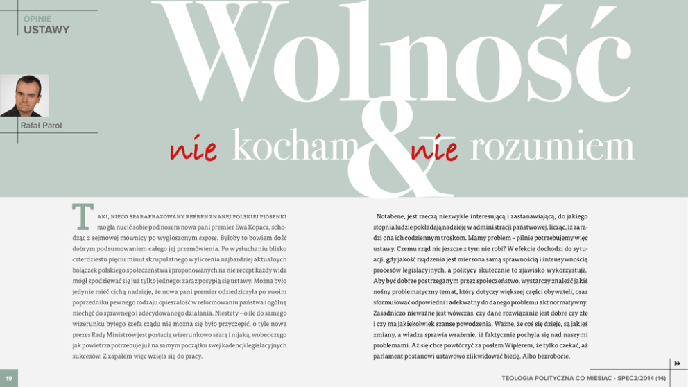 OPINIE USTAWY Rafał Parol Wolność & nie T kocham nie rozumiem aki, nieco sparafrazowany refren znanej polskiej piosenki Notabene, jest rzeczą niezwykle interesującą i zastanawiającą, do jakiego mogła nucić sobie pod nosem nowa pani premier Ewa Kopacz, scho‑ stopnia ludzie pokładają nadzieję w administracji państwowej, licząc, iż zara‑ dząc z sejmowej mównicy po wygłoszonym expose. Byłoby to bowiem dość dzi ona ich codziennym troskom. Mamy problem – pilnie potrzebujemy więc dobrym podsumowaniem całego jej przemówienia. Po wysłuchaniu blisko ustawy. Czemu rząd nic jeszcze z tym nie robi? W efekcie dochodzi do sytu‑ czterdziestu pięciu minut skrupulatnego wyliczenia najbardziej aktualnych acji, gdy jakość rządzenia jest mierzona samą sprawnością i intensywnością bolączek polskiego społeczeństwa i proponowanych na nie recept każdy widz procesów legislacyjnych, a politycy skutecznie to zjawisko wykorzystują. mógł spodziewać się już tylko jednego: zaraz posypią się ustawy. Można było Aby być dobrze postrzeganym przez społeczeństwo, wystarczy znaleźć jakiś jedynie mieć cichą nadzieję, że nowa pani premier odziedziczyła po swoim nośny problematyczny temat, który dotyczy większej części obywateli, oraz poprzedniku pewnego rodzaju opieszałość w reformowaniu państwa i ogólną sformułować odpowiedni i adekwatny do danego problemu akt normatywny. niechęć do sprawnego i zdecydowanego działania. Niestety – o ile do samego Zasadniczo nieważne jest wówczas, czy dane rozwiązanie jest dobre czy złe wizerunku byłego szefa rządu nie można się było przyczepić, o tyle nowa i czy ma jakiekolwiek szanse powodzenia. Ważne, że coś się dzieje, są jakieś prezes Rady Ministrów jest postacią wizerunkowo szarą i nijaką, wobec czego zmiany, a władza sprawia wrażenie, iż faktycznie pochyla się nad naszymi jak powietrza potrzebuje już na samym początku swej kadencji legislacyjnych problemami. Aż się chce powtórzyć za posłem Wiplerem, że tylko czekać, aż sukcesów. Z zapałem więc wzięła się do pracy. parlament postanowi ustawowo zlikwidować biedę. Albo bezrobocie. 19 TEOLOGIA POLITYCZNA CO MIESIĄC • SPEC2/2014 (14) OPINIE USTAWY Od expose nie minął nawet miesiąc, a sejm już zdążył przegłosować dwie ważne ustawy. Najważniejsze pytanie dotyczny oczywiście tego, kto za to zapłaci – pracodawca czy pracownik. Teoria ekonomii mówi, iż tego do końca nie wiadomo Nie świadczy to niestety zbyt dobrze o nas samych. Za cenę zyska‑ na pracę. Podaż pracy zapewniają pracownicy. Z danym punktem nia choćby pozorów bezpieczeństwa jesteśmy gotowi oddać naszą równowagi rynkowej związane są zawsze pewne elastyczności wolność. W efekcie nie mamy ani jednego, ani drugiego. Chętnie cenowe, zarówno po stronie popytowej, jak i podażowej. Elastycz‑ pozbywamy się odpowiedzialności za kluczowe decyzje, które trzeba ności cenowe popytu i podaży informują o tym, jak bardzo zmie‑ podjąć, za losy naszej wspólnoty, oddając ją w ręce ludzi, których nie nia się odpowiednio zapotrzebowanie na dane dobro (pracę) na szanujemy i którym nie ufamy. Narasta w nas frustracja, choć to danym rynku oraz oferowana jego ilość, w zależności od zmiany przecież nasz świadomy wybór. To my podejmujemy decyzję, że nie ceny tego dobra (pracy). Przykładowo, jeśli popyt charakteryzuje się interesujemy się sprawami społecznymi ani gospodarką. Zadowa‑ dużą elastycznością, oznacza to, że pracodawca jest gotów znacznie lamy się nagłówkami z gazet, czasem obejrzymy w telewizji taki zwiększyć zatrudnienie, jeśli wynagrodzenie pracowników będzie czy inny program informacyjny. Ale brakuje nam chęci, aby podjąć nieco niższe, lub znacznie je zmniejszyć, jeśli wzrośnie ono choćby wysiłek samodzielnego zastanowienia się nad zagadnieniami, nad w niewielkim stopniu. Podobnie, jeśli podaż jest elastyczna, ozna‑ którymi debatuje sejm. Nie mamy własnych przemyśleń na dany cza to, że pracownicy są w stanie pracować dużo więcej i chętniej temat – przejmujemy je jedynie od innych. A w tym samym czasie za choćby minimalnie wyższą stawkę i dużo mniej za minimalnie urzędnicy państwowi bardzo chętnie wkraczają w kolejne obszary niższą. Im większa elastyczność popytu lub podaży, tym większa naszego życia. Uzasadniają w ten sposób rację swojego bytu oraz możliwość przerzucenia ewentualnych podatków na drugą stronę. czerpią korzyści z coraz większej władzy i coraz większych przywi‑ Elastyczność związana jest w tym wypadku bezpośrednio z dostęp‑ lejów z nią związanych. nością alternatywnych wariantów działania. Bycie elastycznym A oznacza dla pracodawców możliwość łatwego znalezienia sobie le wróćmy do naszej nowej pani premier. Od expose nie minął nawet miesiąc, a sejm już zdążył przegłosować dwie ważne ustawy. Pierwsza z nich dotyczyła oskładkowania umów‑zleceń. Zawarcie tego typu umowy będzie implikowało konieczność odpro‑ wadzenia składek na rzecz ZUS. Najważniejsze pytanie dotyczy oczywiście tego, kto za to zapłaci – pracodawca czy pracownik. Teoria ekonomii mówi, iż tego do końca nie wiadomo. Wszystkie podatki i daniny na rzecz państwa są przerzucalne, jednak o tym, kto faktycznie poniesie jaką część kosztu ich wpro‑ wadzenia, decyduje konkretna sytuacja na danym rynku pracy. Pracodawca reprezentuje na nim stronę popytową – zgłasza popyt innych potencjalnych pracowników bądź wykorzystania innych czynników produkcji, a dla pracowników możliwość łatwego zna‑ lezienia zatrudnienia na innym rynku. Elastyczność przekłada się więc na pozycję negocjacyjną każdej ze stron. Na pierwszy rzut oka pozycja negocjacyjna pracowników wydaje się być dużo słabsza, z uwagi na wysoki poziom bezrobocia wśród ludzi młodych, po studiach, dopiero rozpoczynaj