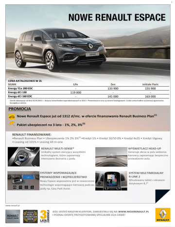 1 CENA KATALOGOWA W ZŁ SILNIK Energy TCe 200 EDC Energy dCi 130 Energy dCi 160 EDC Life Zen Initiale Paris 119 000 - 133 900 141 000 155 900 163 000 Cennik obowiązuje od dnia 01.04.2015 r., dotyczy samochodów wyprodukowanych w 2015 r. Prezentowane ceny są cenami katalogowymi. Liczba samochodów w promocji ograniczona. Szczegóły w salonie. PROMOCJA Nowe Renault Espace już od 1312 zł/mc. w ofercie finansowania Renault Business Plan(1) Pakiet ubezpieczeń na 3 lata - 1%, 2%, 3%(2) RENAULT FINANSOWANIE: •Renault Business Plan • Ubezpieczenie 1% 2% 3%(2) •Kredyt 1% • Kredyt 50/50 0% • Kredyt 4x25 • Kredyt Ulgowy • Leasing od 101% • Leasing All-in-one RENAULT MULTI-SENSE® WYŚWIETLACZ HEAD-UP Unikalny system sterujący wszystkimi technologiami, które zapewniają intensywne doznania z jazdy. Generuje obraz w polu widzenia kierowcy zapewniając bezpieczne prowadzenie auta. SYSTEMY WSPOMAGAJĄCE PROWADZENIE I BEZPIECZEŃSTWO SYSTEM MULTIMEDIALNY R-LINK 2 Nowy Espace wyposażony jest w nowoczesne technologie wspomagające kierowcę podczas jazdy np. Easy Park Assist. Wbudowany tablet z ekranem dotykowym 8,7" JEŚLI JESTEŚ NASZYM KLIENTEM, ZAREJESTRUJ SIĘ NA WWW.MOJERENAULT.PL I POZNAJ OFERTĘ PRZYGOTOWANĄ SPECJALNIE DLA CIEBIE! WYPOSAŻENIE Life Zen Initiale Paris ABS z ukła dem ws poma ga ni a na głego ha mowa ni a ● ● ● Sys tem dyna mi cznej kontrol i toru ja zdy ESC ● ● ● Automa tyczny ha mul ec pos tojowy, el ektromecha ni czny ● ● ● Czołowe podus zki powi etrzne ki erowcy i pa s a żera z możl i woś ci ą deza ktywa cji podus zki pa s a żera ● ● ● Boczne podus zki powi etrzne ● ● ● Podus zki kurtynowe w 1. i 2.rzędzi e ● ● ● Czujni k ś wi a tła i des zczu ● ● ● Automa tyczna bl oka da drzwi podcza s ja zdy ● ● ● Sys tem mocowa ni a fotel i ka dl a dzi ecka Is ofi x na tyl nych mi ejs ca ch w 2. rzędzi e ● ● ● Sys tem kontrol i bezpi ecznej odl egłoś ci - P ● Aktywny s ys tem ws poma ga ni a na głego ha mowa ni a - P ● Sys tem ws poma ga ni a pa rkowa ni a przód/tył/bok ● ● ● Ka mera cofa ni a - P ● System wspomagania parkowania Easy Park Assist - P ● 4 koła s krętne - P ● Ukła d El ectroni c Da mper Control (el ektryczni e regul owa na s i ła tłumi eni a a mortyza torów) - P ● Regul a tor - ogra ni czni k prędkoś ci ● ● ● Aktywny regul a tor prędkoś ci - P P Ada pta cyjne ś wi a tła drogowe, s ys tem kontrol i pa s a ruchu LWD, s ys tem os trzega ni a o na dmi ernej prędkoś ci z funkcją rozpozna wa ni a zna ków drogowych - P ● Wyś wi etl a cz Hea d-Up - P P Zes ta w do na pra wy us zkodzeni a opony ● ● ● Sys tem kontrol i ci ś ni eni a w opona ch ● ● ● 310 310 310 Sys tem ws poma ga ni a przy rus za ni u pod górę (HSA) ● ● ● Sys tem kontrol i tra kcji ● ● ● Układ odzyskiwania energii podczas hamowania (Energy Smart Management) ● ● ● Komputer pokładowy ● ● ● Układ kierowniczy ze wspomaganiem elektrycznym ● ● ● Rena ul t Mul ti -Sens e ® - ● ● Świ a tła LED Pure Vi s i on ● ● ● Stalowe obręcze kół 17" VORTEX ● - - Aluminiowe obręcze kół 17'' AQUILA 2 500 0 - Aluminiowe obręcze kół 18'' LAPIAZ 4 500 ● - Aluminiowe obręcze kół 19'' QUARTZ - P - BEZPIECZEŃSTWO SYSTEMY WSPOMAGAJĄCE PROWADZENIE Koło za pa s owe doja zdowe PROWADZENIE WYGLĄD ZEWNĘTRZNY Aluminiowe obręcze kół 19'' INITIALE PARIS - - ● Obudowa lusterek bocznych w kolorze lśniącej czerni ● ● ● Szyby tyl ne boczne i tyl na przyci emni a ne - ● ● La ki er meta l i zowa ny 2 500 2 500 2 500 La ki er meta l i zowa ny s pecja l ny 3 200 3 200 3 200 Tonacja wnętrza w kolorze brązowym ● ● ● Tonacja wnętrza w kolorze szarym - 0 0 Tapicerka materiałowa w kolorze brązowym ● - - Tapicerka materiałowa łączona ze skórą ekologiczną w kolorze brązowym - ● - Tapicerka skórzana w kolorze brązowym - 6 000 ● Tapicerka skórzana cieniowana szaro-brązowa - - 0 Ozdobny pa nel kons ol i ś rodkowej brązowy "Dot Effect" - ● - Ozdobny pa nel kons ol i ś rodkowej "Hol ogra m" - 200 - Ozdobny panel konsoli środkowej "Silver Wood" - 200 ● Ozdobny panel konsoli środkowej jasnoszary - - 200 Dywaniki podłogowe w 1. i 2. rzędzie ● ● ● WYGLĄD WNĘTRZA Life Zen Initiale Paris Ozdobny pa nel kons ol i ś rodkowej "Hol ogra m" - 200 - Ozdobny pa nel kons ol i ś rodkowej brązowy "Dot Effect" - ● - Ozdobny panel konsoli środkowej "Silver Wood" - 200 ● WYGLĄD WNĘTRZA - cd Ozdobny panel konsoli środkowej jasnoszary - - 200 Dywaniki podłogowe w 1. i 2. rzędzie ● ● ● ● ● ● Dach panoramiczny elektrycznie otwierany w częsci przedniej - 4 000 4 000 Karta Renault Hands Free ● ● ● Automatyczna klimatyzacja dwustrefowa ● ● ● 2 000 2 000 ● Szyby przednie i tylne regulowane eletrycznie ● ● ● Wewnętrzne lusterko wsteczne elektrochromatyczne ● ● ● Elektrycznie regulowane i składane lusterka boczne ● ● - Elektrycznie regulowane i składane lusterka boczne z pamięcią ustawienia - 500 ● Żaluzje przeciwsłoneczne w 2. rzędzie - ● ● KOMFORT Dach panoramiczny, w części przedniej nieotwierany Dodatkowy moduł klimatyzacji Oświetlenie ambientowe wnętrza AMBIENT LIGHTING - ● ● 800 800 ● Podgrzewana szyba przednia P P P Zagłówki Relax w 1. i 2. rzędzie - - ● Elektrycznie otwierana klapa bagażnika - P ● Atermiczna szyba przednia SIEDZENIA Trzy niezależne fotele 2. rzędu ● ● ● 4 000 4 000 4 000 1000/P 1000/P ● Pogrzewane fotele boczne 2.rzędu Fotele przednie z regulacją wysokości , fotel kierowcy z regulacją podparcia lędźwiowego P P P ● - - Fotele przednie z regulacją wysokości i podparcia lędźwiowego - ● - - 1 250 - - 2 500 ● ● ● ● System multimedialny R-Link 2® ● ● ● Nagłośnienie Arkamys® ● ● - Nagłośnienie Bose® Surround System - 3 200 ● Mapa Europy wersja rozszerzona ● ● ● DVD