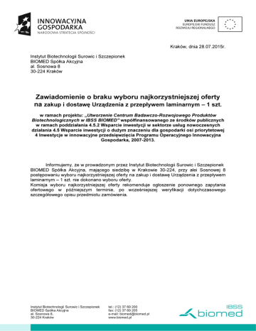 Kraków, dnia 28.07.2015r. Instytut Biotechnologii Surowic i Szczepionek BIOMED Spółka Akcyjna al. Sosnowa 8 30-224 Kraków Zawiadomienie o braku wyboru najkorzystniejszej oferty na zakup i dostawę Urządzenia z przepływem laminarnym – 1 szt. w ramach projektu: „Utworzenie Centrum Badawczo-Rozwojowego Produktów Biotechnologicznych w IBSS BIOMED” współfinansowanego ze środków publicznych w ramach poddziałania 4.5.2 Wsparcie inwestycji w sektorze usług nowoczesnych działania 4.5 Wsparcie inwestycji o dużym znaczeniu dla gospodarki osi priorytetowej 4 Inwestycje w innowacyjne przedsięwzięcia Programu Operacyjnego Innowacyjna Gospodarka, 2007-2013. Informujemy, że w prowadzonym przez Instytut Biotechnologii Surowic i Szczepionek BIOMED Spółka Akcyjna, mającego siedzibę w Krakowie 30-224, przy alei Sosnowej 8 postępowaniu wyboru najkorzystniejszej oferty na zakup i dostawę Urządzenia z przepływem laminarnym – 1 szt. nie dokonano wyboru oferty. Komisja wyboru najkorzystniejszej oferty rekomenduje ogłoszenie ponownego zapytania ofertowego w późniejszym terminie, po wcześniejszej weryfikacji dotychczasowego szczegółowego opisu przedmiotu zamówienia.