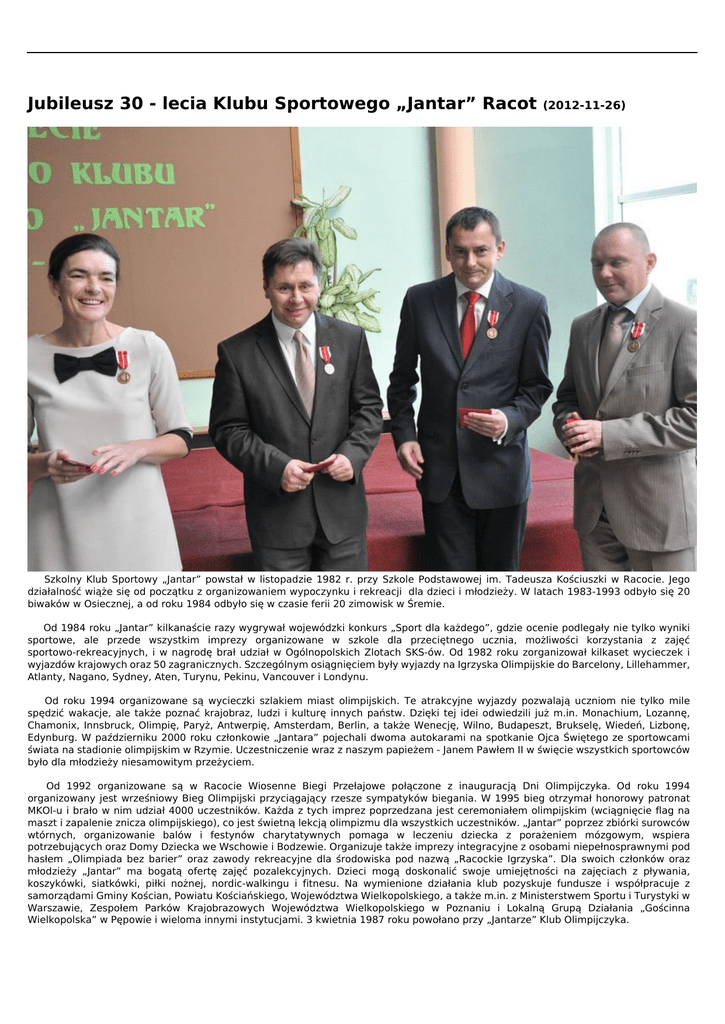Jubileusz 30 - lecia Klubu Sportowego „Jantar” Racot (2012-11-26) Szkolny Klub Sportowy „Jantar” powstał w listopadzie 1982 r. przy Szkole Podstawowej im. Tadeusza Kościuszki w Racocie. Jego działalność wiąże się od początku z organizowaniem wypoczynku i rekreacji dla dzieci i młodzieży. W latach 1983-1993 odbyło się 20 biwaków w Osiecznej, a od roku 1984 odbyło się w czasie ferii 20 zimowisk w Śremie. Od 1984 roku „Jantar” kilkanaście razy wygrywał wojewódzki konkurs „Sport dla każdego”, gdzie ocenie podlegały nie tylko wyniki sportowe, ale przede wszystkim imprezy organizowane w szkole dla przeciętnego ucznia, możliwości korzystania z zajęć sportowo-rekreacyjnych, i w nagrodę brał udział w Ogólnopolskich Zlotach SKS-ów. Od 1982 roku zorganizował kilkaset wycieczek i wyjazdów krajowych oraz 50 zagranicznych. Szczególnym osiągnięciem były wyjazdy na Igrzyska Olimpijskie do Barcelony, Lillehammer, Atlanty, Nagano, Sydney, Aten, Turynu, Pekinu, Vancouver i Londynu. Od roku 1994 organizowane są wycieczki szlakiem miast olimpijskich. Te atrakcyjne wyjazdy pozwalają uczniom nie tylko mile spędzić wakacje, ale także poznać krajobraz, ludzi i kulturę innych państw. Dzięki tej idei odwiedzili już m.in. Monachium, Lozannę, Chamonix, Innsbruck, Olimpię, Paryż, Antwerpię, Amsterdam, Berlin, a także Wenecję, Wilno, Budapeszt, Brukselę, Wiedeń, Lizbonę, Edynburg. W październiku 2000 roku członkowie „Jantara” pojechali dwoma autokarami na spotkanie Ojca Świętego ze sportowcami świata na stadionie olimpijskim w Rzymie. Uczestniczenie wraz z naszym papieżem - Janem Pawłem II w święcie wszystkich sportowców było dla młodzieży niesamowitym przeżyciem. Od 1992 organizowane są w Racocie Wiosenne Biegi Przełajowe połączone z inauguracją Dni Olimpijczyka. Od roku 1994 organizowany jest wrześniowy Bieg Olimpijski przyciągający rzesze sympatyków biegania. W 1995 bieg otrzymał honorowy patronat MKOl-u i brało w nim udział 4000 uczestników. Każda z tych imprez poprzedzana jest ceremoniałem olimpijskim (wciągnięcie flag na maszt i zapalenie znicza olimpijskiego), co jest świetną lekcją olimpizmu dla wszystkich uczestników. „Jantar” poprzez zbiórki surowców wtórnych, organizowanie balów i festynów charytatywnych pomaga w leczeniu dziecka z porażeniem mózgowym, wspiera potrzebujących oraz Domy Dziecka we Wschowie i Bodzewie. Organizuje także imprezy integracyjne z osobami niepełnosprawnymi pod hasłem „Olimpiada bez barier” oraz zawody rekreacyjne dla środowiska pod nazwą „Racockie Igrzyska”. Dla swoich członków oraz młodzieży „Jantar” ma bogatą ofertę zajęć pozalekcyjnych. Dzieci mogą doskonalić swoje umiejętności na zajęciach z pływania, koszykówki, siatkówki, piłki nożnej, nordic-walkingu i fitnesu. Na wymienione działania klub pozyskuje fundusze i współpracuje z samorządami Gminy Kościan, Powiatu Kościańskiego, Województwa Wielkopolskiego, a także m.in. z Ministerstwem Sportu i Turystyki w Warszawie, Zespołem Parków Krajobrazowych Województwa Wielkopolskiego w Poznaniu i Lokalną Grupą Działania „Gościnna Wielkopolska” w Pępowie i wieloma innymi instytucjami. 3 kwietnia 1987 roku powołano przy „Jantarze” Klub Olimpijczyka. Zaczęło się od zapraszania do przyjazdu sportowców i olimpijczyków. Pierwszymi gośćmi byli pływaczka Agnieszka Czopek, żużlowcy Roman Jankowski i Zenon Kasprzak, kolarz Stanisław Szozda, bokser Józef Grudzień, kanadyjkarz Marek Łbik. Do tej pory Racot odwiedziło już 180 sportowców, w tym ponad 100 uczestników igrzysk i paraolimpiad, wielu złotych medalistów m.in. Irena Szewińska, Jan Kowalczyk, Władysław Komar, Kazimierz Górski, Mateusz Kusznierewicz, Paweł Nastula, Renata Mauer, Szymon Ziółkowski, Robert Korzeniowski, Krzysztof Ślęczka, Andrzej Wróbel. Za swoją działalność SKS „Jantar” Racot, jego prezes - Wojciech Ziemniak oraz działacze otrzymali wiele wyróżnień, m.in. Złoty Medal za zasługi dla PKOl-u w 1987 roku, wyróżnienie „Fair Play” PKOl-u za rok 1998, statuetkę „PROFI” w ogólnopolskim konkursie „Baw się z nami sportowcami” w 1999 roku, Grand Prix KRRiTV za audycję radiową o „Jantarze” pt. „Los Kibicos” w 2002 roku, Trofeum MKOl-u za promowanie sportu, kultury i nauki w roku 2010, tytuł „Zasłużony dla Gminy Kościan” w roku 2011. Jubileuszowe uroczystości odbyły się 17 listopada br. w Gimnazjum im. Polskich Olimpijczyków w Racocie. Przybyło na nie wielu znamienitych gości i przyjaciół klubu, m.in. samorządowcy powiatu kościańskiego na czele ze Starostą Andrzejem Jęczem i Wójtem Gminy Kościan – Henrykiem Bartoszewskim, Wielkopolski Kurator Oświaty – Elżbieta Walkowiak, były Sekretarz Generalny Polskiego Komitetu Olimpijskiego – Tadeusz Wróblewski, Wiceprezes Totalizatora Sportowego – Zbigniew Sołtysiański, Marian Sypniewski i Elżbieta Kwiatkowska z Polskiego Komitetu Olimpijskiego, Prezes SZS „Wielkopolska” – Zdzisław Urbańczyk, Prezes Banku Spółdzielczego – Radosław Grygier, Dyrektor BZ WBK- Ewa Kokocińska-Kaptur, Dyrektor Powiatowego Urzędu Pracy – Ewa Beba. Szczególnymi gośćmi byli olimpijczycy i sportowcy: Marek Łbik - dwukrotny medalista w kajakarstwie z Seulu, Andrzej Wróbel - trzykrotny złoty medalista Igrzysk Paraolimpijskich w Barcelonie, Atlancie i Sydney, Marian Sypniewski - dwukrotny medalista we florecie z Moskwy i Barcelony, Tadeusz Kulczycki - lekkoatleta, olimpijczyk z Monachium, Mariusz Kubiak - hokeista na trawie, olimpijczyk z Moskwy, Zbigniew Rachwalski - hokeista na trawie, olimpijczyk z Moskwy, Violetta Zbytek - wioślarka, Ewa Pomes - wioślarka, olimpijka z Moskwy, Sławomir Mocek - florecista, olimpijczyk z Sydney i Pekinu. Do Racotu przybyli także przedstawiciele Klubów Olimpijczyka z Wysocka Wielkiego (woj. wielkopolskie), Raciborza (woj. śląskie)