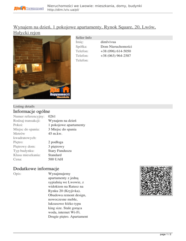 Nieruchomości we Lwowie: mieszkania, domy, budynki http://dim.lviv.ua/pl/ Wynajem na dzień, 1 pokojowe apartamenty, Rynok Square, 20, Lwów, Hałycki rejon Seller Info Imię: Spółka: Telefon: Telefon: Telefon: dimlvivua Dom Nieruchomości +38 (096) 614-5050 +38 (063) 964-2587 Listing details Informacje ogólne Numer referencyjny: Rodzaj transakcji: Pokoi: Miejsc do spania: Metrów kwadratowych: Piętro: Piętrowy dom: Typ budynku: Klasa mieszkania: Cena: 0261 Wynajem na dzień 1 pokojowe apartamenty 3 Miejsc do spania 45 m.kw. 2 podłoga 3 piętrowy Stary Funduszu Standard 500 UAH Dodatkowe informacje Opis: Wynajmujemy apartamenty z jedną sypialnią we Lwowie, z widokiem na Ratusz na Rynku 20 (Kryjivka). Obudowa remont design, nowoczesne meble, luksusowe łóżko typu king size. Stale gorąca woda, internet Wi-Fi. Drugie piętro. Apartament page 1 / 2 Nieruchomości we Lwowie: mieszkania, domy, budynki http://dim.lviv.ua/pl/ jest przeznaczony dla trzech osób (2). Lokalizacja Kraj: Obwód: Miasto: Rejon: Ulice: Numer domu: Ukraina Obwód Lwowski Lwów Hałycki rejon Rynok Square 20 page 2 / 2 Powered by TCPDF (www.tcpdf.org)