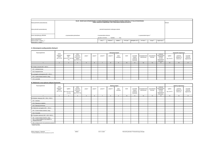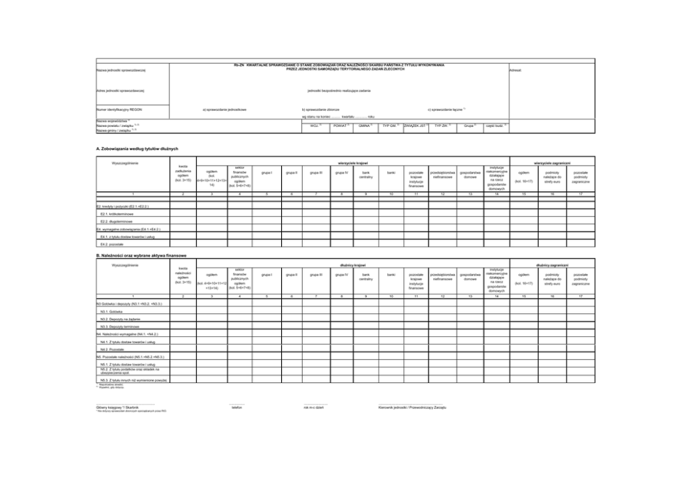Nazwa jednostki sprawozdawczej Rb-ZN KWARTALNE SPRAWOZDANIE O STANIE ZOBOWIĄZAŃ ORAZ NALEŻNOŚCI SKARBU PAŃSTWA Z TYTUŁU WYKONYWANIA PRZEZ JEDNOSTKI SAMORZĄDU TERYTORIALNEGO ZADAŃ ZLECONYCH Adres jednostki sprawozdawczej jednostki bezpośrednio realizujące zadania Numer identyfikacyjny REGON a) sprawozdanie jednostkowe Adresat: c) sprawozdanie łączne 1) b) sprawozdanie zbiorcze wg stanu na koniec .......... kwartału ............. roku 2) Nazwa województwa Nazwa powiatu / związku 1), 2) Nazwa gminy / związku 1), 2) WOJ. 2) POWIAT 2) grupa III grupa IV GMINA 2) TYP GM. 2) ZWIĄZEK JST 2) TYP ZW. 2) Grupa 2) banki pozostałe krajowe instytucje finansowe przedsiębiorstwa niefinansowe gospodarstwa domowe 10 11 12 13 banki pozostałe krajowe instytucje finansowe przedsiębiorstwa niefinansowe gospodarstwa domowe 11 12 część budż. 2) A. Zobowiązania według tytułów dłużnych Wyszczególnienie 1 kwota zadłużenia ogółem (kol. 3+15) 2 wierzyciele krajowi sektor ogółem finansów (kol. publicznych 4+9+10+11+12+13+ ogółem 14) (kol. 5+6+7+8) 3 4 grupa I grupa II 5 6 7 8 grupa I grupa II grupa III grupa IV bank centralny 9 wierzyciele zagraniczni instytucje niekomercyjne działające na rzecz gospodarstw domowych 14 (kol. 16+17) podmioty należące do strefy euro pozostałe podmioty zagraniczne 15 16 17 ogółem E2. kredyty i pożyczki (E2.1.+E2.2.) E2.1. krótkoterminowe E2.2. długoterminowe E4. wymagalne zobowiązania (E4.1.+E4.2.) E4.1. z tytułu dostaw towarów i usług E4.2. pozostałe B. Należności oraz wybrane aktywa finansowe Wyszczególnienie 1 kwota należności ogółem (kol. 3+15) 2 dłużnicy krajowi sektor finansów publicznych ogółem (kol. 4+9+10+11+12 (kol. 5+6+7+8) +13+14) ogółem 3 4 5 6 7 8 bank centralny 9 dłużnicy zagraniczni 10 N3 Gotówka i depozyty (N3.1 +N3.2. +N3.3.) N3.1. Gotówka N3.2. Depozyty na żądanie N3.3. Depozyty terminowe N4. Należności wymagalne (N4.1. +N4.2.) N4.1. Z tytułu dostaw towarów i usług N4.2. Pozostałe N5. Pozostałe należności (N5.1.+N5.2.+N5.3.) N5.1. Z tytułu dostaw towarów i usług N5.2. Z tytułu podatków oraz składek na ubezpieczenia społ. N5.3. Z tytułu innych niż wymienione powyżej 1) 2) Niepotrzebne skreślić. Wypełnić, gdy dotyczy. ................................................................ Główny księgowy */ Skarbnik * Nie dotyczy sprawozdań zbiorczych sporządzanych przez RIO. ................. telefon .......................... rok m-c dzień ...................................................................... Kierownik jednostki / Przewodniczący Zarządu 13 instytucje niekomercyjne działające na rzecz gospodarstw domowych 14 ogółem (kol. 16+17) podmioty należące do strefy euro pozostałe podmioty zagraniczne 15 16 17