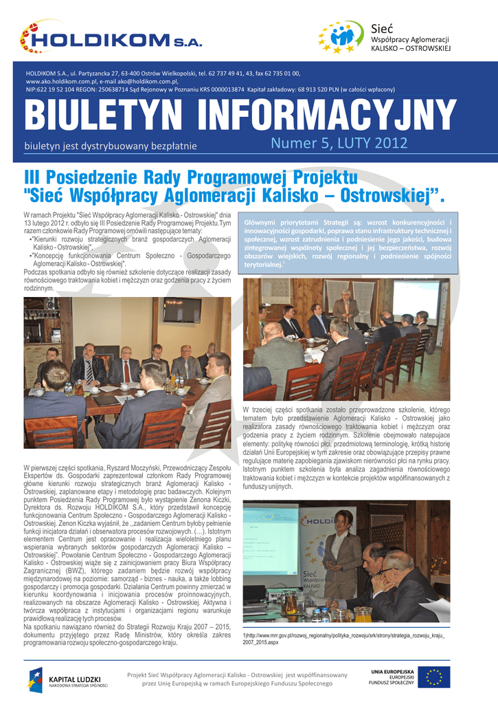 HOLDIKOM S.A., ul. Partyzancka 27, 63-400 Ostrów Wielkopolski, tel. 62 737 49 41, 43, fax 62 735 01 00, www.ako.holdikom.com.pl, e-mail [email protected], NIP:622 19 52 104 REGON: 250638714 Sąd Rejonowy w Poznaniu KRS 0000013874 Kapitał zakładowy: 68 913 520 PLN (w całości wpłacony) BIULETYN INFORMACYJNY Numer 5, LUTY 2012 biuletyn jest dystrybuowany bezpłatnie III Posiedzenie Rady Programowej Projektu "Sieć Współpracy Aglomeracji Kalisko – Ostrowskiej”. W ramach Projektu "Sieć Współpracy Aglomeracji Kalisko - Ostrowskiej" dnia 13 lutego 2012 r. odbyło się III Posiedzenie Rady Programowej Projektu.Tym razem członkowie Rady Programowej omówili następujące tematy: "Kierunki rozwoju strategicznych branż gospodarczych Aglomeracji Kalisko - Ostrowskiej", "Koncepcję funkcjonowania Centrum Społeczno - Gospodarczego Aglomeracji Kalisko - Ostrowskiej". Podczas spotkania odbyło się również szkolenie dotyczące realizacji zasady równościowego traktowania kobiet i mężczyzn oraz godzenia pracy z życiem rodzinnym. W pierwszej części spotkania, Ryszard Moczyński, Przewodniczący Zespołu Ekspertów ds. Gospodarki zaprezentował członkom Rady Programowej główne kierunki rozwoju strategicznych branż Aglomeracji Kalisko Ostrowskiej, zaplanowane etapy i metodologię prac badawczych. Kolejnym punktem Posiedzenia Rady Programowej było wystąpienie Zenona Kiczki, Dyrektora ds. Rozwoju HOLDIKOM S.A., który przedstawił koncepcję funkcjonowania Centrum Społeczno - Gospodarczego Aglomeracji Kalisko Ostrowskiej. Zenon Kiczka wyjaśnił, że ,,zadaniem Centrum byłoby pełnienie funkcji inicjatora działań i obserwatora procesów rozwojowych. (…). Istotnym elementem Centrum jest opracowanie i realizacja wieloletniego planu wspierania wybranych sektorów gospodarczych Aglomeracji Kalisko – Ostrowskiej”. Powołanie Centrum Społeczno - Gospodarczego Aglomeracji Kalisko - Ostrowskiej wiąże się z zainicjowaniem pracy Biura Współpracy Zagranicznej (BWZ), którego zadaniem będzie rozwój współpracy międzynarodowej na poziomie: samorząd - biznes - nauka, a także lobbing gospodarczy i promocja gospodarki. Działania Centrum powinny zmierzać w kierunku koordynowania i inicjowania procesów proinnowacyjnych, realizowanych na obszarze Aglomeracji Kalisko - Ostrowskiej. Aktywna i twórcza współpraca z instytucjami i organizacjami regionu warunkuje prawidłową realizację tych procesów. Na spotkaniu nawiązano również do Strategii Rozwoju Kraju 2007 – 2015, dokumentu przyjętego przez Radę Ministrów, który określa zakres programowania rozwoju społeczno-gospodarczego kraju. Głównymi priorytetami Strategii są: wzrost konkurencyjności i innowacyjności gospodarki, poprawa stanu infrastruktury technicznej i społecznej, wzrost zatrudnienia i podniesienie jego jakości, budowa zintegrowanej wspólnoty społecznej i jej bezpieczeństwa, rozwój obszarów wiejskich, rozwój regionalny i podniesienie spójności terytorialnej.1 W trzeciej części spotkania zostało przeprowadzone szkolenie, którego tematem było przedstawienie Aglomeracji Kalisko - Ostrowskiej jako realizatora zasady równościowego traktowania kobiet i mężczyzn oraz godzenia pracy z życiem rodzinnym. Szkolenie obejmowało natepujace elementy: politykę równości płci, przedmiotową terminologię, krótką historię działań Unii Europejskiej w tym zakresie oraz obowiązujące przepisy prawne regulujące materię zapobiegania zjawiskom nierówności płci na rynku pracy. Istotnym punktem szkolenia była analiza zagadnienia równościowego traktowania kobiet i mężczyzn w kontekcie projektów współfinansowanych z funduszy unijnych. 1)http://www.mrr.gov.pl/rozwoj_regionalny/polityka_rozwoju/srk/strony/strategia_rozwoju_kraju_ 2007_2015.aspx Projekt Sieć Współpracy Aglomeracji Kalisko - Ostrowskiej jest współfinansowany przez Unię Europejską w ramach Europejskiego Funduszu Społecznego BIULETYN INFORMACYJNY ,,Analiza subregionu kaliskiego pod kątem lokalizacji i funkcjonowania Centrum Zaawansowanych Technologii”. "Analiza subregionu kaliskiego pod kątem lokalizacji i funkcjonowania Centrum Zaawansowanych Technologii" jest wynikiem prac Ekspertów ze Stowarzyszenia Organizatorów Ośrodków Innowacji Przedsiębiorczości w Polsce.2 Aglomeracja Kalisko - Ostrowska, po części sąsiadująca i stanowiąca integralną część subregionu kaliskiego ,,ulega wpływom pozytywnego i innowacyjnego oddziaływania międzyregionalnego”.3 W związku z tym wyniki badań zebrane w w/w raporcie, mogą posłużyć jako materiał wyjściowy do zdefiniowania strategicznych branż rozwoju gospodarczego Aglomeracji Kalisko - Ostrowskiej. Opracowanie przedstawia pozytywne i negatywne uwarunkowania rozwoju potencjału proinnowacyjnego oraz potrzeby w zakresie wdrażania innowacji i nowych technologii Aglomeracji Kalisko Ostrowskiej. W lutowym wydaniu Biuletynu Informacyjnego przedstawiamy istotne elementy analizy na temat lokalizacji i funkcjonowania Centrum Zaawansowanych Technologii w subregionie kaliskim, ze szczególnym uwzględnieniem terenu Aglomeracji Kalisko - Ostrowskiej. Celem przeprowadzonej Analizy jest określenie możliwości uruchomienia regionalnego centrum zaawansowanych technologii o zasięgu oddziaływania na południowo-wschodnią Wielkopolskę. W pierwszej części przedstawiona jest geneza idei i założenia Centrum Zaawansowanych Technologii, charakterystyka społeczno-gospodarcza i potencjał innowacyjny. Dalsza część opracowania analizuje potrzeby regionalne w zakresie wdrażania innowacji i nowych technologii, misji, celów i zadań Centrum Zaawansowanych Technologii. Jednym z istotnych aspektów przedstawionych w opracowaniu jest perspektywa potencjalnych partnerów przedsięwzięcia, zasady możliwej współpracy, formy organizacyjno-prawnej, struktury organizacyjnej, modelu funkcjonowania i lokalizacji. Założono, że ,,centrum powinno być miejscem integr