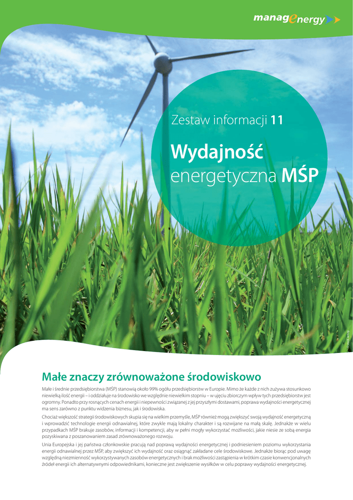Zestaw informacji 11 © stock.xchng Wydajność energetyczna MŚP Małe znaczy zrównoważone środowiskowo Małe i średnie przedsiębiorstwa (MŚP) stanowią około 99% ogółu przedsiębiorstw w Europie. Mimo że każde z nich zużywa stosunkowo niewielką ilość energii – i oddziałuje na środowisko we względnie niewielkim stopniu – w ujęciu zbiorczym wpływ tych przedsiębiorstw jest ogromny. Ponadto przy rosnących cenach energii i niepewności związanej z jej przyszłymi dostawami, poprawa wydajności energetycznej ma sens zarówno z punktu widzenia biznesu, jak i środowiska. Chociaż większość strategii środowiskowych skupia się na wielkim przemyśle, MŚP również mogą zwiększyć swoją wydajność energetyczną i wprowadzić technologie energii odnawialnej, które zwykle mają lokalny charakter i są rozwijane na małą skalę. Jednakże w wielu przypadkach MŚP brakuje zasobów, informacji i kompetencji, aby w pełni mogły wykorzystać możliwości, jakie niesie ze sobą energia pozyskiwana z poszanowaniem zasad zrównoważonego rozwoju. Unia Europejska i jej państwa członkowskie pracują nad poprawą wydajności energetycznej i podniesieniem poziomu wykorzystania energii odnawialnej przez MŚP, aby zwiększyć ich wydajność oraz osiągnąć zakładane cele środowiskowe. Jednakże biorąc pod uwagę względną niezmienność wykorzystywanych zasobów energetycznych i brak możliwości zastąpienia w krótkim czasie konwencjonalnych źródeł energii ich alternatywnymi odpowiednikami, konieczne jest zwiększenie wysiłków w celu poprawy wydajności energetycznej. Wyzwanie energetyczne dla MŚP Podczas gdy ceny energii pochodzącej z konwencjonalnych źródeł rosną w zawrotnym tempie, a kwestia zmian klimatycznych nabiera najwyższej wagi, energia staje się poważnym problemem dla MŚP, zarówno ze względów ekonomicznych, jak i środowiskowych. Dodatkowo wydajność energetyczna coraz częściej stanowi kryterium wyboru przy zawieraniu umów z instytucjami publicznymi i dużymi korporacjami. © stock.xchng Korporacje mogą pozwolić sobie na sfinansowanie audytów w zakresie zrównoważonego rozwoju i opłacenie konsultantów doradzających w wyborze metod optymalizacji zużycia energii, natomiast MŚP często nie posiadają wystarczających środków do podjęcia takich działań. W rzeczywistości wiele mniejszych firm nie jest świadomych możliwości zmniejszenia poboru energii – i wysokości rachunków za jej zużycie – poprzez redukcję tzw. śladu węglowego. doradców w zakresie inteligentnej energii, działających przy izbach przemysłowo-handlowych i poprzez tworzenie lub rozszerzanie konkretnej oferty pomocy udzielanej przedsiębiorstwom. Aby małe i średnie przedsiębiorstwa mogły przeprowadzić działania adaptacyjne, muszą zapoznać się z najnowszymi technologiami, zwiększającymi wydajność energetyczną i poznać inne metody obniżania zużycia energii. Dodatkowo konieczne jest szkolenie i dostęp do fachowej wiedzy. Około 60 pracowników izb przemysłowo-handlowych z 12 państw członkowskich UE weźmie udział w szkoleniu i wymieni doświadczenia w celu uzyskania podstawowej wiedzy na temat wydajności energetycznej oraz opłacalnego stosowania energii ze źródeł odnawialnych, przy założeniu, że przedsiębiorstwa będą w stanie zwiększyć oszczędności energii o 10-20% poprzez zastosowanie działań niepociągających za sobą żadnych lub tylko minimalne koszty. Właśnie te zagadnienia są założeniami projektu Change, finansowanego ze środków programu „Inteligentna Energia – Europa”. Celem tego projektu, koordynowanego przez Eurochambres – Stowarzyszenie Europejskich Izb Przemysłowo-Handlowych – jest wsparcie MŚP w optymalizacji zużycia energii poprzez rozwój europejskiej sieci Więcej informacji: http://www.eurochambres.eu/Content/Default. asp?pageid=232 Inteligentne zarządzanie energią w MŚP MŚP mogą podjąć szereg działań w celu zredukowania ilości gazów cieplarnianych, które emitują. Działania te mogą przybierać rozmaite formy – od wyłączania światła w pomieszczeniach, kiedy pracownik je opuszcza lub zakupu bardziej wydajnego energetycznie sprzętu biurowego do ustanowienia planów zrównoważonej komunikacji dla pracowników. Wspieranie inteligentnych zachowań nastawionych na redukcję zużycia energii w firmie może przynieść znaczną oszczędność energii i obniżenie emisji, często bardzo małym kosztem. Sprzęt biurowy, np. komputery i drukarki, powinien być efektywnie wykorzystywany i wyłączany na noc. Warto dodać, że klimatyzatory zużywają duże ilości energii. W lecie firma mogłaby ustawić klimatyzację na wyższą temperaturę, i zezwolić na mniej oficjalny ubiór. Zmniejszanie emisji powinno objąć również działania pracowników poza murami firmy. Przedsiębiorstwo może podjąć decyzję o stworzeniu przez pracodawcę planu na rzecz mobilności, którego celem będzie zmniejszenie oddziaływania, jakie wywiera transport firmowy na środowisko i zmiana zachowań związanych z przemieszczaniem się pracowników, dostawców, gości i klientów. Strategia ta polega na zachęcaniu do wykorzystywania przez pracowników, a czasami gości, możliwości podróżowania innych niż samochód, takich jak transport publiczny, chodzenie piechotą, jazda na rowerze lub telepraca. Inne przykłady to: wspólne użytkowanie samochodu i dzielenie się miejscem w samochodzie przez pracowników. Kroki podjęte w danym przedsiębiorstwie muszą odpowiadać firmie i jej pracownikom. Na przykład zachęcanie pracowników do dojeżdżania do pracy na rowerze jest nierealistyczne, jeżeli wszyscy zatrudnieni mieszkają w dużej odległości od firmy. © flickr Konkretne przykłady planów mobilności można znaleźć na stronie: http://www.eltis.org/cs_search.phtml?search_start=1&concept_ id=14 Promowanie odpowiedzialnego użytkowania energii w biurze jest nie ty