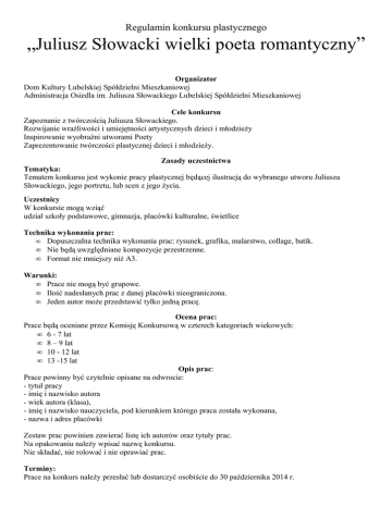Regulamin konkursu plastycznego „Juliusz Słowacki wielki poeta romantyczny” Organizator Dom Kultury Lubelskiej Spółdzielni Mieszkaniowej Administracja Osiedla im. Juliusza Słowackiego Lubelskiej Spółdzielni Mieszkaniowej Cele konkursu Zapoznanie z twórczością Juliusza Słowackiego. Rozwijanie wrażliwości i umiejętności artystycznych dzieci i młodzieży Inspirowanie wyobraźni utworami Poety Zaprezentowanie twórczości plastycznej dzieci i młodzieży. Zasady uczestnictwa Tematyka: Tematem konkursu jest wykonie pracy plastycznej będącej ilustracją do wybranego utworu Juliusza Słowackiego, jego portretu, lub scen z jego życia. Uczestnicy W konkursie mogą wziąć udział szkoły podstawowe, gimnazja, placówki kulturalne, świetlice Technika wykonania prac: • Dopuszczalna technika wykonania prac: rysunek, grafika, malarstwo, collage, batik. • Nie będą uwzględniane kompozycje przestrzenne. • Format nie mniejszy niż A3. Warunki: • Prace nie mogą być grupowe. • Ilość nadesłanych prac z danej placówki nieograniczona. • Jeden autor może przedstawić tylko jedną pracę. Ocena prac: Prace będą oceniane przez Komisję Konkursową w czterech kategoriach wiekowych: • 6 - 7 lat • 8 – 9 lat • 10 - 12 lat • 13 -15 lat Opis prac: Prace powinny być czytelnie opisane na odwrocie: - tytuł pracy - imię i nazwisko autora - wiek autora (klasa), - imię i nazwisko nauczyciela, pod kierunkiem którego praca została wykonana, - nazwa i adres placówki Zestaw prac powinien zawierać listę ich autorów oraz tytuły prac. Na opakowaniu należy wpisać nazwę konkursu. Nie składać, nie rolować i nie oprawiać prac. Terminy: Prace na konkurs należy przesłać lub dostarczyć osobiście do 30 października 2014 r. Ocena prac nastąpi do 15 listopada 2014 r. Ogłoszenie zwycięzców nastąpi do końca listopada 2014 r. Wyniki konkursu zostaną ogłoszone na stronie internetowej Domu Kultury LSM www.domkulturylsm.pl Wręczenie nagród odbędzie się podczas wernisażu wystawy pokonkursowej w domu Kultury Lubelskiej Spółdzielni Mieszkaniowej ul. K. Wallenroda 4a w Lublinie Uwagi końcowe Organizator nie przewiduje zwrotu nadesłanych prac Organizator zastrzega sobie prawo publikowania i reprodukowania prac konkursowych bez wypłacania honorariów autorskich Prace nagrodzone i zakwalifikowane do wystawy stanowią własność organizatora i nie będą zwracane. Udział w konkursie jest jednoznaczny z udzieleniem prawa do nieodpłatnego wykorzystywania prac dla promocji konkursu w następujących polach eksploatacji: druku w dowolnej liczbie publikacji i w dowolnym nakładzie, używania ich w internecie oraz w innych formach utrwaleń nadających się do rozpowszechniania. Udział w konkursie jest równoznaczny z wyrażeniem przez osoby uczestniczące zgody na przetwarzanie przez organizatora ich danych osobowych na potrzeby konkursu. Adres placówki: Dom Kultury LSM ul. K. Wallenroda 4a 20-607 Lublin z dopiskiem „Juliusz Słowacki wielki poeta romantyczny” – konkurs plastyczny Prowadząca: Monika Sierzpowska Szczegółowych informacji udzielamy pod numerem 81-743-48-29