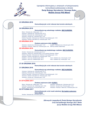 Uprzejmie informujemy o zmianach w funkcjonowaniu komunikacji autobusowej w okresie Świąt Bożego Narodzenia i Nowego Roku. Mobilis Group PKS Mława 23 GRUDNIA 2016 Komunikacja jak w dni robocze bez kursów szkolnych, 24 GRUDNIA 2016 Komunikacja wg sobotniego rozkładu, BEZ KURSÓW: Mława - Warszawa odj. z Mławy godz. 15.15 Warszawa - Kołobrzeg odj. z Warszawy godz. 20.15 Kołobrzeg - Warszawa odj. z Kołobrzegu godz. 19.00 Warszawa - Wrocław odj. z Warszawy godz. 12.00 Piotrków Trybunalski - Warszawa odj. z Piotrkowa Trybunalskiego godz. 13.30 Warszawa - Piotrków Trybunalski odj. z Warszawy godz. 18.00 25 GRUDNIA 2016 Zostaną wykonane tylko KURSY: Warszawa - Szczytno odj. z Warszawy godz. 14.45 Szczytno - Warszawa odj. ze Szczytna godz. 05.00 Warszawa - Przasnysz - Mława odj. z Warszawy godz. 9.45 MKM wg rozkładu świątecznego 26 GRUDNIA 2016 Komunikacja wg niedzielnego rozkładu, BEZ KURSÓW: Wrocław - Warszawa odj. z Wrocławia godz. 05.15 Warszawa - Olsztyn odj. z Warszawy godz. 6.15 /na odcinku Warszawa - Mława/ Piotrków Trybunalski - Warszawa odj. z Piotrkowa Trybunalskiego godz. 13.30 Warszawa - Piotrków Trybunalski odj. z Warszawy godz. 18.00 Działdowo - Toruń odj. z Działdowa godz. 08.00 Toruń - Działdowo odj. z Torunia godz. 14.30 Działdowo - Płock odj. z Działdowa godz. 08.15 Płock - Działdowo odj. z Płocka godz. 14.00 27-30 GRUDNIA 2016 Komunikacja jak w dni robocze bez kursów szkolnych 31 GRUDNIA 2016 Komunikacja wg sobotniego rozkładu, BEZ KURSÓW: Warszawa - Kołobrzeg odj. z Warszawy godz. 20.15 Kołobrzeg - Warszawa odj. z Kołobrzegu godz. 19.00 Piotrków Trybunalski - Warszawa odj. z Piotrkowa Trybunalskiego godz. 13.30 Warszawa - Piotrków Trybunalski odj. z Warszawy godz. 18.00 Warszawa - Wrocław odj. z Warszawy godz. 12.00 01 STYCZNIA 2017 Zostaną wykonane tylko KURSY: Mława - Warszawa odj. z Mławy godz. 15.15 Warszawa - Kołobrzeg odj. z Warszawy godz. 20.15 Kołobrzeg - Warszawa odj. z Kołobrzegu godz. 19.00 Warszawa - Szczytno odj. z Warszawy godz. 14.45 Szczytno - Warszawa odj. ze Szczytna godz. 5.00 Warszawa - Przasnysz - Mława odj. z Warszawy godz. 9.45 02 STYCZNIA 2017 Komunikacja jak Świąt w dni nauki szkolnej. Nie będzie wykonany Zdrowych i pogodnych Bożego Narodzenia kurs relacji: Wrocław - Warszawa odj. z Wrocławia godz. 5.15 Zdrowych i pogodnych Świąt Bożego Narodzenia oraz Szczęśliwego Nowego 2017 Roku życzy Mobilis Group PKS Mława