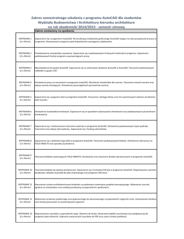 Zakres semestralnego szkolenia z programu AutoCAD dla studentów Wydziału Budownictwa i Architektury kierunku architektura na rok akademicki 2014/2015 - semestr zimowy Zakres omówiony na spotkaniu SPOTKANIE 1 (2 x 45min) Zapoznanie się z programem AutoCAD. Personalizacja środowiska graficznego AutoCAD mająca na celu przyspieszenie pracy w programie. Dostosowanie programu pod indywidualne wymagania użytkownika. SPOTKANIE 2 (2 x 45min) Przedstawienie standardów rysowania. Zapoznanie się z podstawowymi funkcjami kreślarskimi programu. Zapoznanie podstawowych funkcji programu usprawniających pracę. SPOTKANIE 3 (2 x 45min) Wprowadzenie do języka AutoLISP. Zapoznanie się ze schematem działania AutoLISP w AutoCAD. Tworzenie podstawowych nakładek w języku LISP. SPOTKANIE 4 (2 x 45min) Omówienie pracy na warstwach w programie AutoCAD. Określenie standardów dla warstw. Tworzenie nowych warstw oraz edycja warstw istniejących. Omówienie poszczególnych parametrów warstw. SPOTKANIE 5 (2 x 45min) Zapoznanie się z pojęciem skali w programie AutoCAD. Tworzenie i obsługa tekstu oraz lini wymiarowych zależnie od lokalnej skali rysunku. SPOTKANIE 6 (2 x 45min) Omówienie standardów kreskowań. Zapoznanie się ze sposobem wykonywania kreskowań oraz podstawowymi parametrami kreskowania. SPOTKANIE 7 (2 x 45min) Zapoznanie się z możliwościami tworzenia wydruku w programie AutoCAD. Omówienie podstawowych opcji wydruku. Tworzenie oraz edycja styli wydruku. Zapoznanie się z funkcją odnośników. SPOTKANIE 8 (2 x 45min) Zapoznanie się z obiektami typu blok w programie AutoCAD. Tworzenie podstawowych bloków. Omówienie zalet pracy na FIELD OBJECTS oraz sposobu jej działania. SPOTKANIE 9 (2 x 45min) Tworzenie bloków zawierających FIELD OBJECTS. Omówienie oraz tworzenie bloków dynamicznych w programie AutoCAD. SPOTKANIE 10 (2 x 45min) Tworzenie bloków do opisów pomieszczeń. Zapoznanie się z funkcjami filtracji w programie AutoCAD. Eksportowanie wartości atrybutów z bloków AutoCAD do pliku tekstowego oraz programu MS Excel. SPOTKANIE 11 (2 x 45min) Stworzenie rzutów architektonicznych budynku na podstawie rozwinięcia projektu koncepcyjnego. Wykonanie rysunku zgodnie ze standardami oraz wiedzą przekazaną na poprzednich spotkaniach. SPOTKANIE 12 (2 x 45min) Wykonanie przekroju podłużnego oraz poprzecznego do opracowanego na poprzednich zajęciach rzutu. Zastosowanie bloków oraz funkcji poznanych na wcześniejszych zajęciach. SPOTKANIE 13 (2 x 45min) Dopracowanie rysunków z poprzednich zajęć. Ułożenie do druku. Stworzenie tabelki rysunkowej oraz podpięcie jej do programu jako odnośnik. Zapisanie stworzonych rysunków do PDF przy użyciu funkcji publikacji.